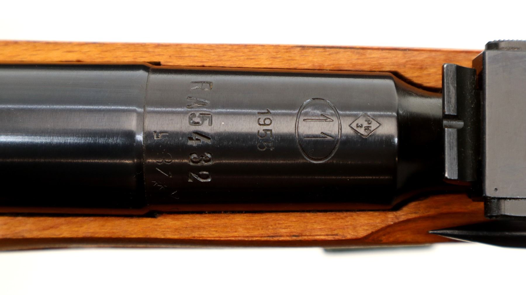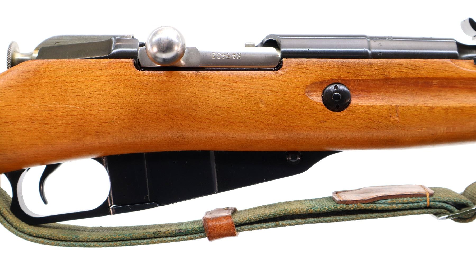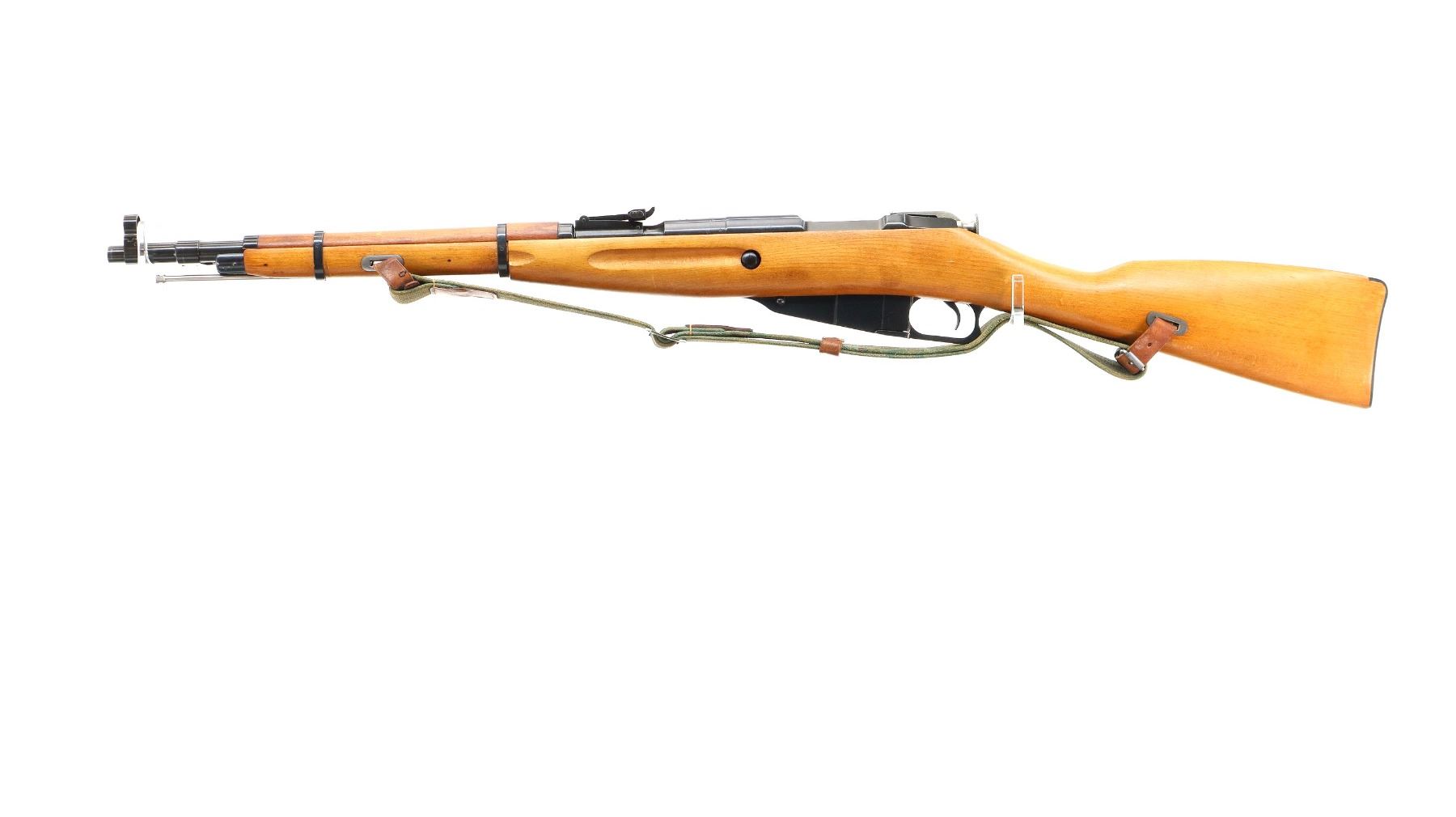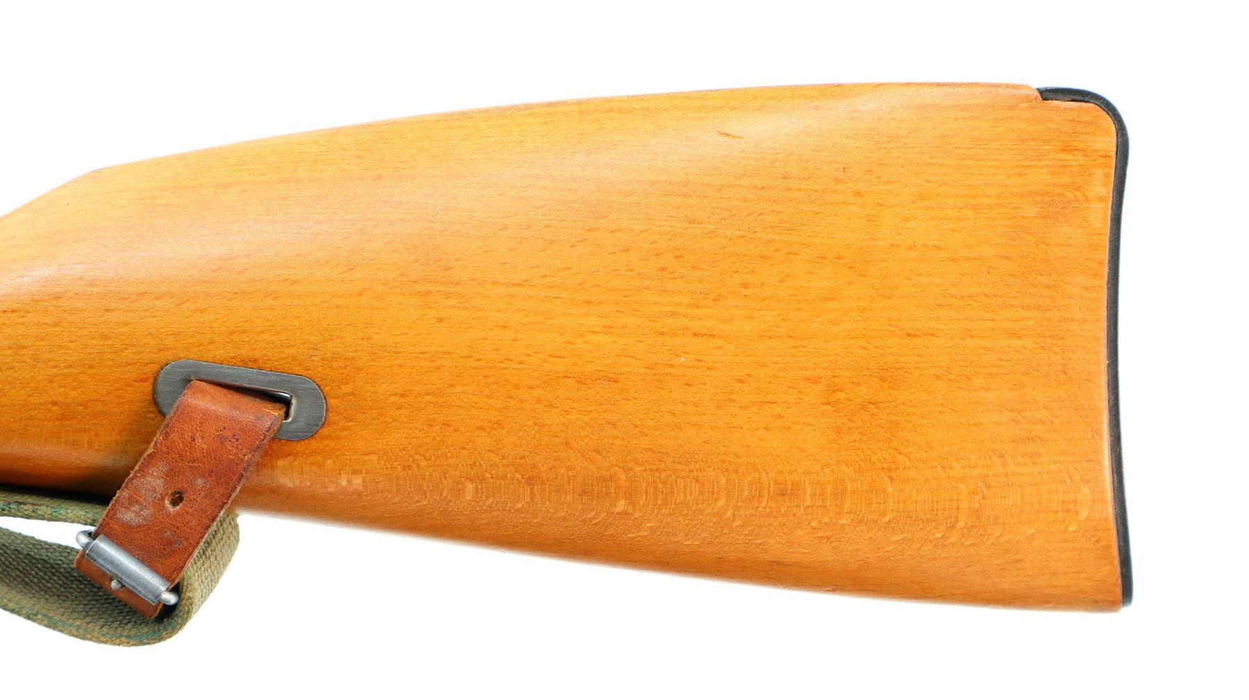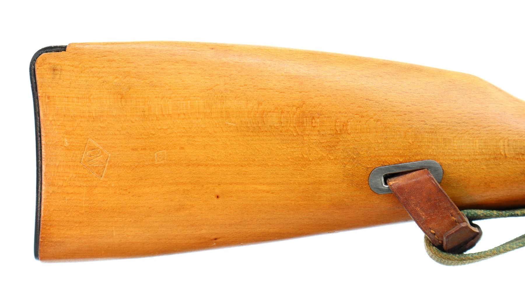 Main Description: Manufactured by Factory 11, 1955, visible serial numbers match. Post front sight with hood and ramp, adjustable u notched rear sight, blued finish, round receiver, silver bolt with straight handle. Two piece full military wood stocks, finger grooved forearm, straight grip, smooth steel butt plate, sling slots with brown leather and green canvas military sling, cleaning rod, attached folding cruciform bayonet.