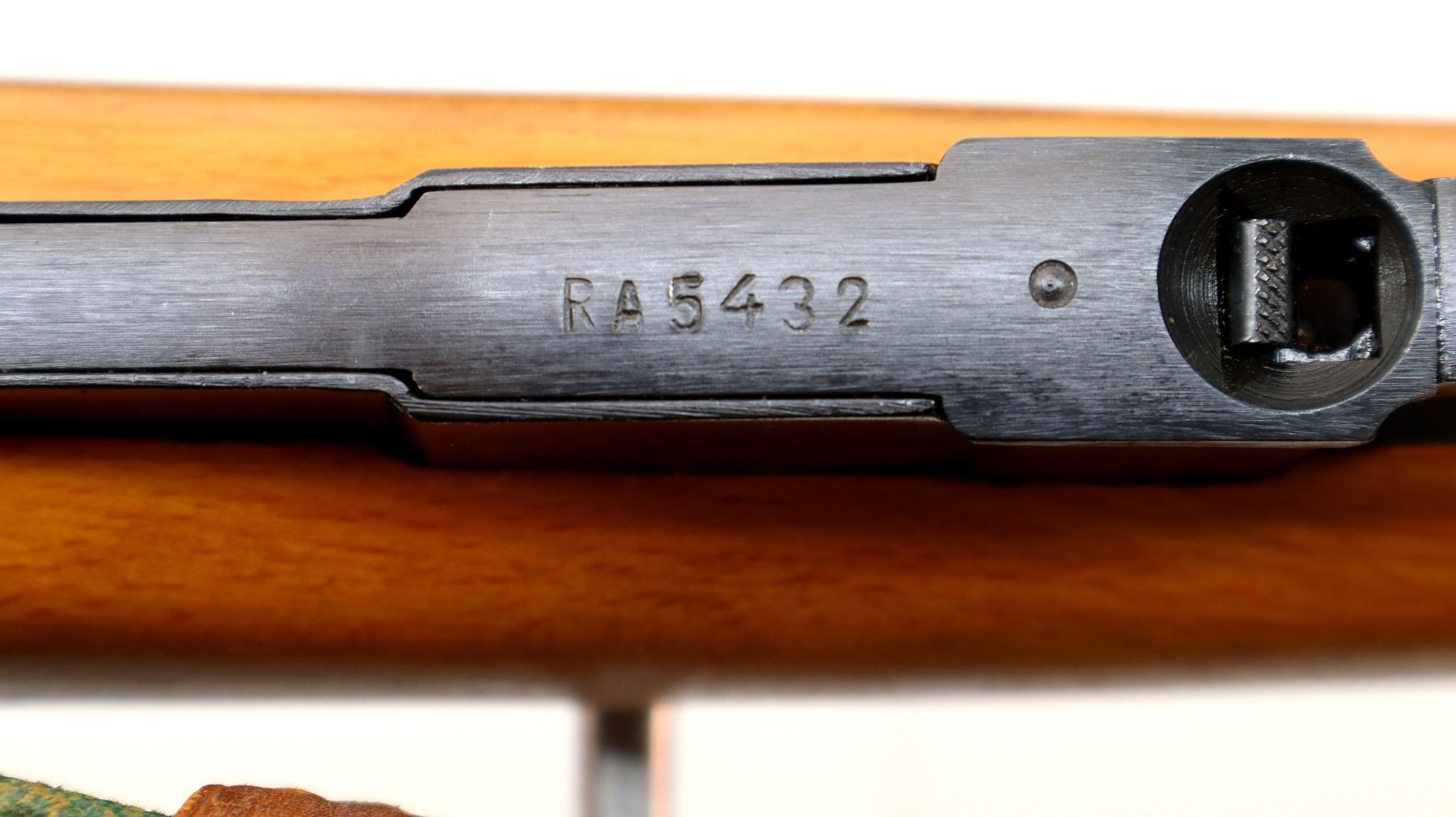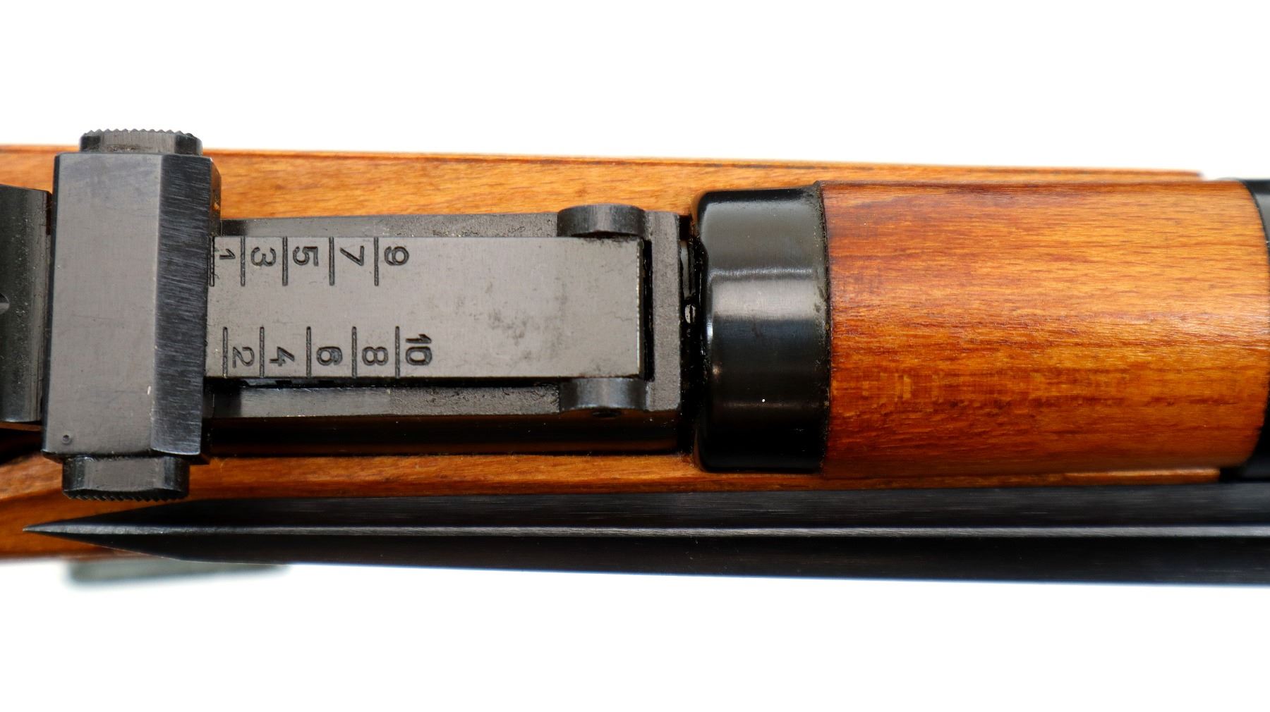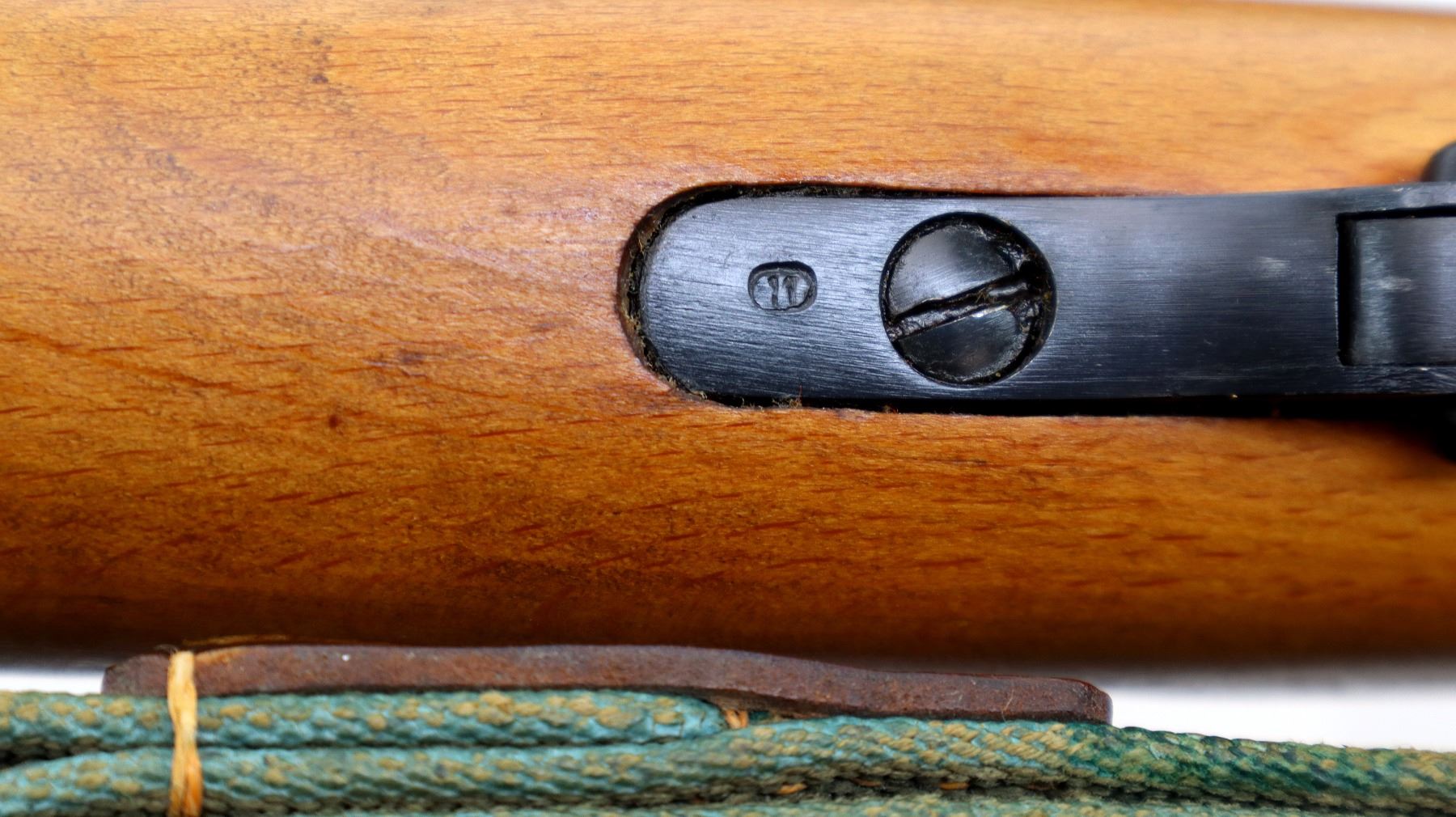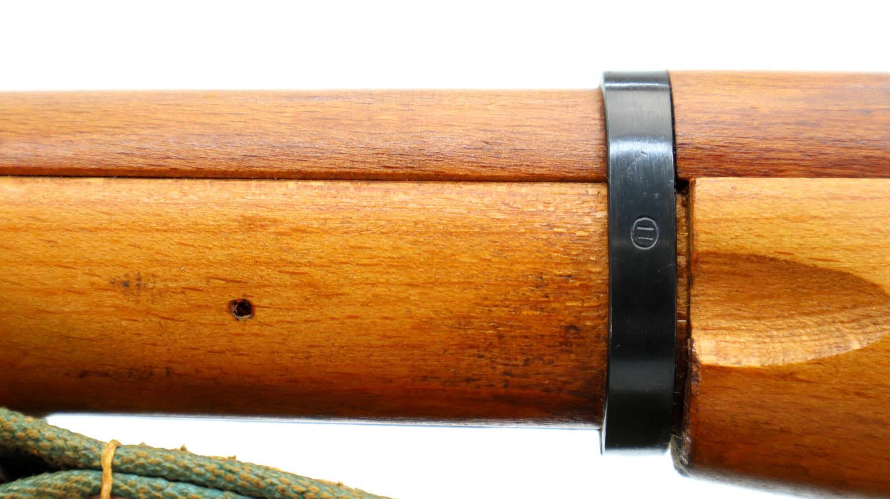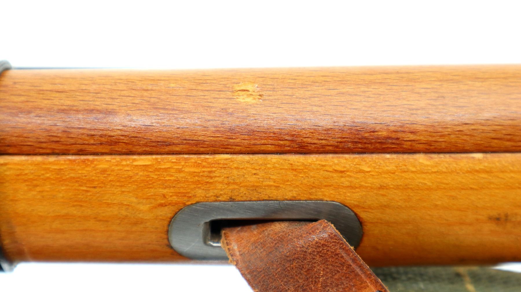 Main Description: Manufactured by Factory 11, 1955, visible serial numbers match. Post front sight with hood and ramp, adjustable u notched rear sight, blued finish, round receiver, silver bolt with straight handle. Two piece full military wood stocks, finger grooved forearm, straight grip, smooth steel butt plate, sling slots with brown leather and green canvas military sling, cleaning rod, attached folding cruciform bayonet.