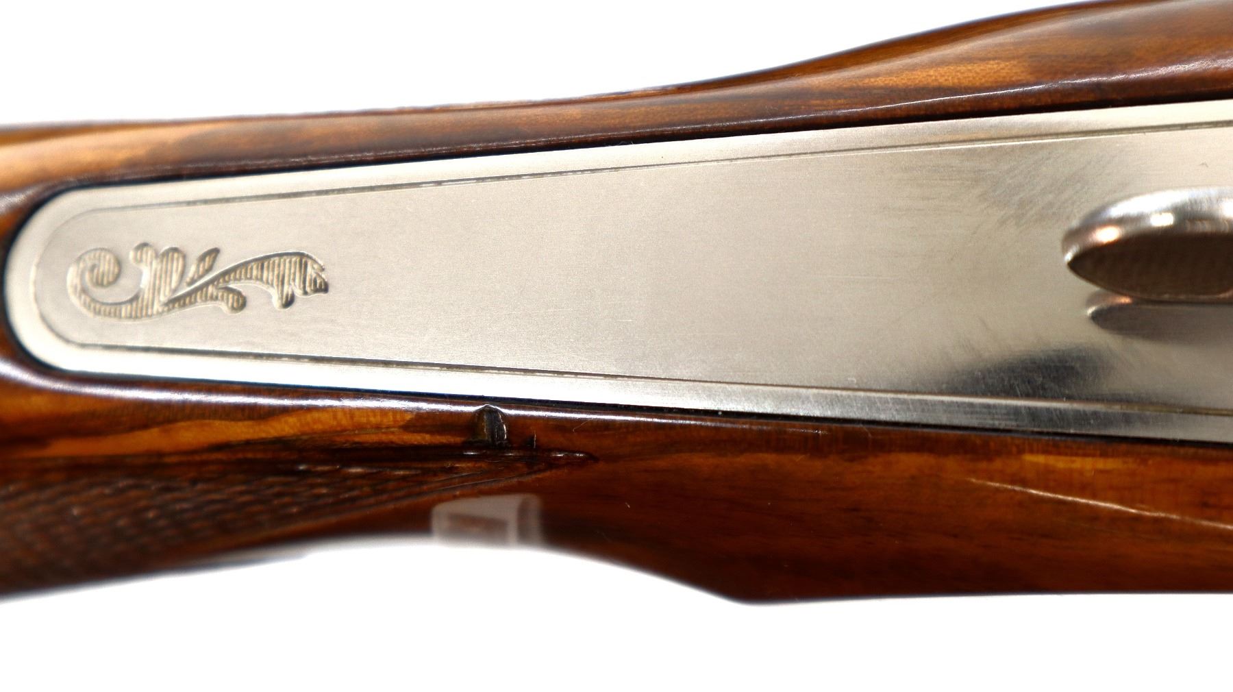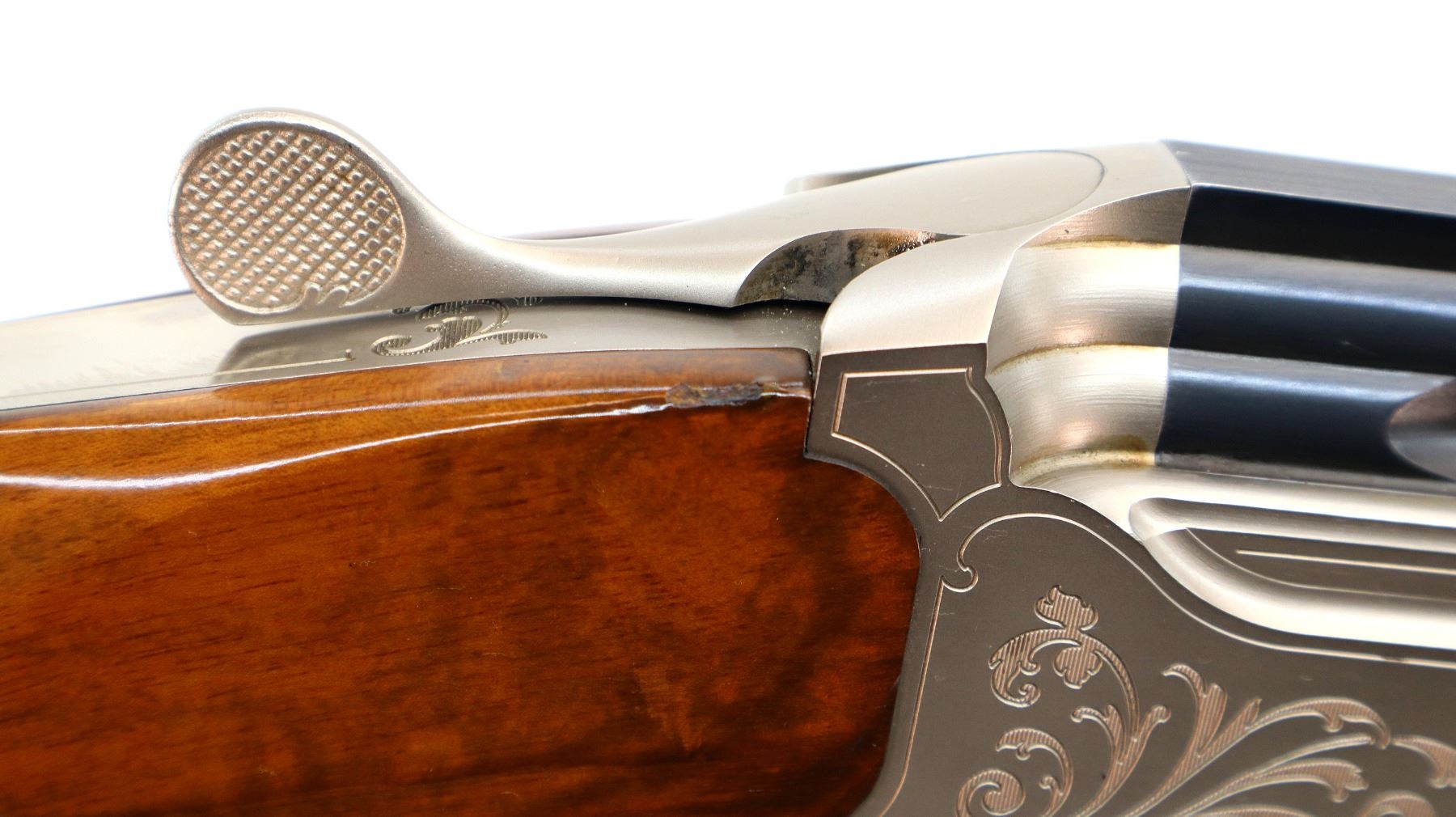 Main Description: Adjustable red fiber optic front bead, brass mid rib bead, polish blued barrel with raised high rib, engraved silver receiver, ejector, smooth adjustable silver trigger. Two piece gloss finish wood stocks, checkered forearm and pistol grip with ambi palm swells, adjustable comb, recoil reducing black rubber recoil pad. Accessories include: Spare Mod (1+), Mod (2), Full (4) with wrench and case, adjustable comb spacers, two different thickness recoil pads, snap cap, tools, firing pins and springs