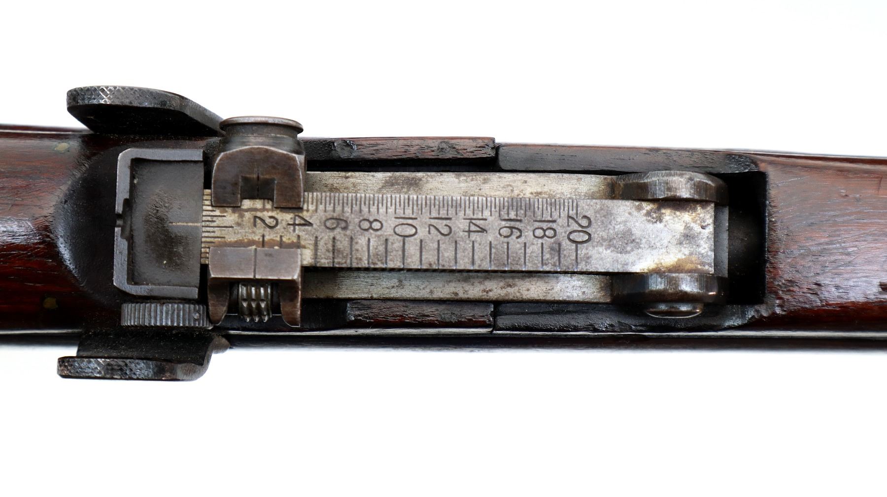 Main Description: Manufactured by BSA, bolt matches forearm does not. Blade front sight with ears and ramp, adjustable u notched rear sight with ears, blued finish, magazine cut off, bolt head catch spring is loose requires adjustment. Four piece full military wood stocks, front handguard is cracked with an additional steel band on top of it, rear of forearm has two accurizing screws, pistol grip, smooth brass butt plate with trap, steel stock disk, three sling swivels, bayonet lug, unnumbered nose cap.