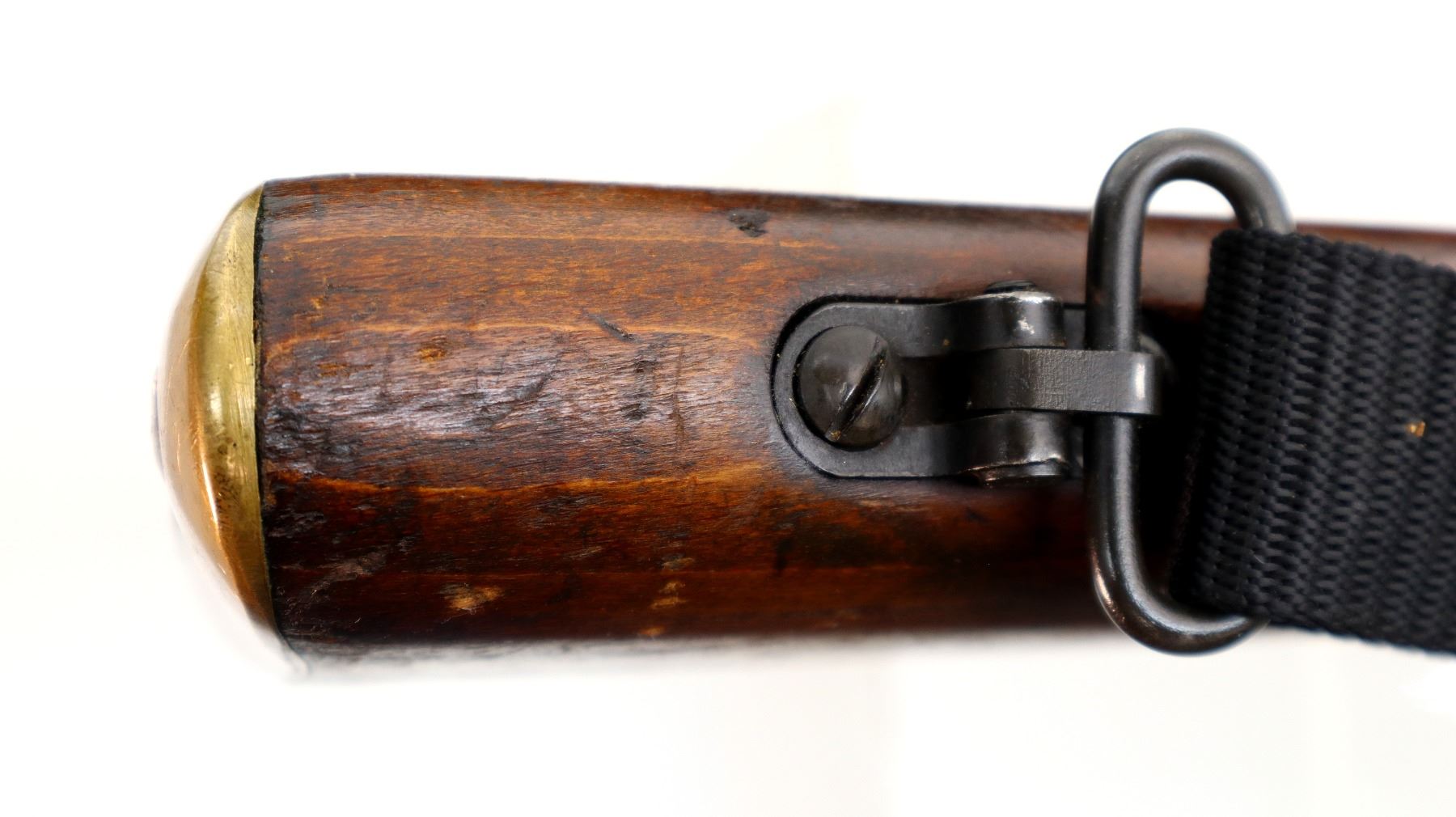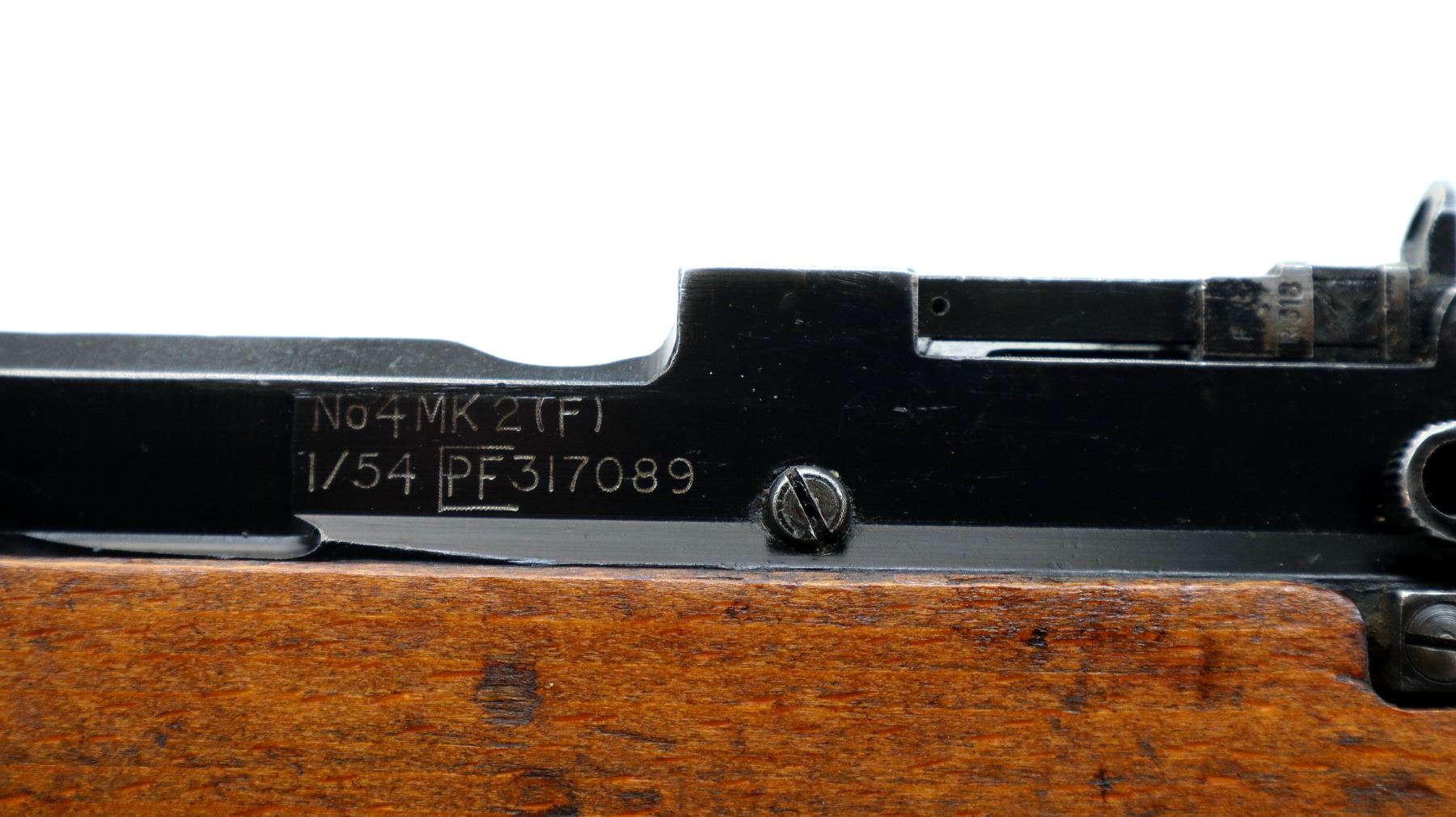 Main Description: Manufactured by Fazakerley 1/54, visible serial numbers match. Blade front sight with ears and ramp, adjustable milled rear peep sight, black painted metal finish. Four piece full military wood stocks, pistol grip, smooth brass butt plate with trap, sling swivels with black nylon sling, bayonet lugs.