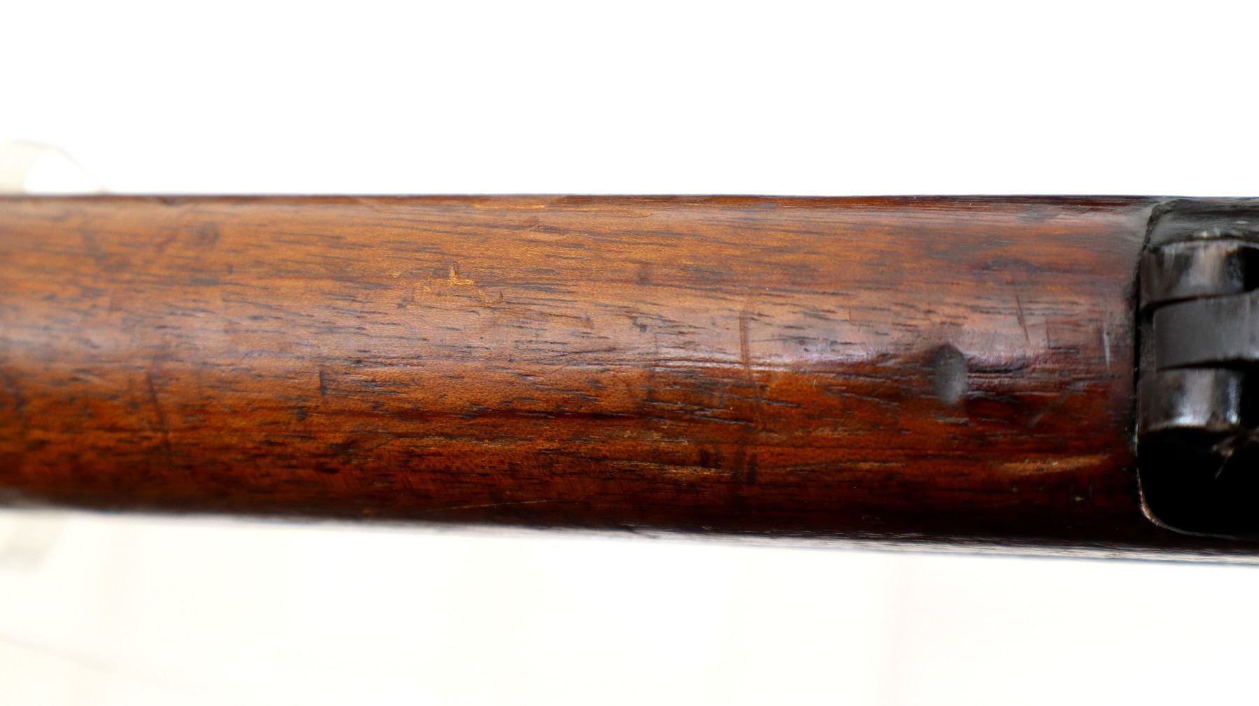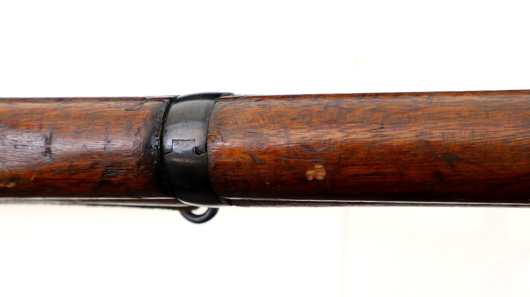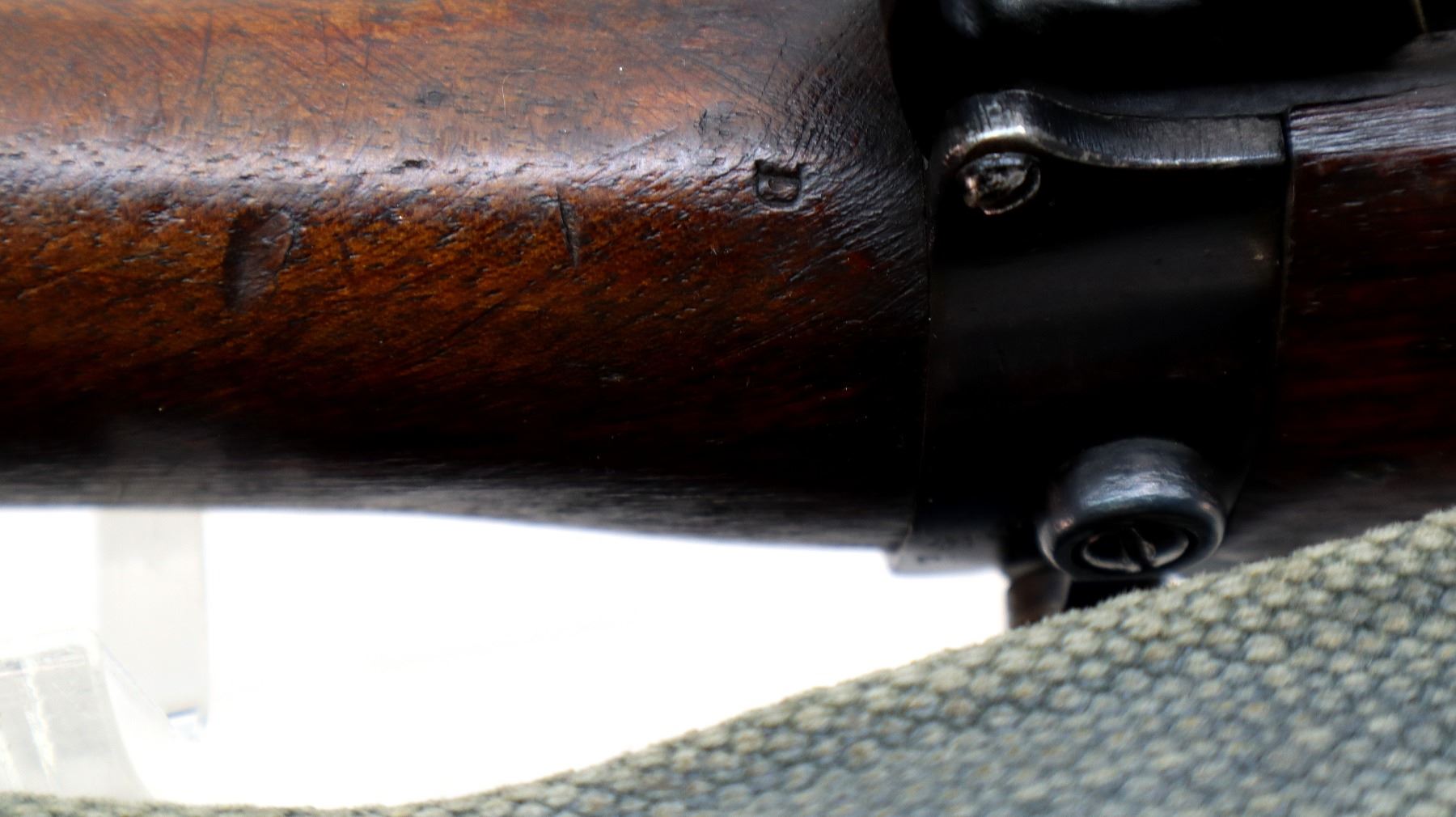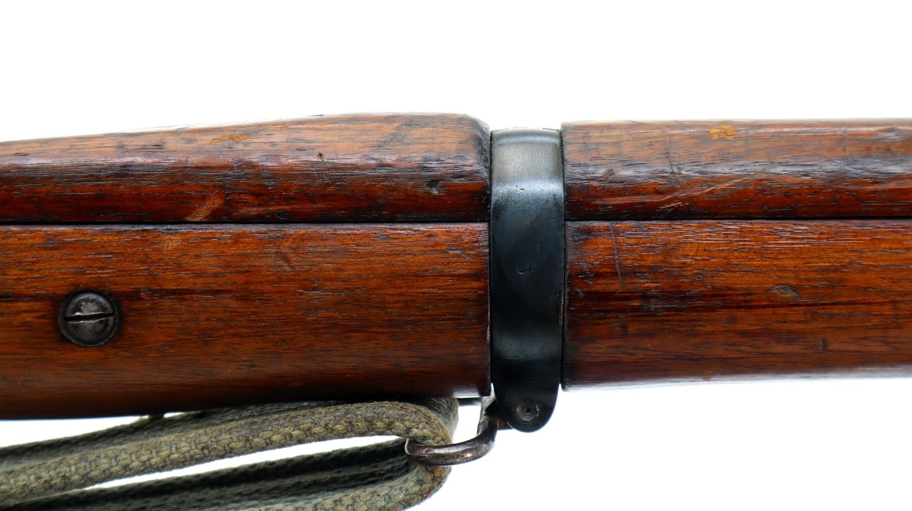 Main Description: Originally manufactured by Enfield 1909, rebuilt by BSA. Blade front sight with ears and ramp, adjustable u notched rear sight with ears, blued metal finish, receiver and butt stock have C-Broad arrows on them indicating Canadian Military issue, Receiver has a 10A target rear sight with C-Broad arrow 1910 Ross folding u notched rear sight with proper HWC in an oval, note mounting screw is incorrect. Magazine is a soldered in proper plate, left side marked .22. Four piece full military wood stocks, front handguard cracked and repaired, forearm retains volley sight plate, pistol grip, smooth brass butt plate with trap, unmarked brass stock disk, sling swivels with grey/blue P37 canvas web sling, stacking swivel, bayonet lug.