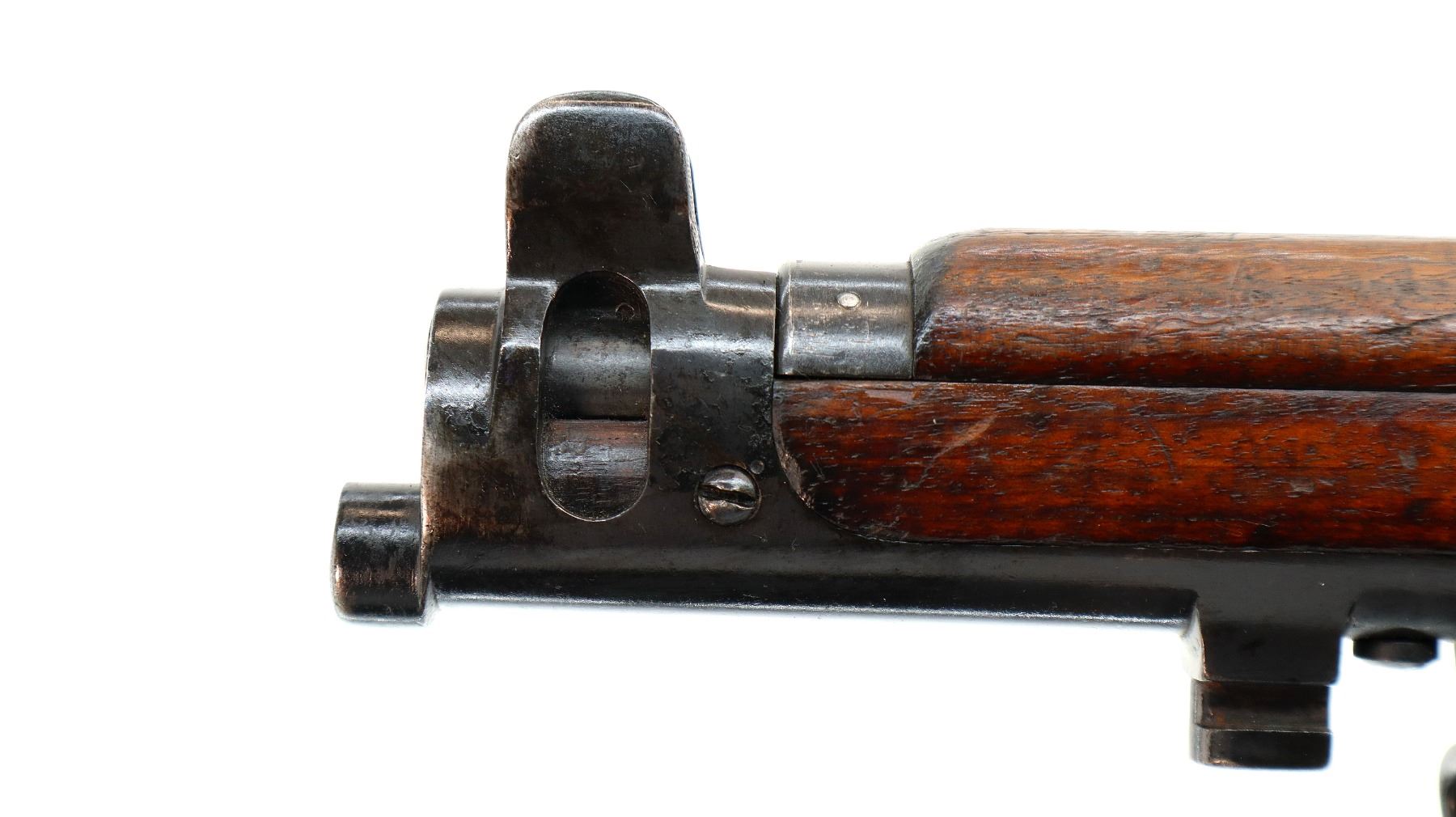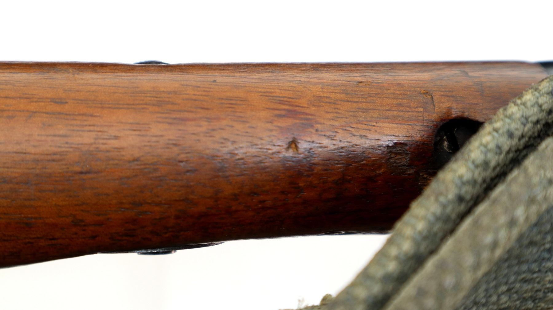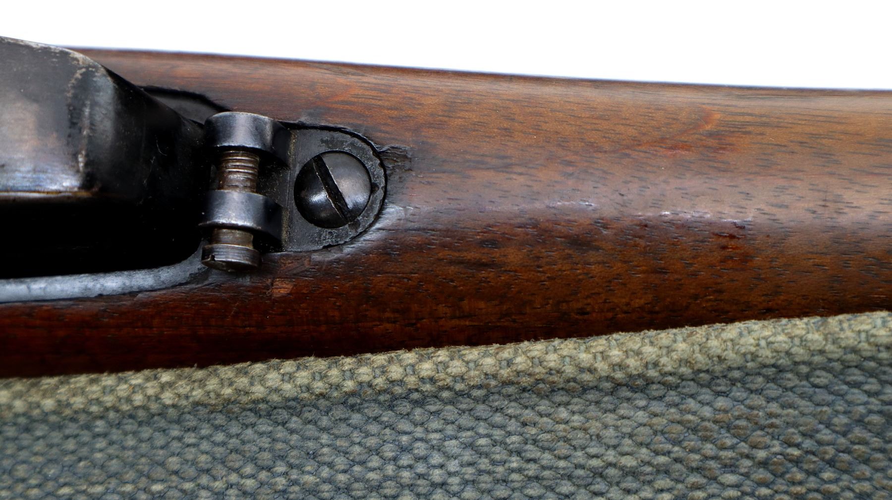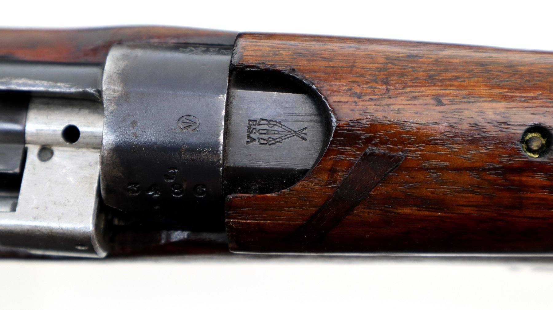 Main Description: Originally manufactured by Enfield 1909, rebuilt by BSA. Blade front sight with ears and ramp, adjustable u notched rear sight with ears, blued metal finish, receiver and butt stock have C-Broad arrows on them indicating Canadian Military issue, Receiver has a 10A target rear sight with C-Broad arrow 1910 Ross folding u notched rear sight with proper HWC in an oval, note mounting screw is incorrect. Magazine is a soldered in proper plate, left side marked .22. Four piece full military wood stocks, front handguard cracked and repaired, forearm retains volley sight plate, pistol grip, smooth brass butt plate with trap, unmarked brass stock disk, sling swivels with grey/blue P37 canvas web sling, stacking swivel, bayonet lug.
