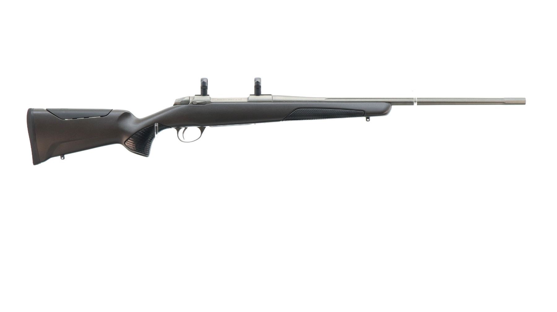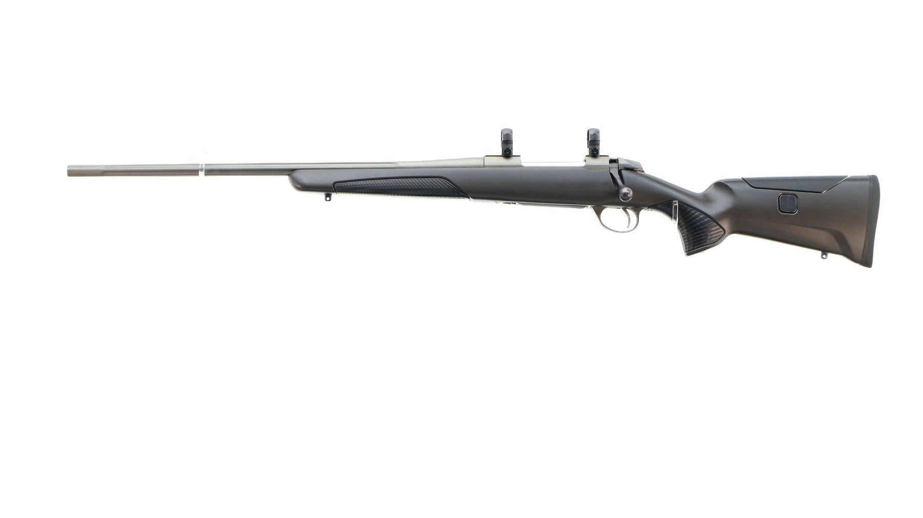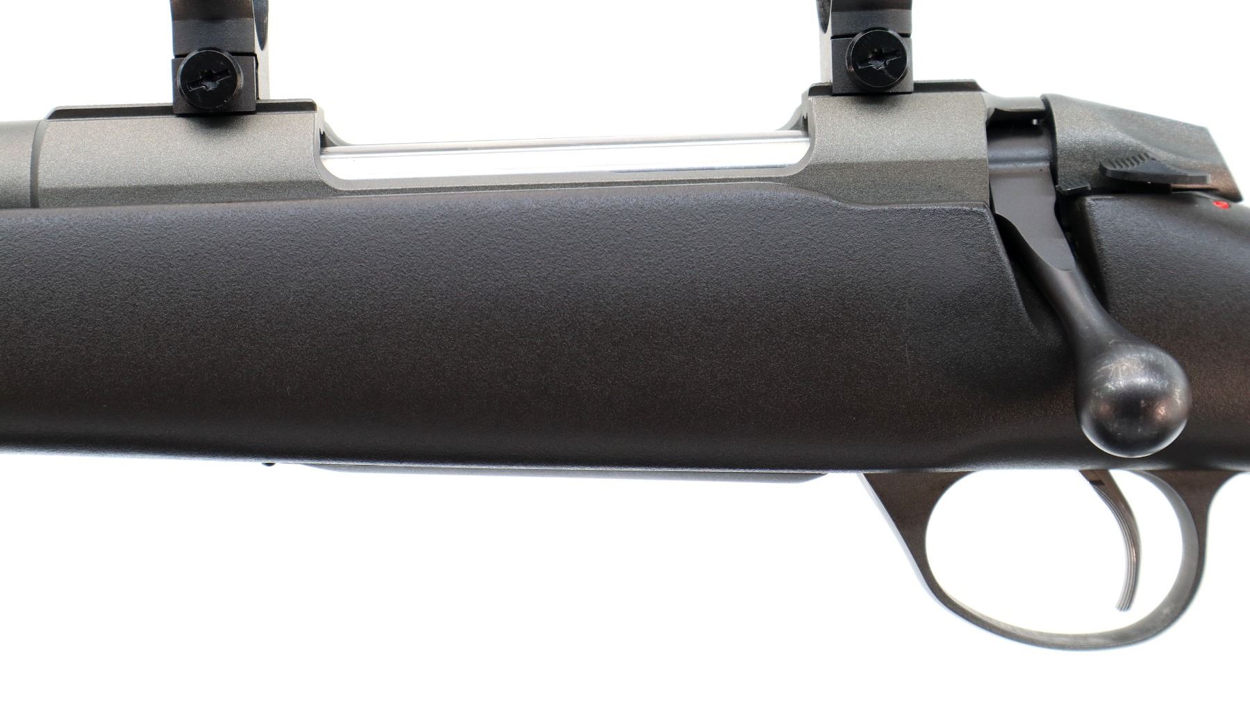 Main Description: No sights, Satin grey metal finish, fluted barrel, receiver has integral scope bases and two piece Leupold 1" rings installed, left hand ejection port, smooth bolt knob. One piece grey fiberglass stock, textured black rubber forearm and pistol grip panels, adjustable comb, black rubber recoil pad, grip cap, swivel studs.