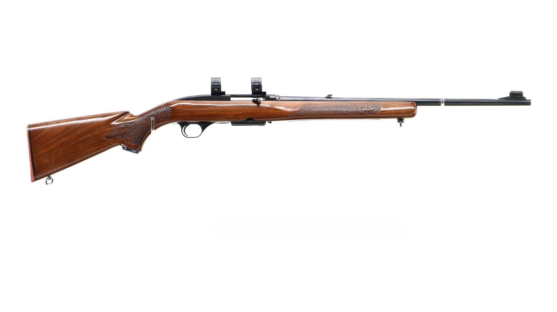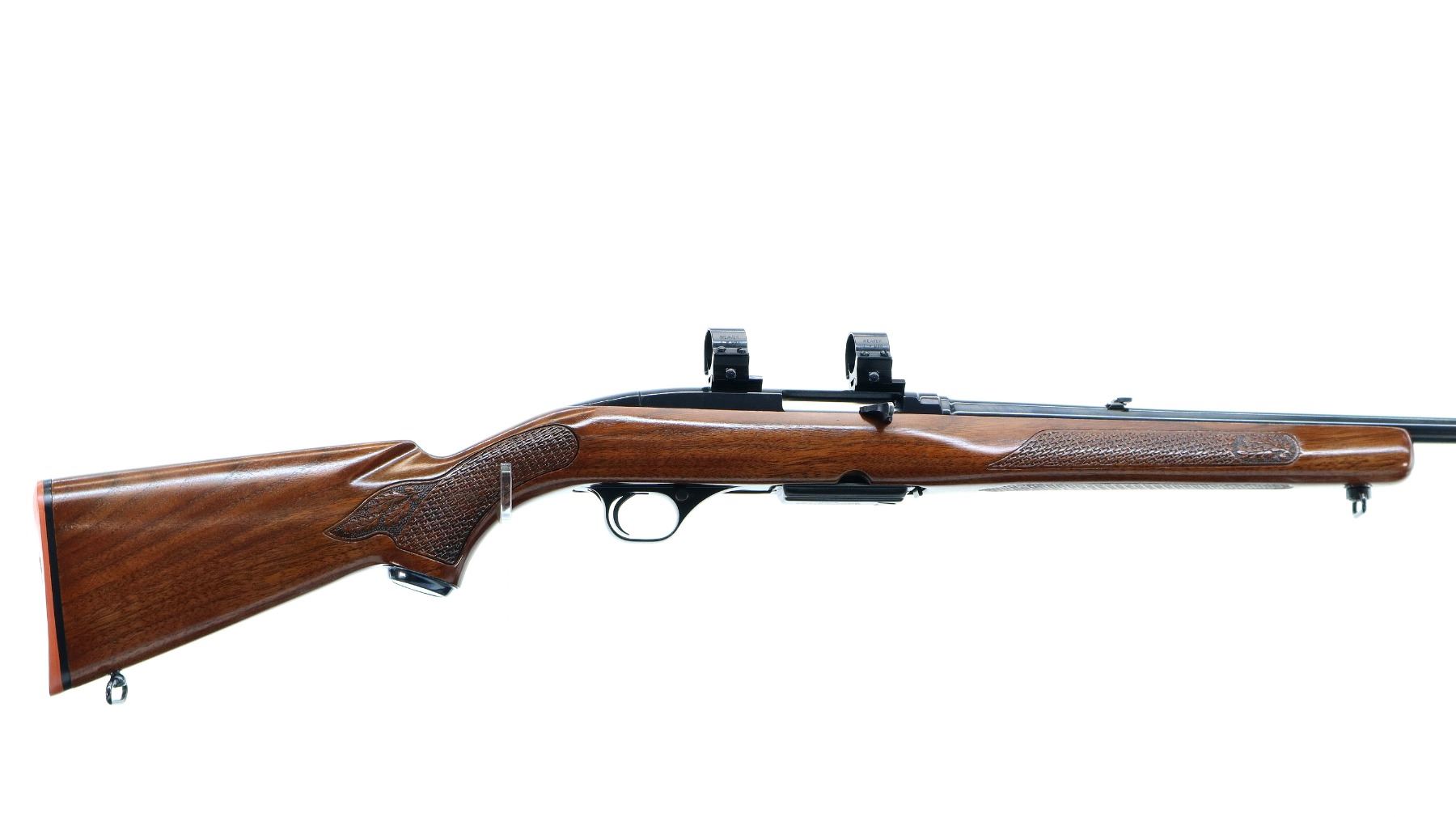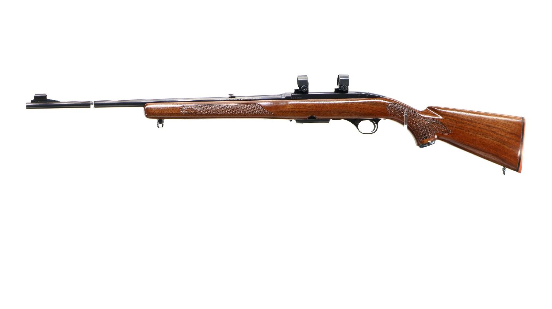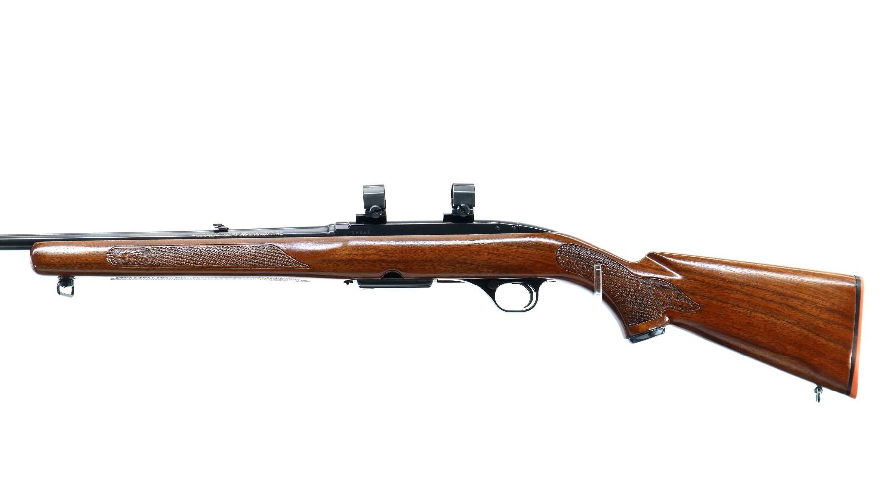 Main Description: Manufactured 1966. Blade front sight with hood and ramp, adjustable folding u notched rear sight, blued finish, receiver drilled and tapped with two piece bases and 1" Weaver rings installed. One piece refinished wood stock, Basketweave checkered forearm and pistol grip with oak leaves, red rubber recoil pad, 13" LOP, steel grip cap, sling swivels.