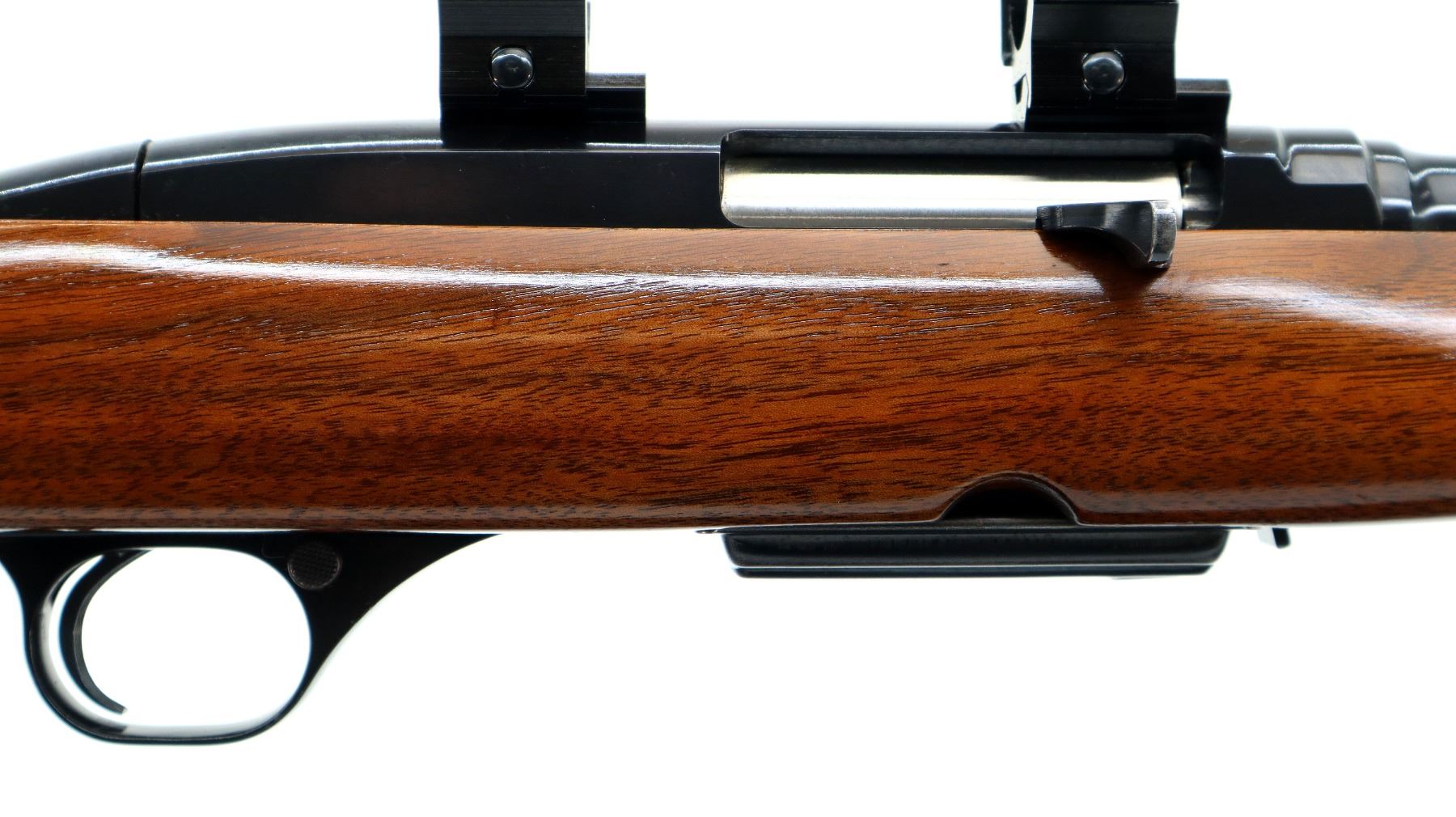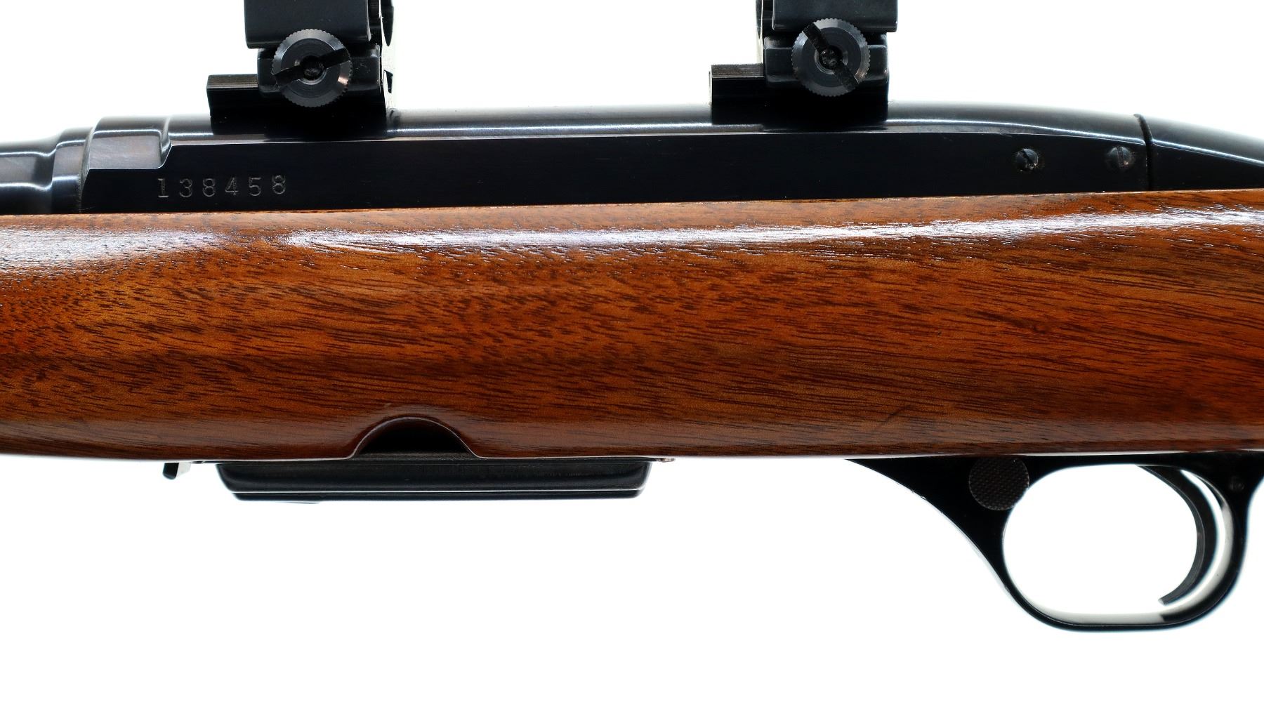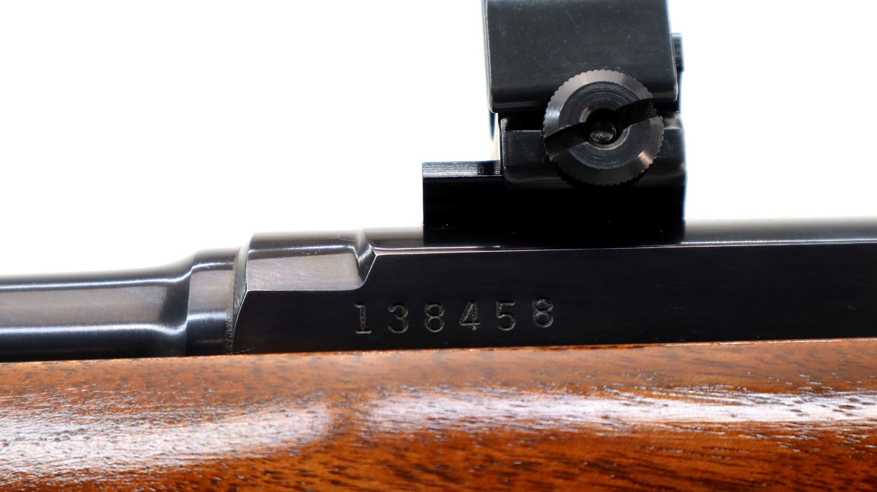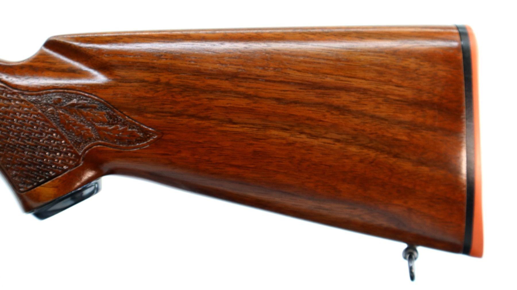 Main Description: Manufactured 1966. Blade front sight with hood and ramp, adjustable folding u notched rear sight, blued finish, receiver drilled and tapped with two piece bases and 1" Weaver rings installed. One piece refinished wood stock, Basketweave checkered forearm and pistol grip with oak leaves, red rubber recoil pad, 13" LOP, steel grip cap, sling swivels.