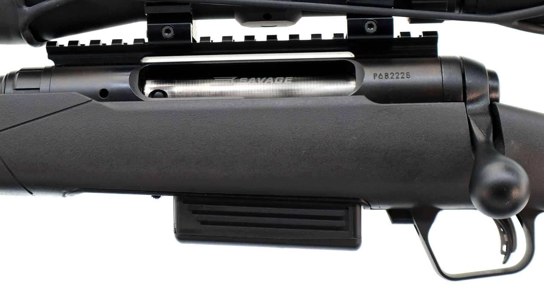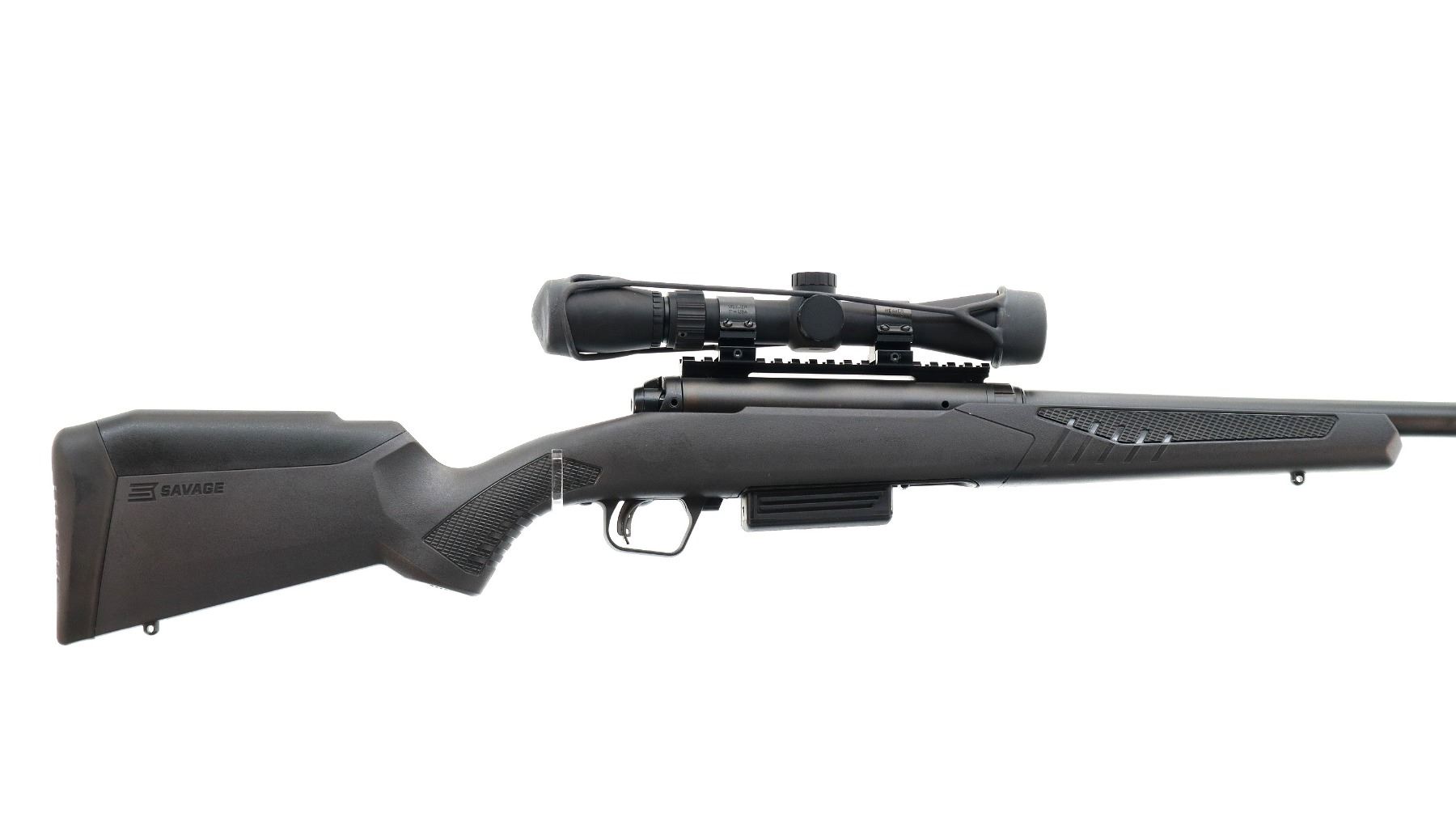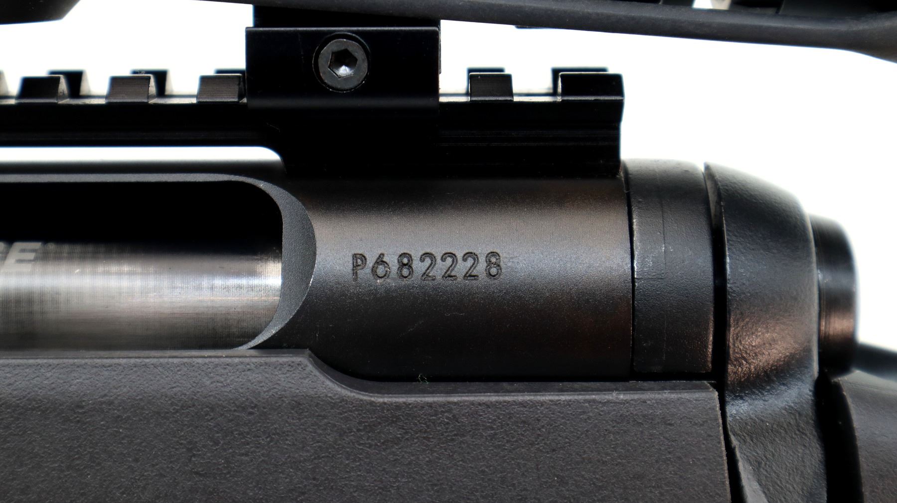 Main Description: No sights, Parkerized metal finish, round barrel, receiver drilled and tapped with Leupold Freedom 2-7x33 scope installed, clear optics with duplex crosshair. Left hand ejection port, bolt with large knob, tang safety. One piece grey synthetic stock, checkered black rubber forearm and pistol grip panels, raised cheek rest, black rubber recoil pad, 12.75" LOP, grip cap, accu trigger, swivel studs.