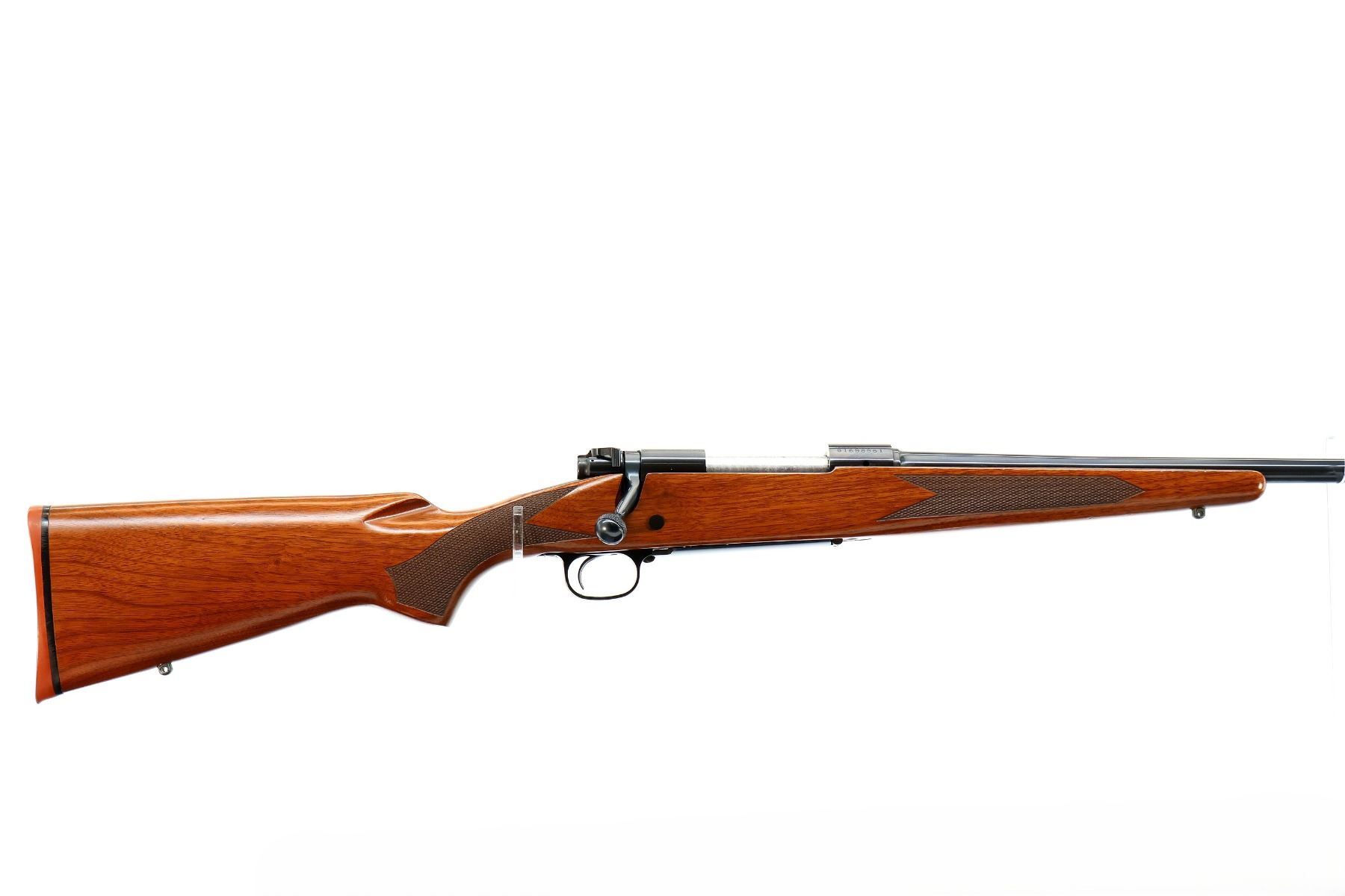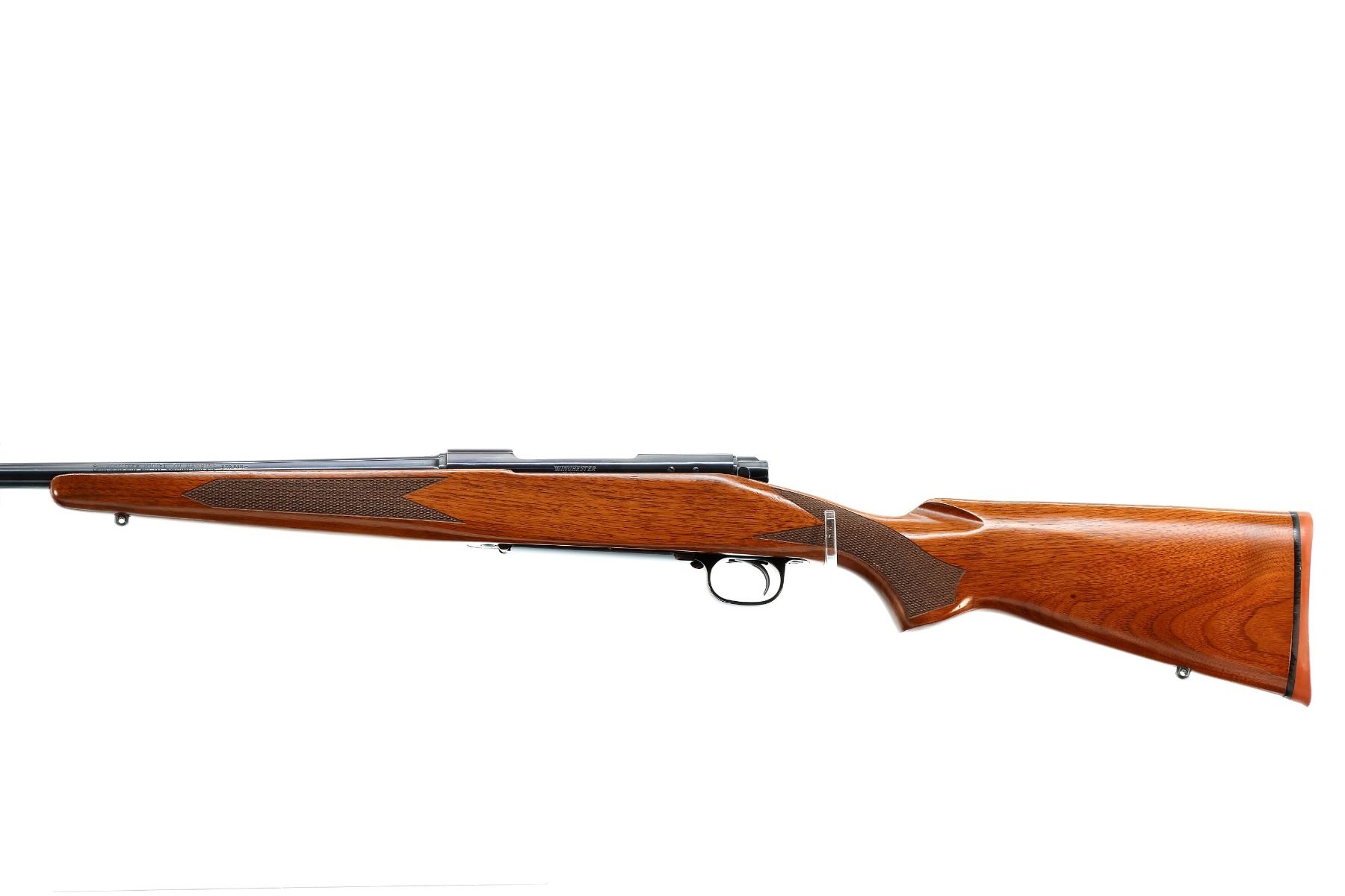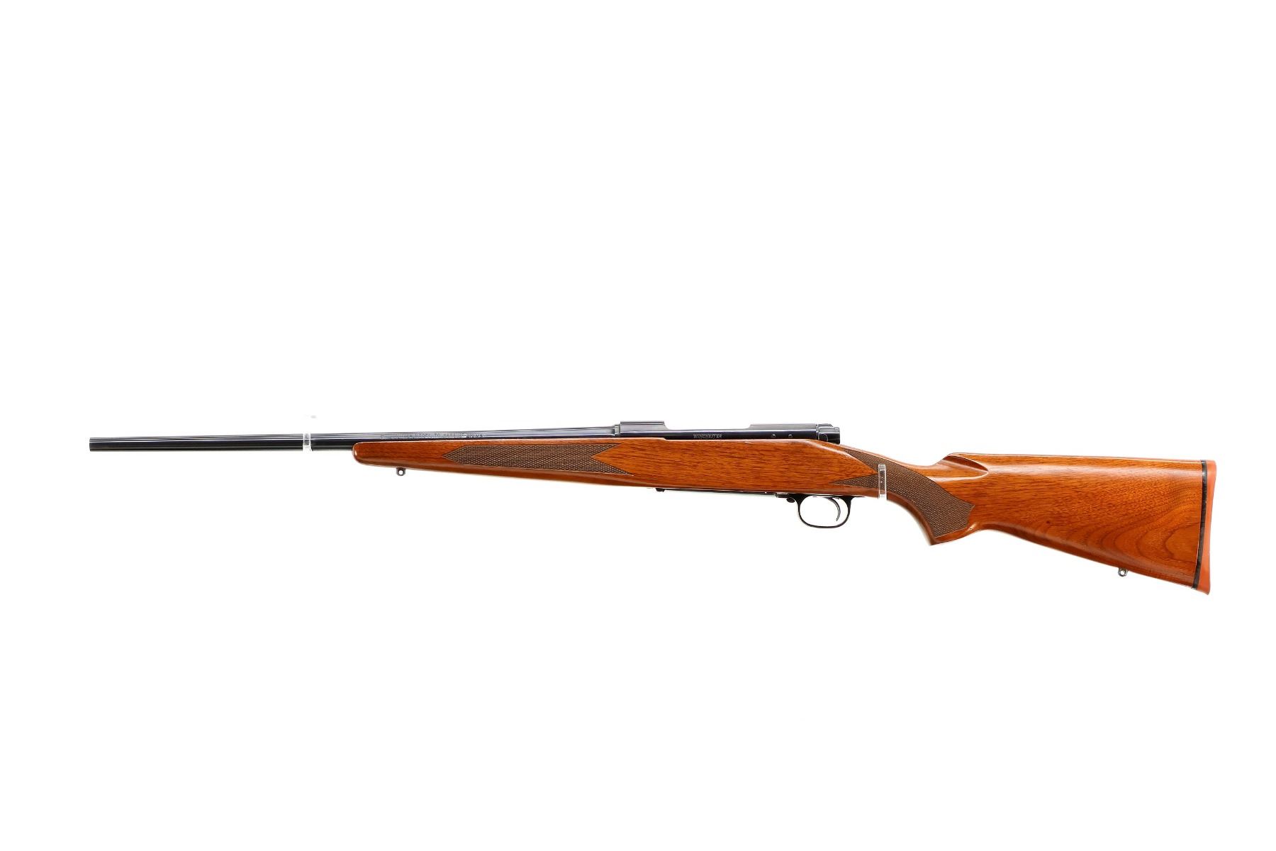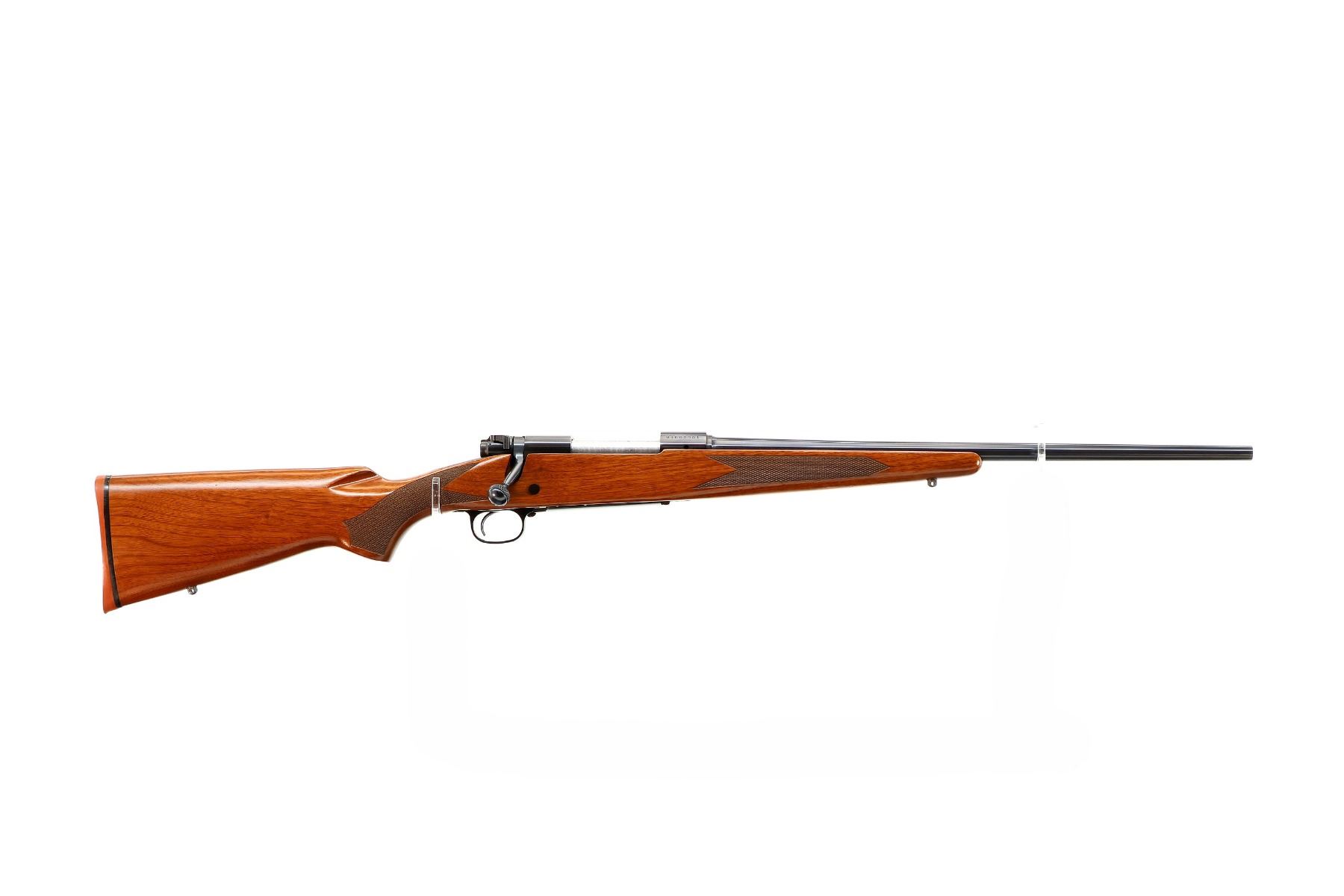 Main Description: No sights, polish blued finish, receiver drilled and tapped with no plug screws installed, jeweled push feed bolt with checkered knob. One piece Satin finish wood stock, checkered forearm and pistol grip, red rubber recoil pad, 13.5" LOP, hinged floor plate, swivel studs.