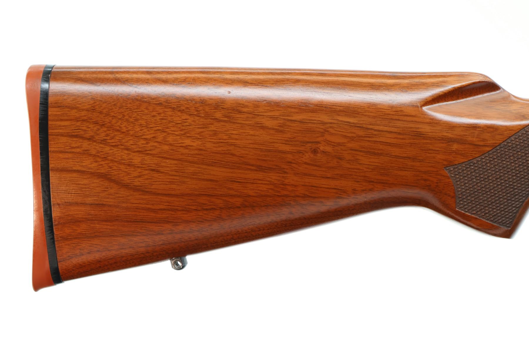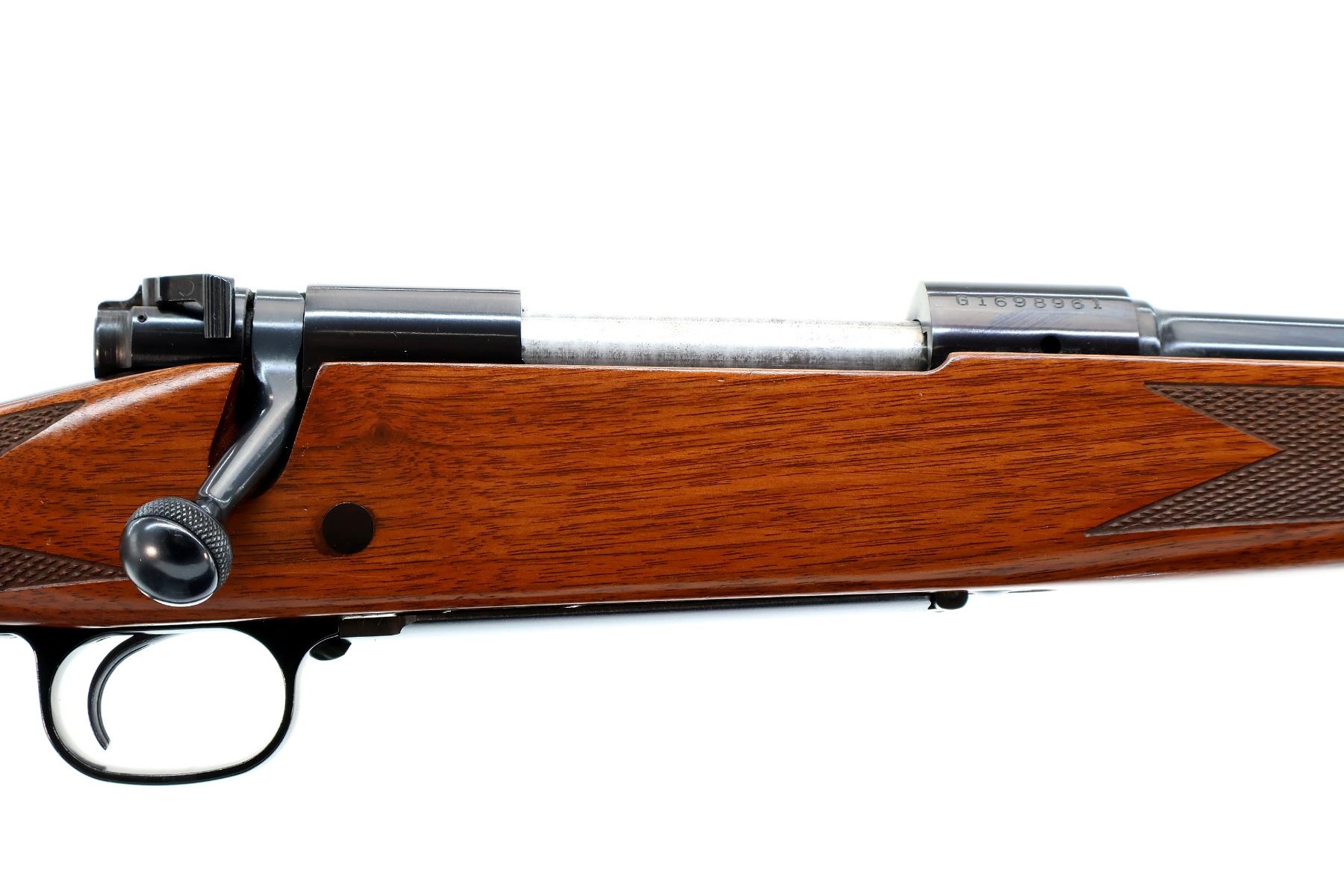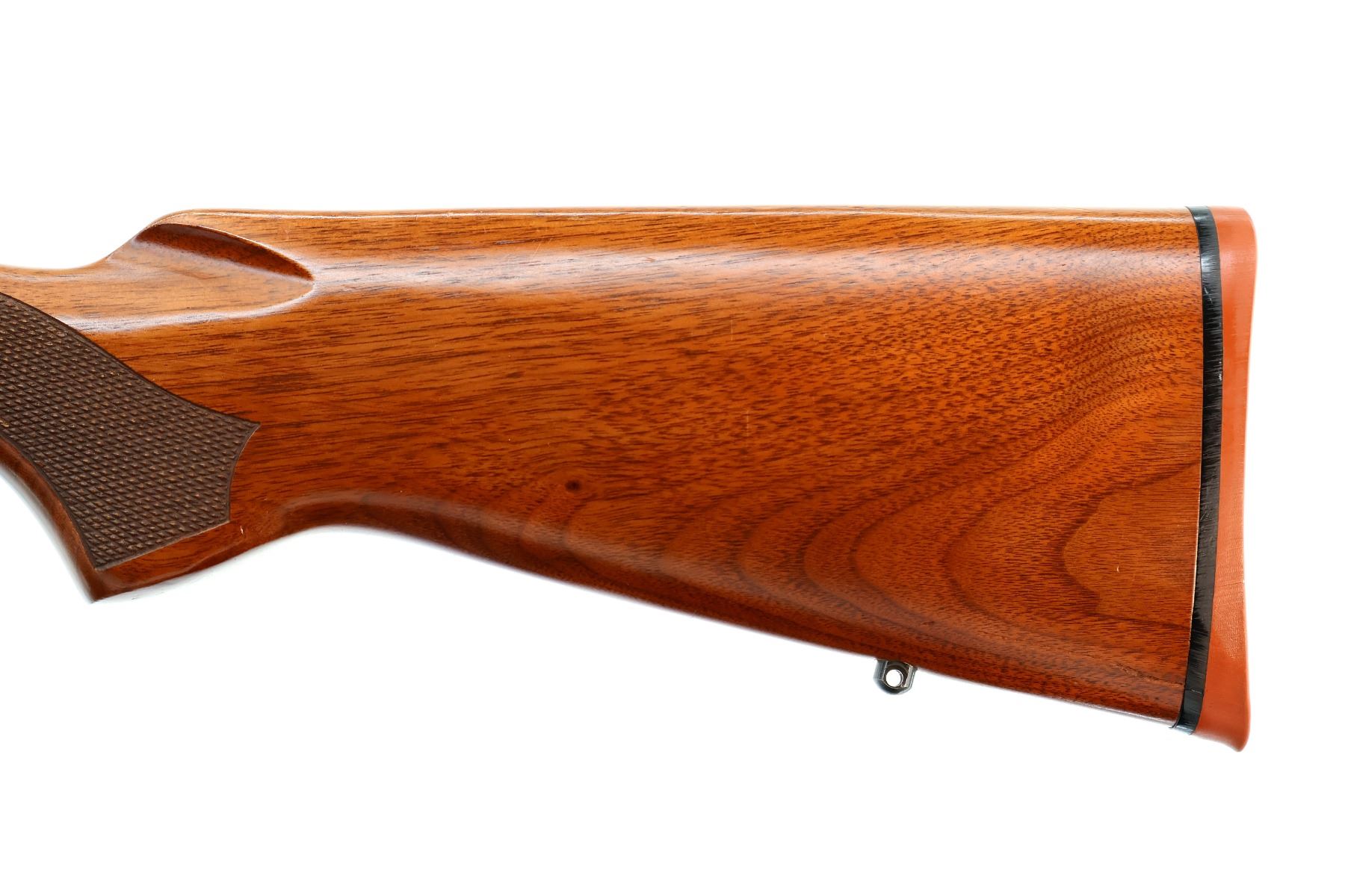 Main Description: No sights, polish blued finish, receiver drilled and tapped with no plug screws installed, jeweled push feed bolt with checkered knob. One piece Satin finish wood stock, checkered forearm and pistol grip, red rubber recoil pad, 13.5" LOP, hinged floor plate, swivel studs.