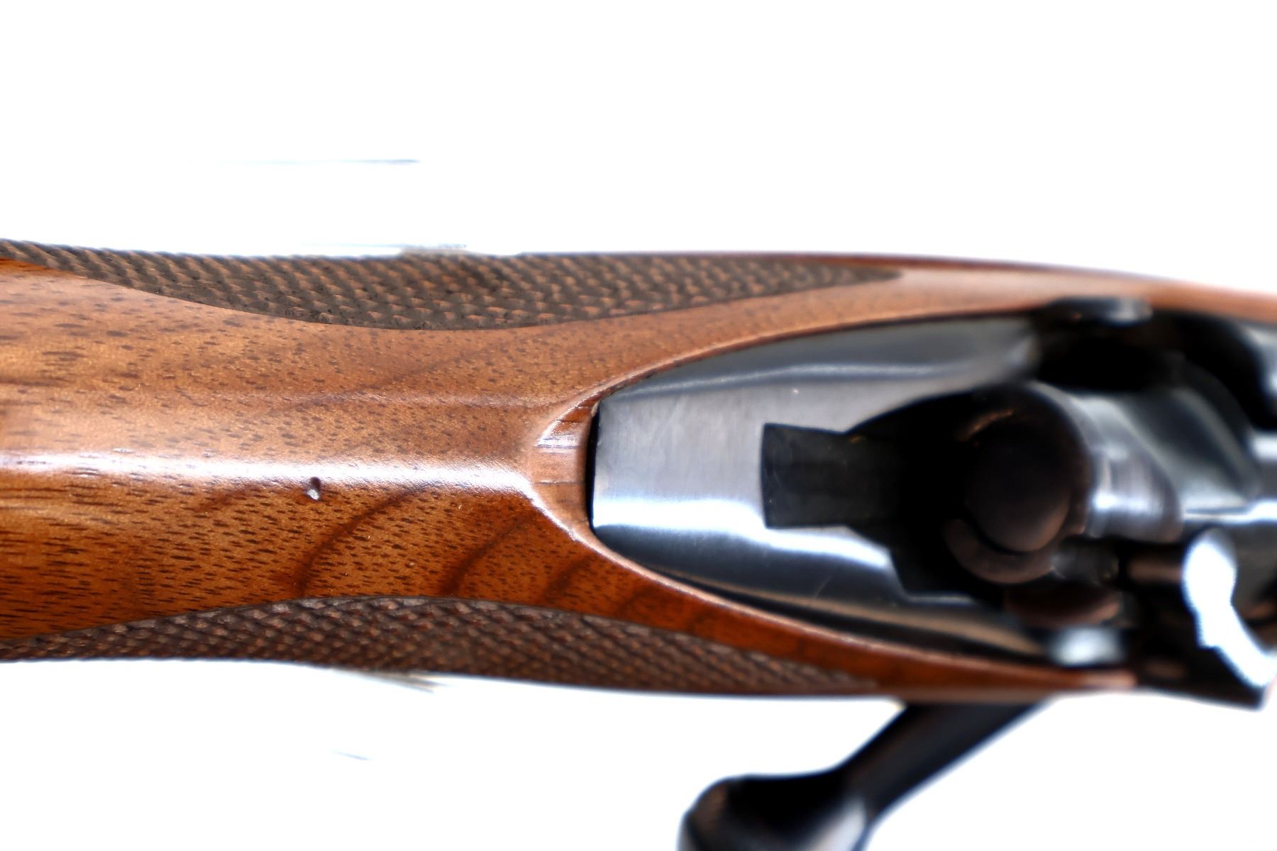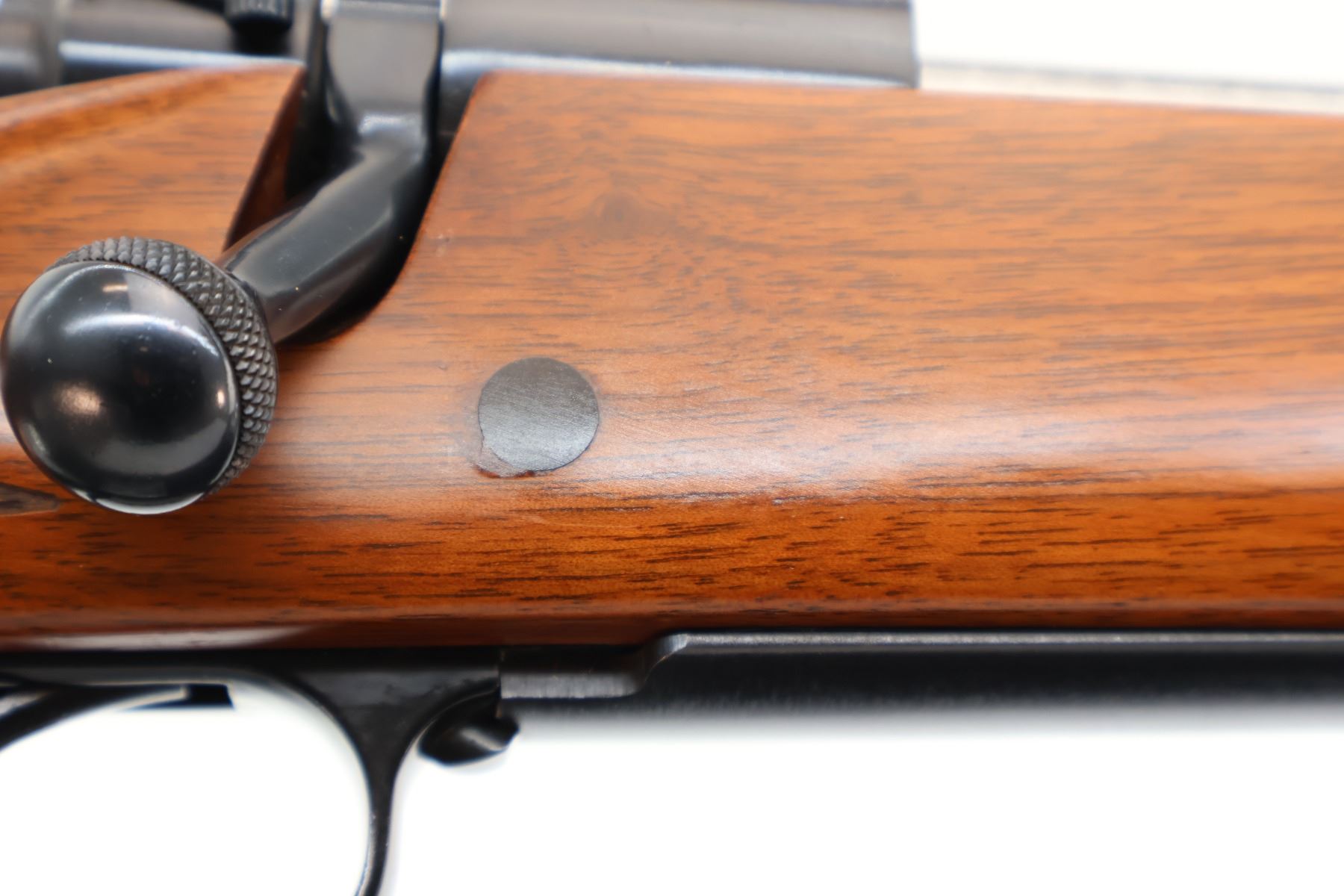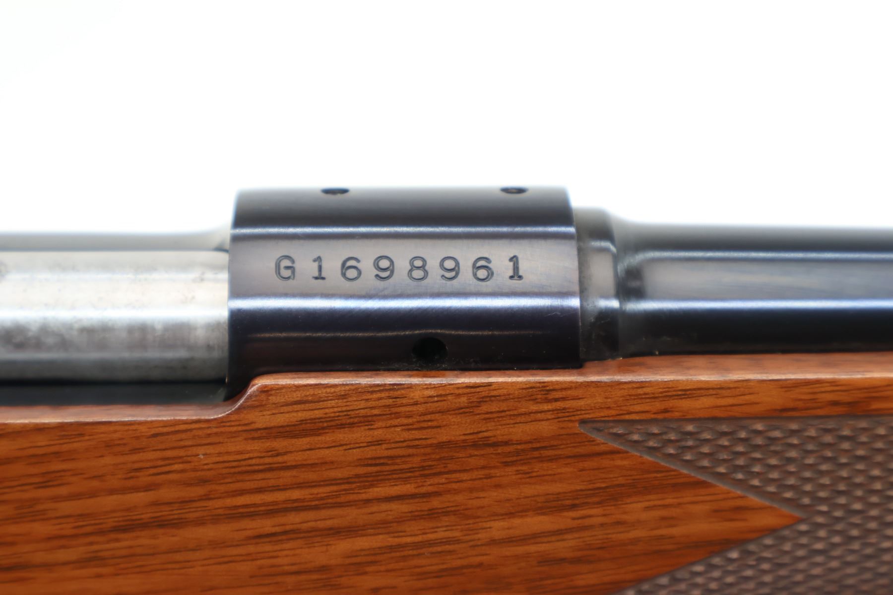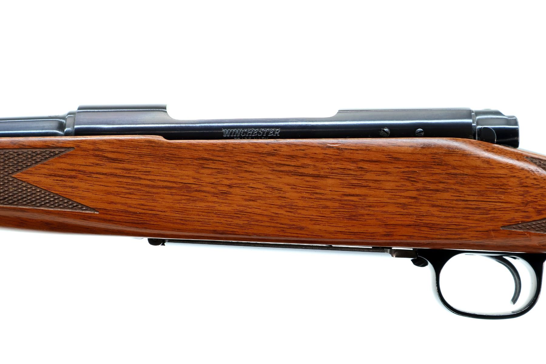 Main Description: No sights, polish blued finish, receiver drilled and tapped with no plug screws installed, jeweled push feed bolt with checkered knob. One piece Satin finish wood stock, checkered forearm and pistol grip, red rubber recoil pad, 13.5" LOP, hinged floor plate, swivel studs.