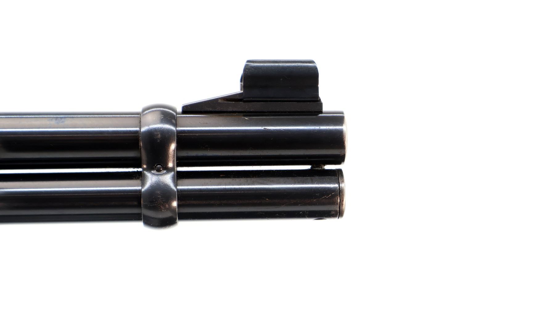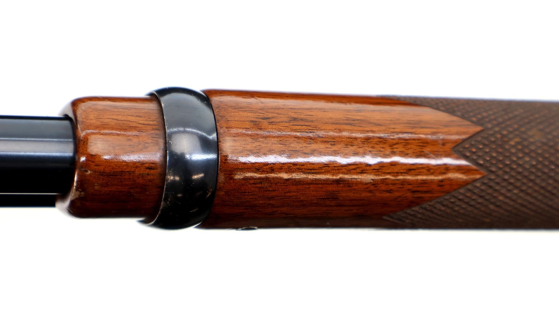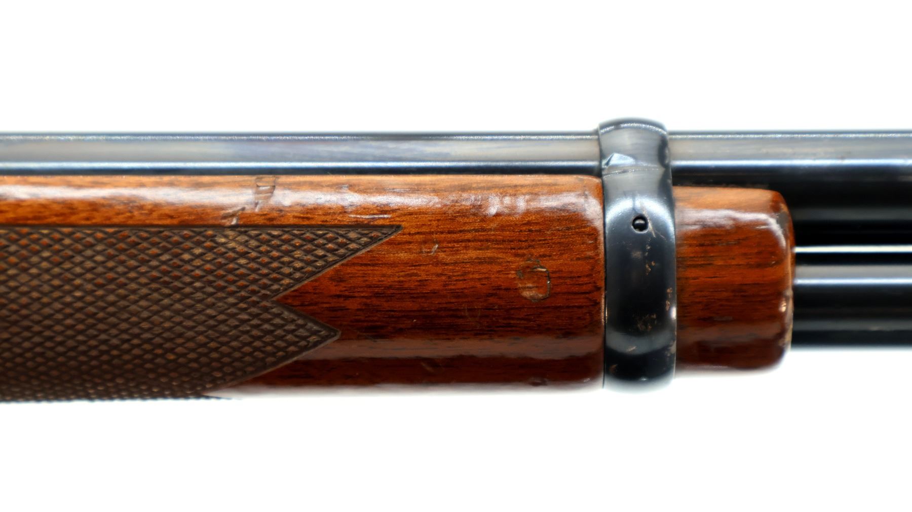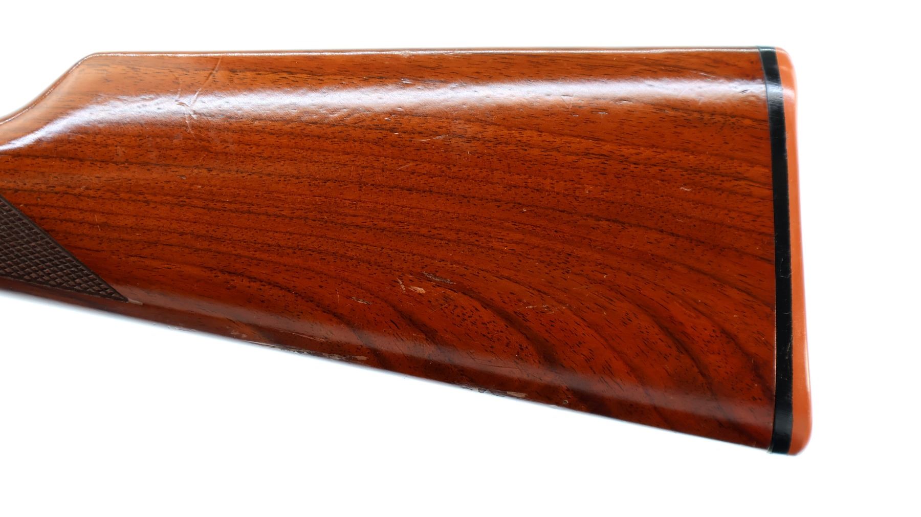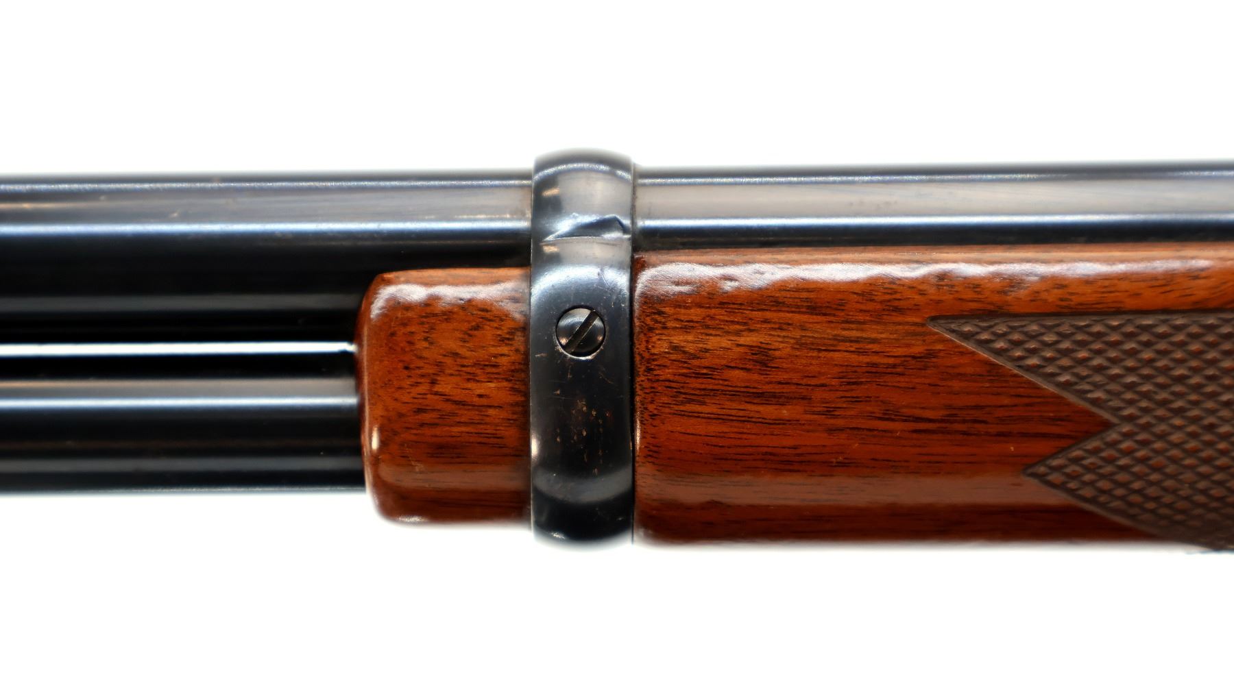 Main Description: Blade front sight with hood and ramp, adjustable folding u notched rear sight, polish blued finish, receiver drilled and tapped with no plug screws installed, grooved spur hammer. Two piece gloss finish wood stocks, checkered forearm and straight grip, red rubber recoil pad, full length magtube.