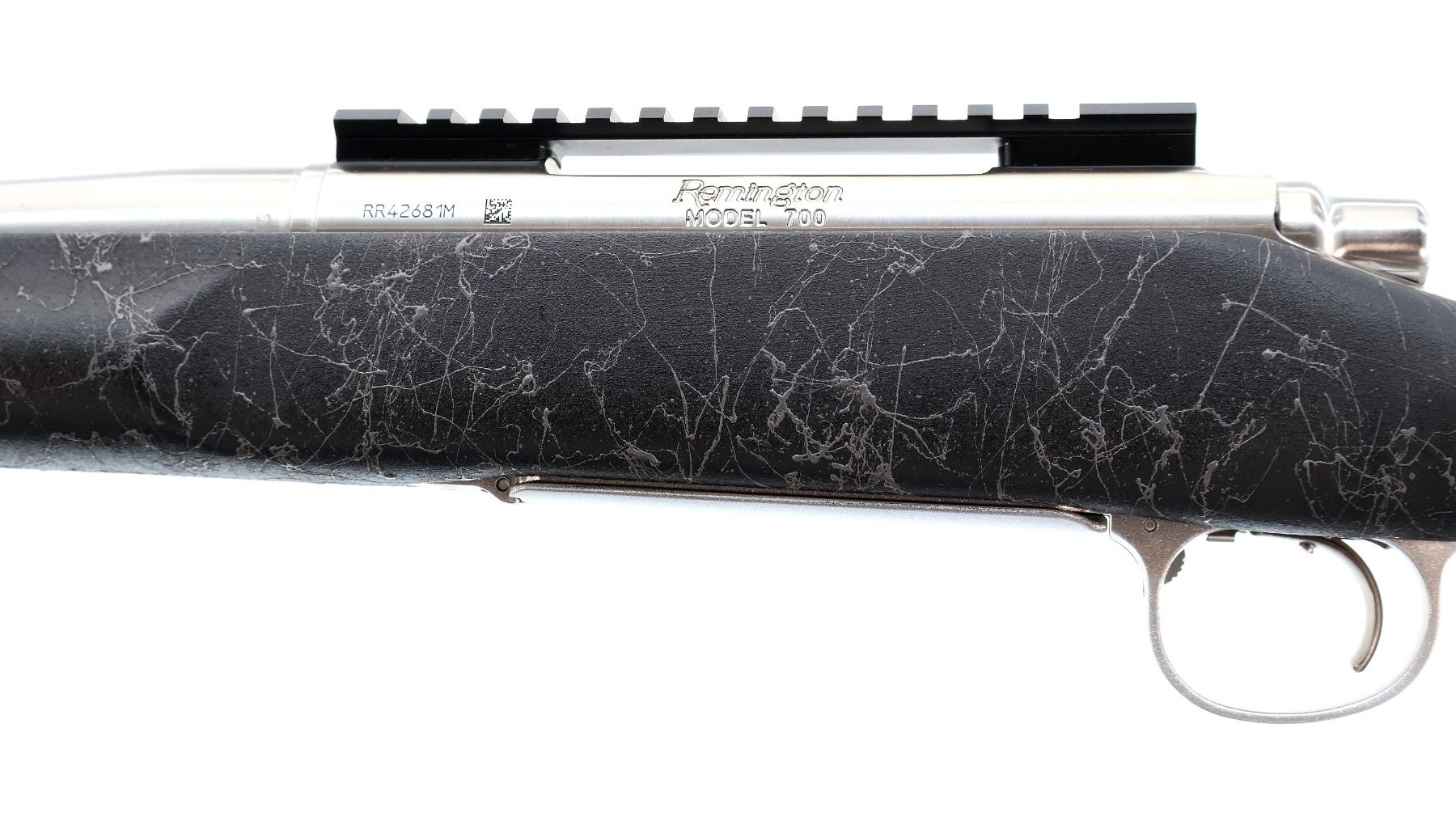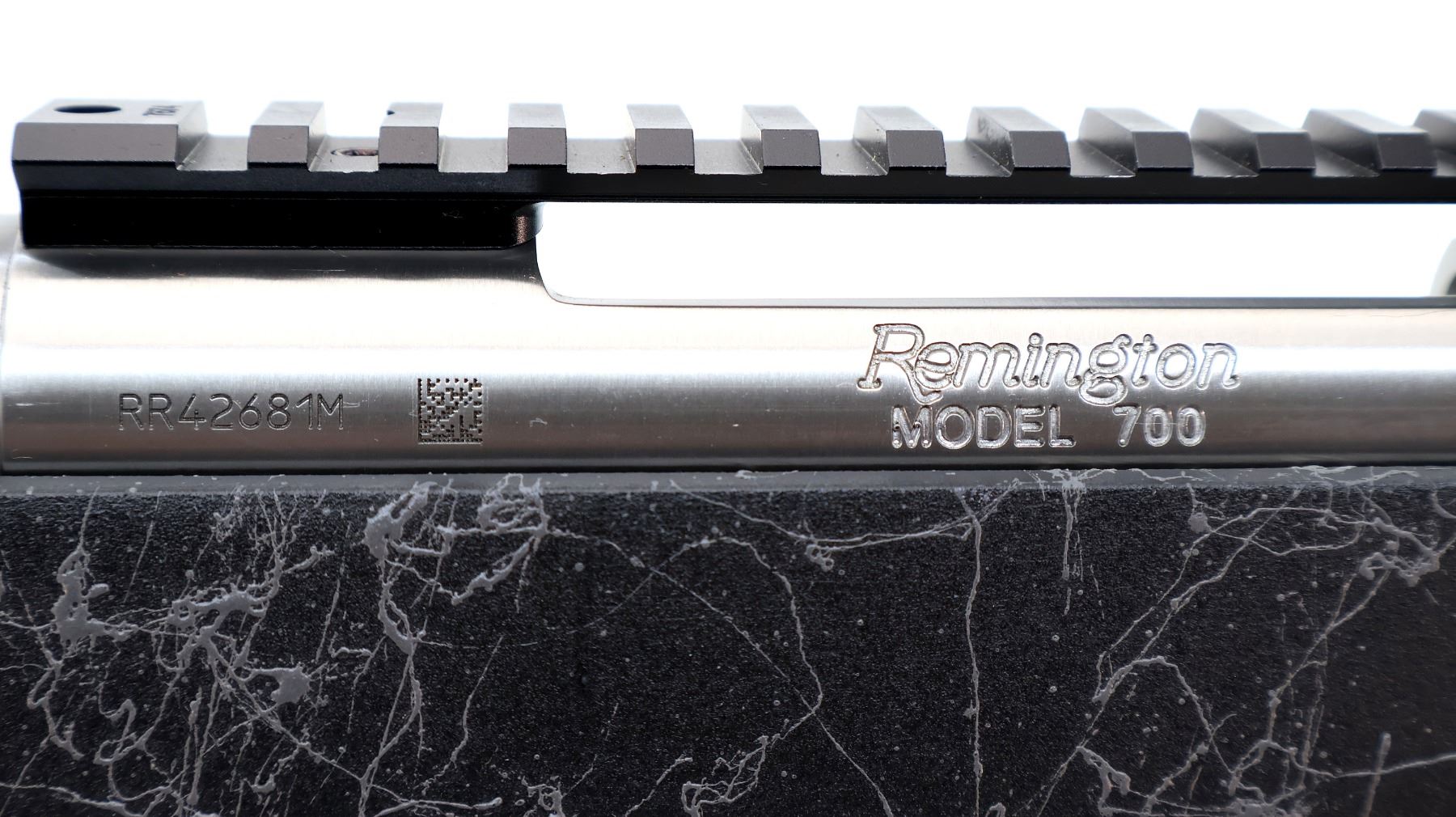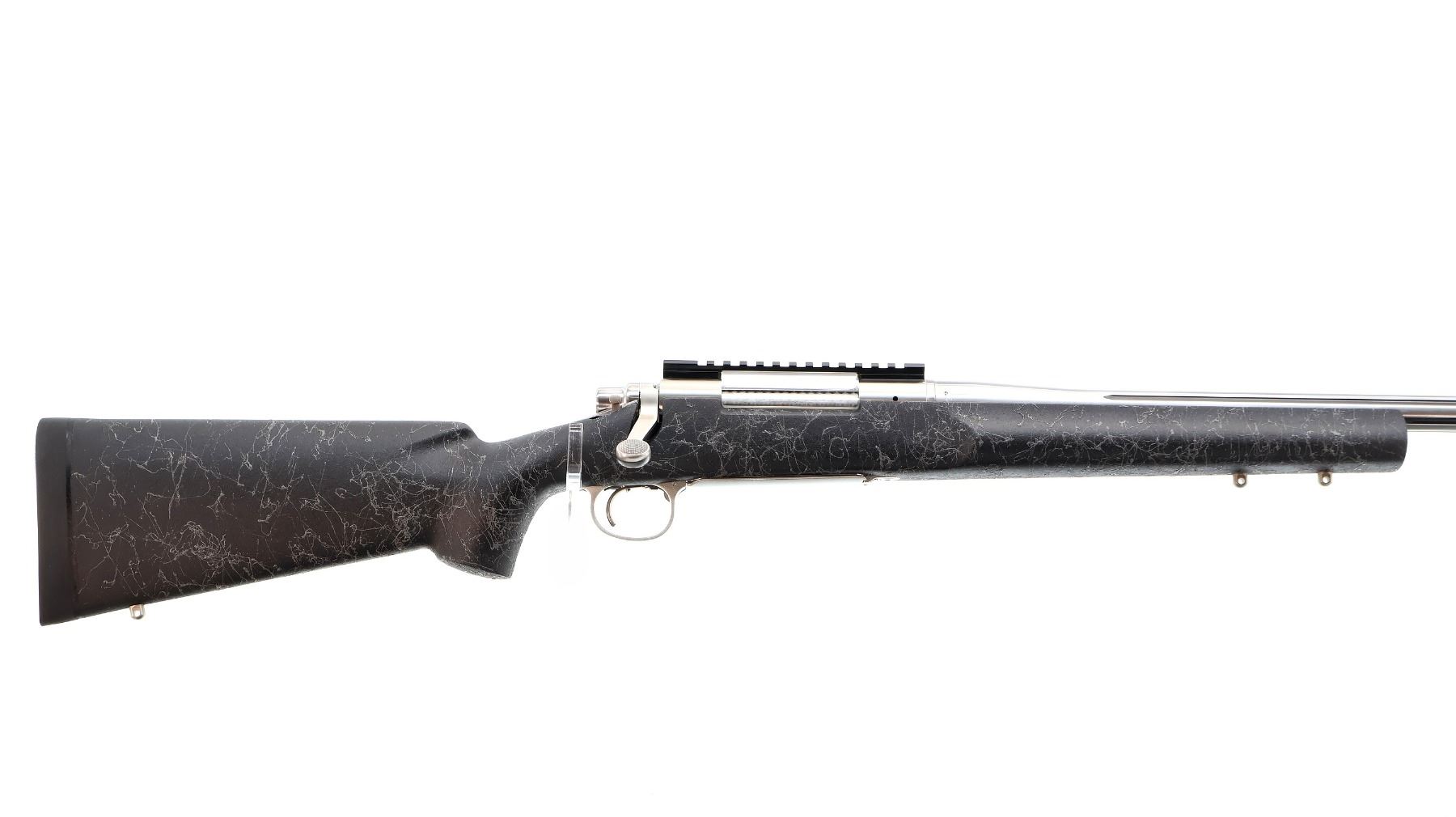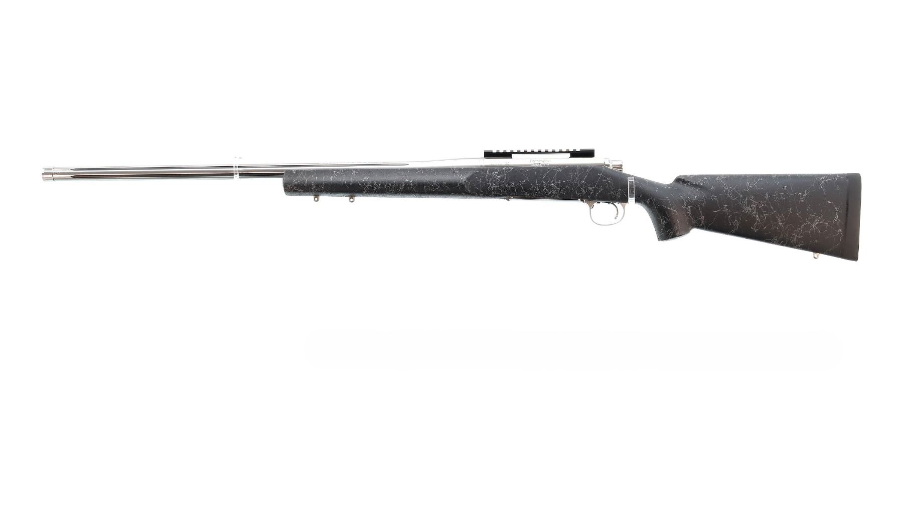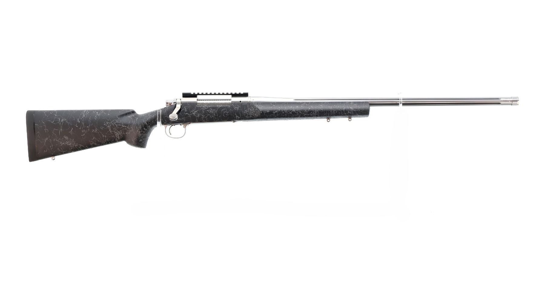 Main Description: No sights, stainless finish, fluted heavy barrel threaded at muzzle with cap, receiver drilled and tapped with One piece scope rail installed, jeweled bolt with checkered knob. One piece black/grey spiderweb fiberglass stock, wide forearm, pistol grip, black rubber recoil pad, hinged floor plate, three swivel studs.