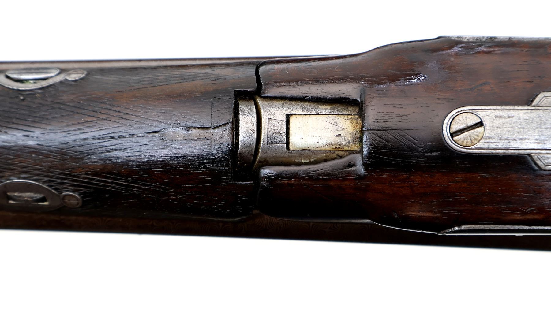Main Description: Silver bead, Damascus barrels with smooth rib that are tight on face, small receiver with checkered sliding opening lever on top tang, side locks with checkered spur hammers that function, extractor, double triggers. Two piece wood stocks, checkered forearm which is cracked and repaired with single wedge, checkered straight grip, stock cracked in front of trigger guard, chipped and cracked behind right lock, smooth steel butt plate and vanity plate. Unique shotgun with receiver surrounded by wood