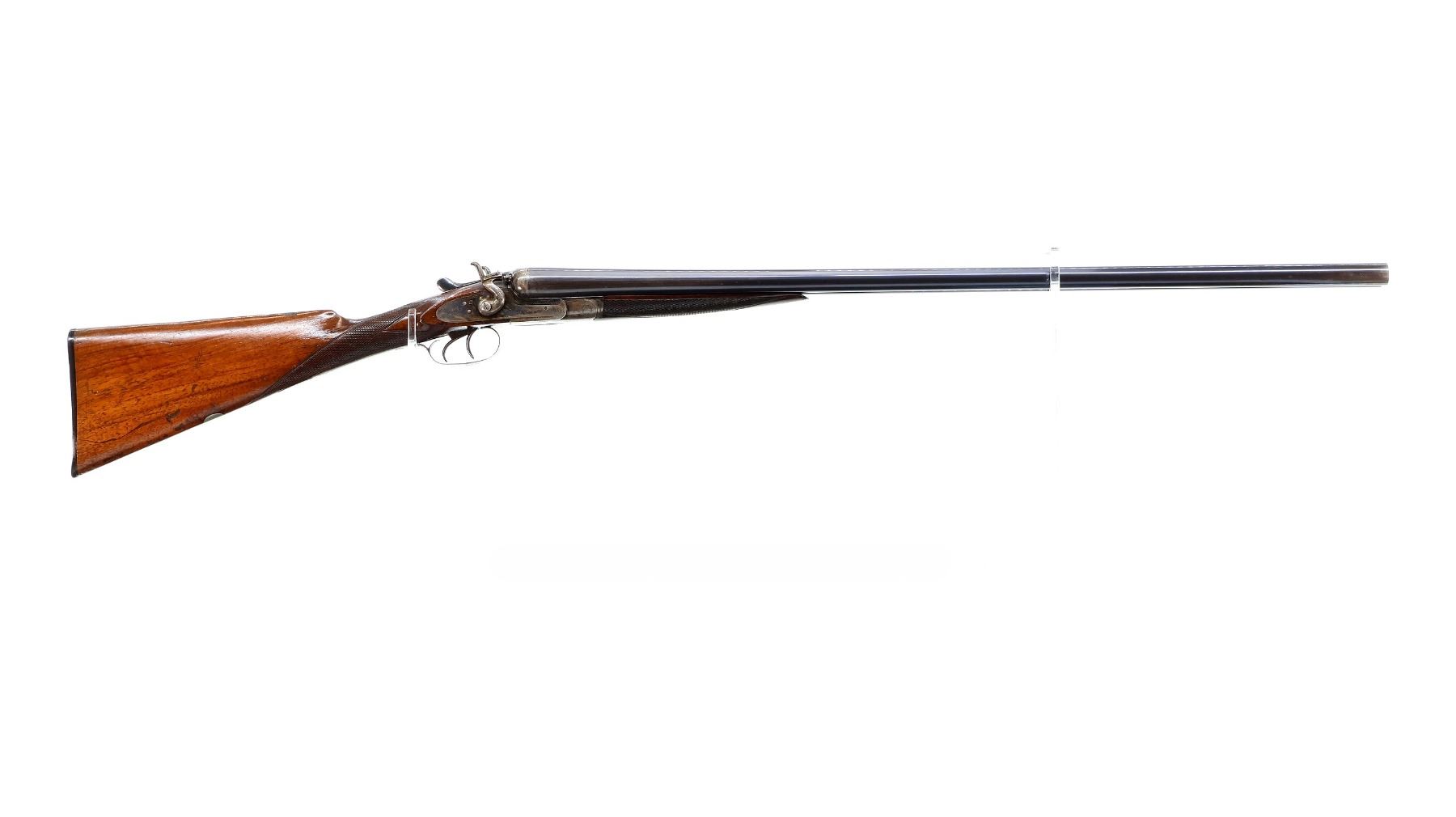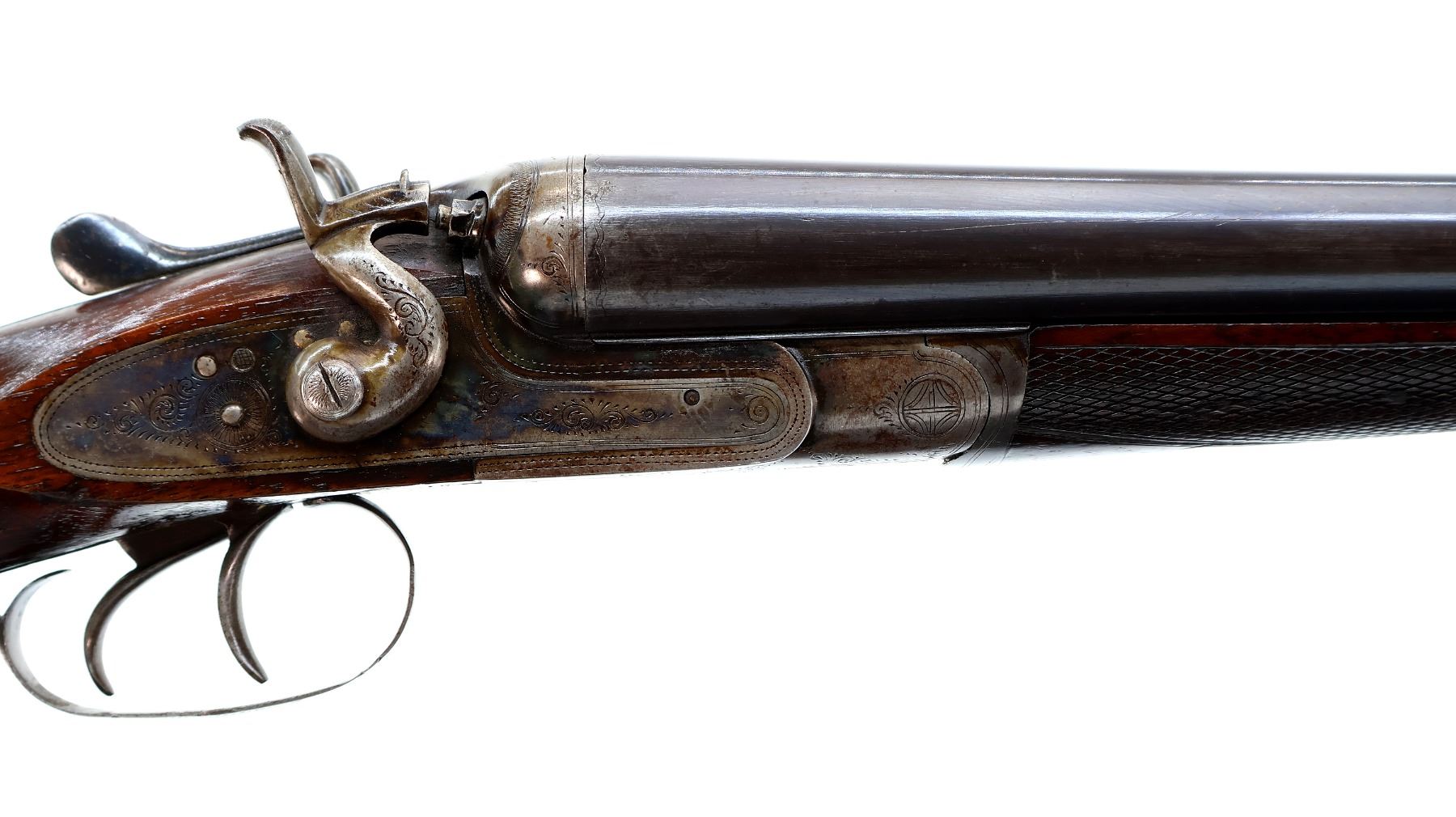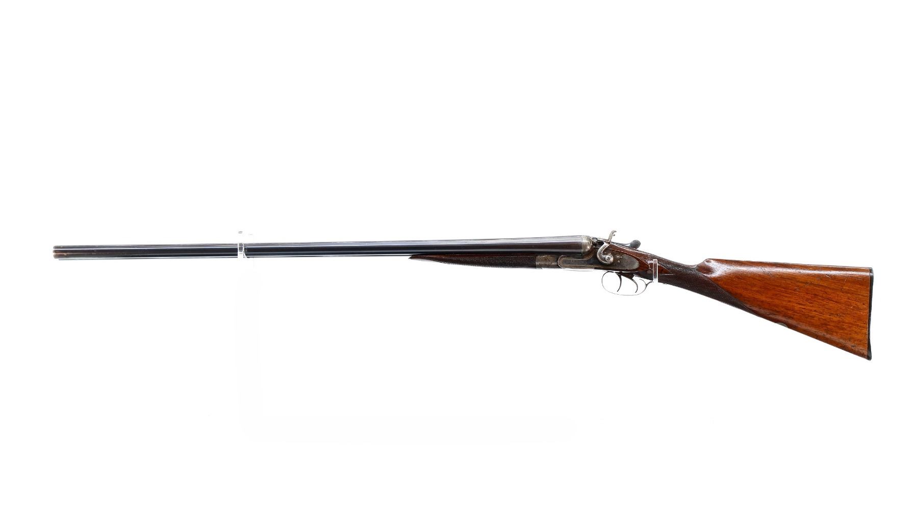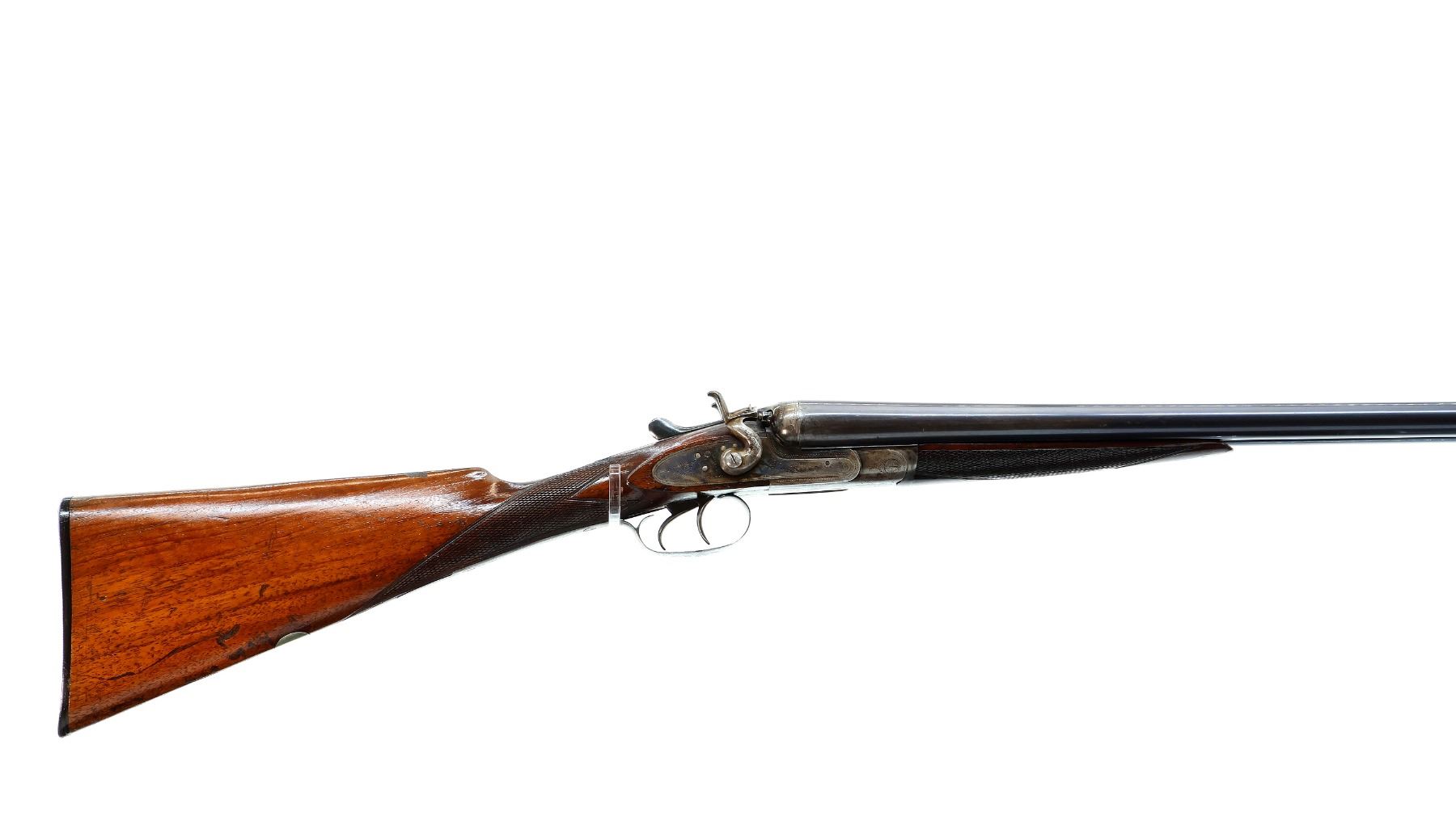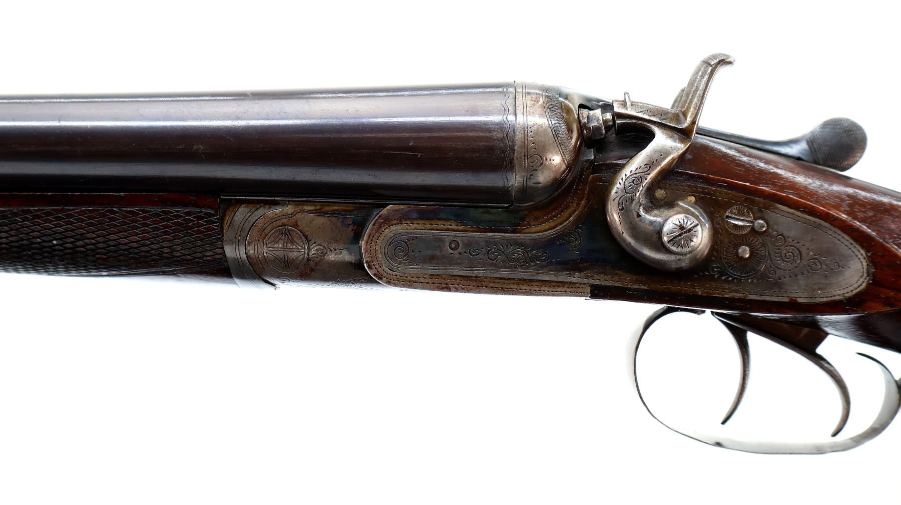 Main Description: Silver bead, blued barrels with smooth rib, that chime and are tight on face, engraved colour case hardened receiver and side locks with grooved spur hammers that function, extractor, double triggers. Two piece wood stocks, checkered forearm cracked at the tip, checkered straight grip, grooved horn butt plate, vanity plate.