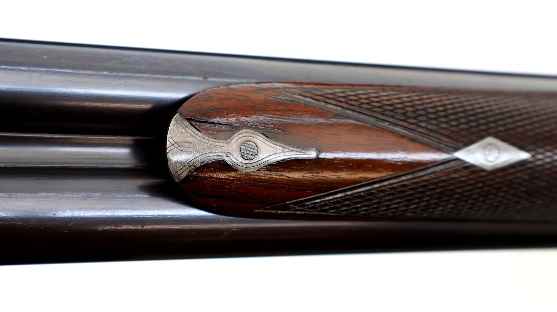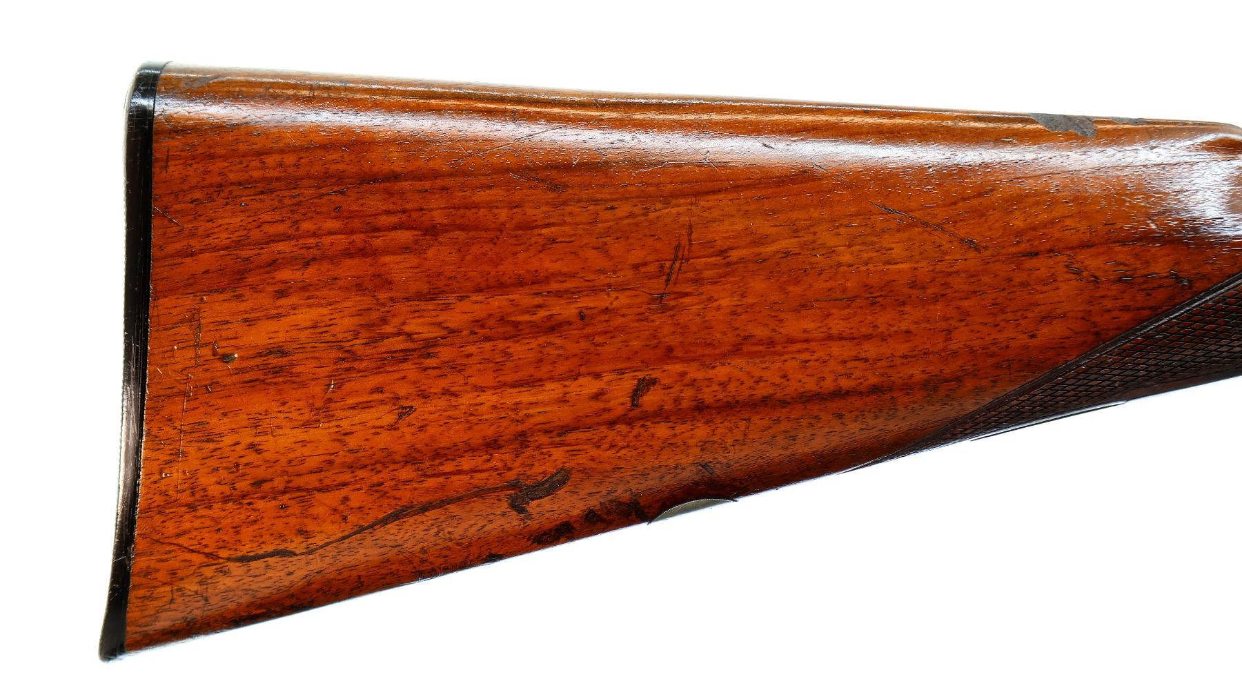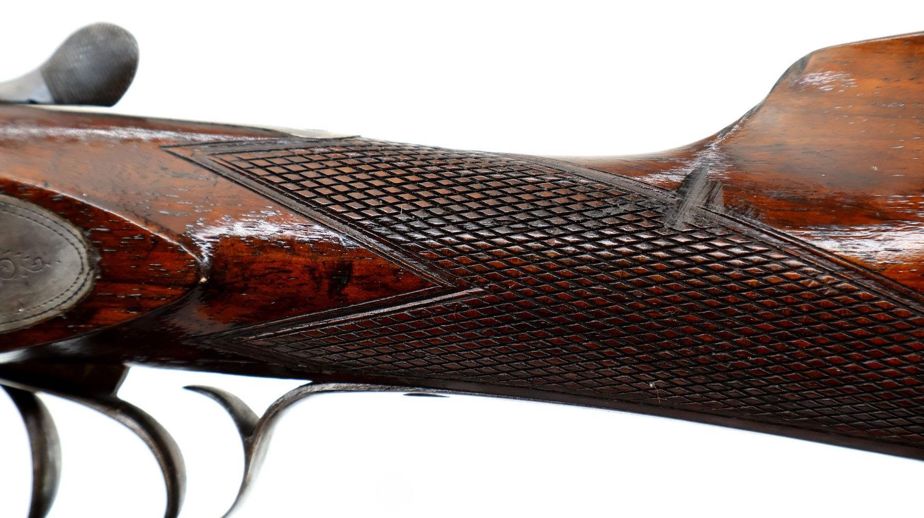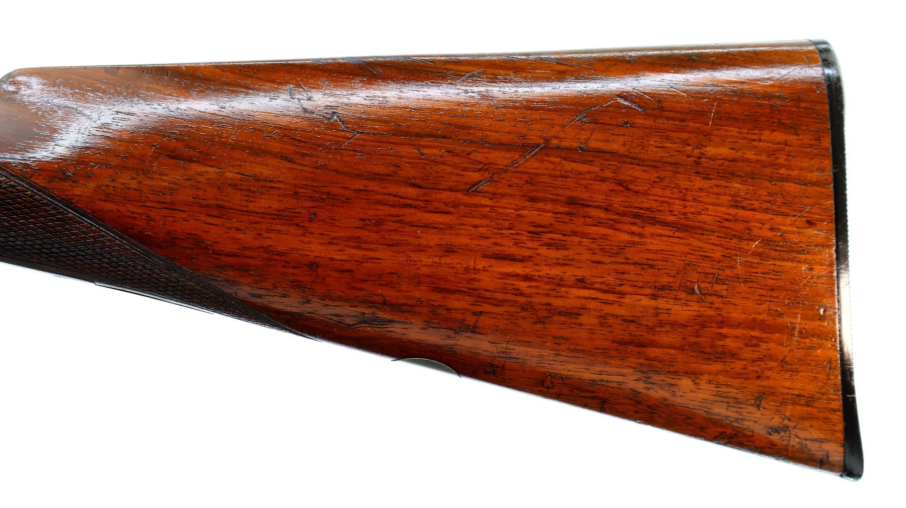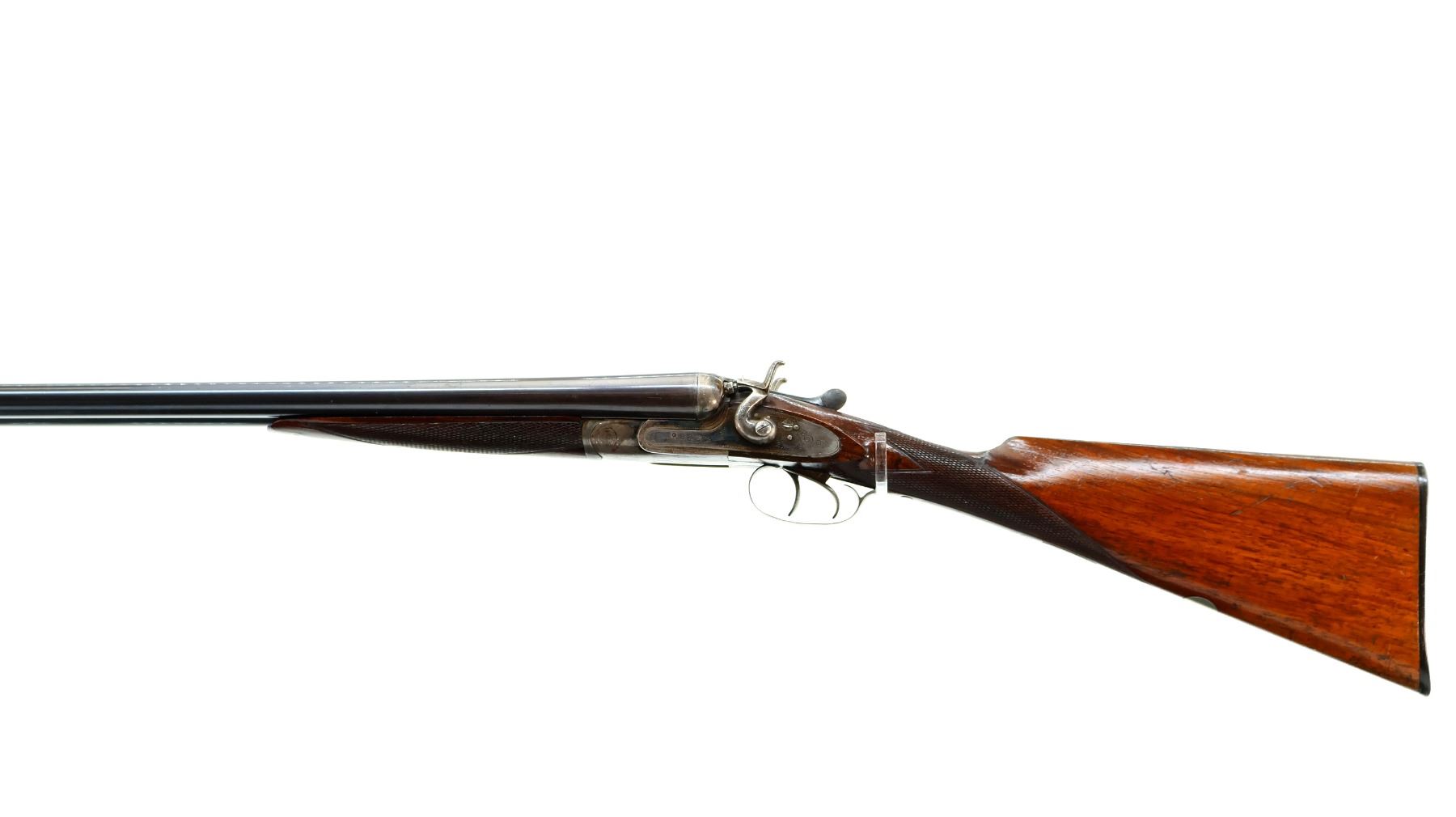 Main Description: Silver bead, blued barrels with smooth rib, that chime and are tight on face, engraved colour case hardened receiver and side locks with grooved spur hammers that function, extractor, double triggers. Two piece wood stocks, checkered forearm cracked at the tip, checkered straight grip, grooved horn butt plate, vanity plate.