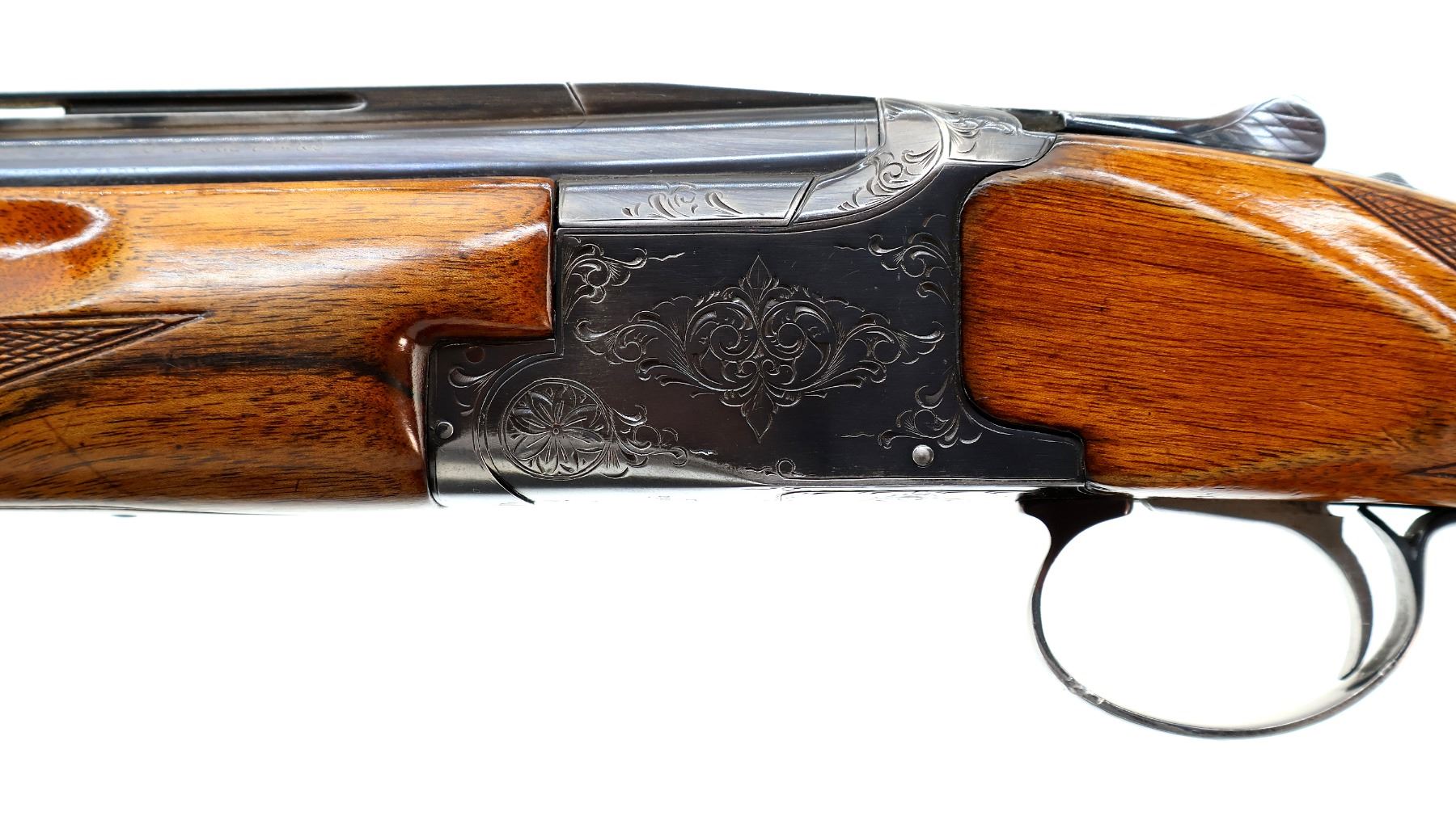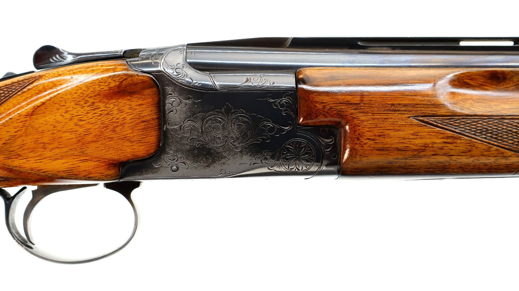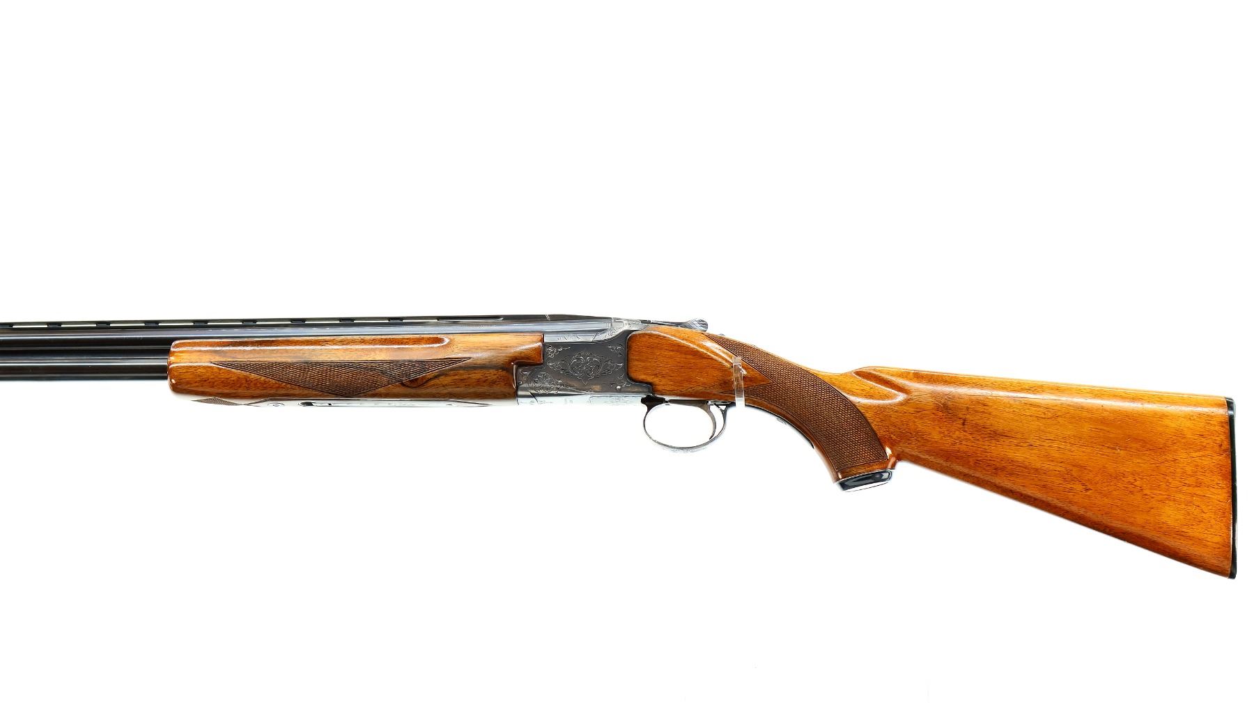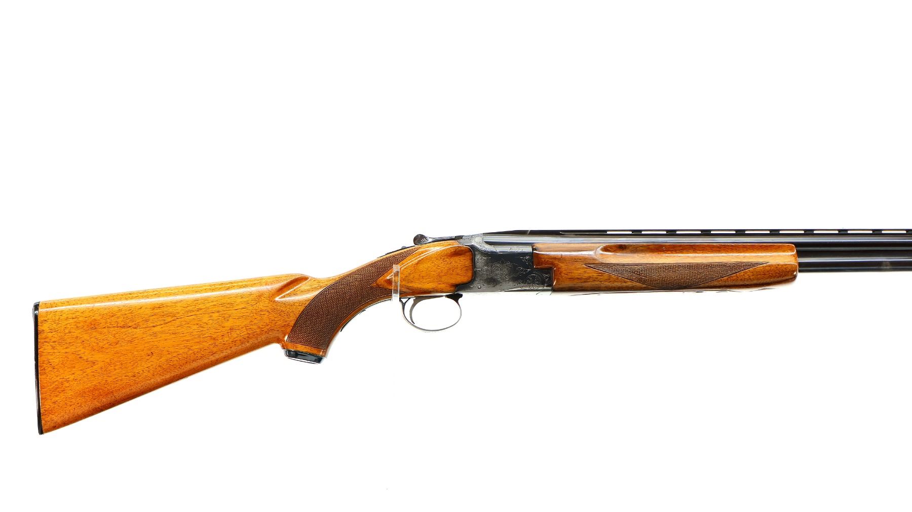 Main Description: White front and silver mid rib beads, blued finish, vent rib, engraved receiver, manual selective safety, ejectors, single silver mechanical trigger. Two piece wood stocks, finger grooved checkered forearm, checkered pistol grip and black polymer butt plate, stock cracked behind upper tang, steel grip cap.