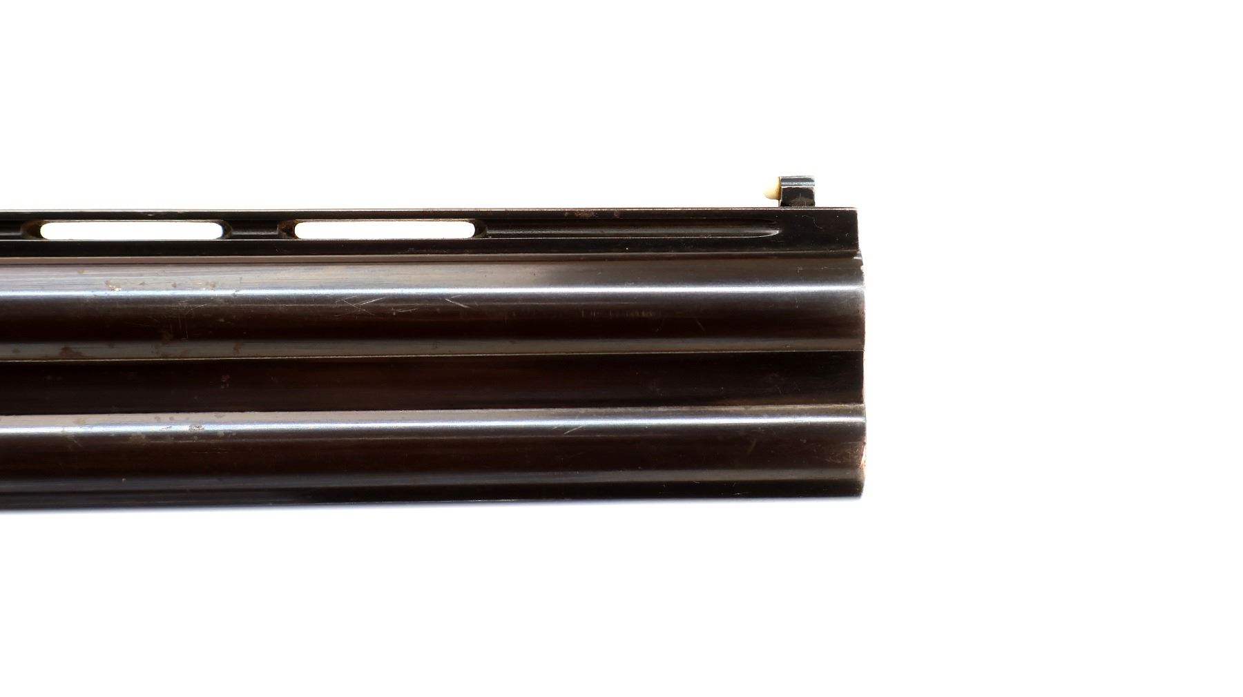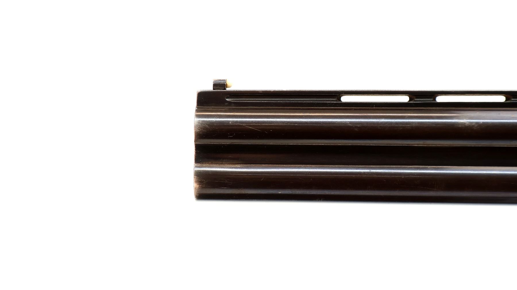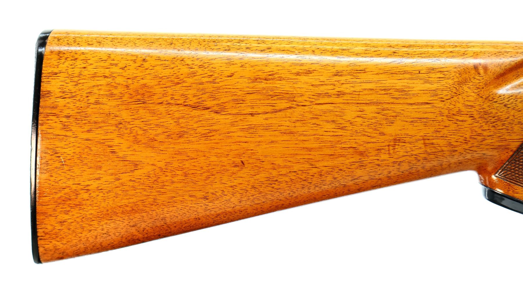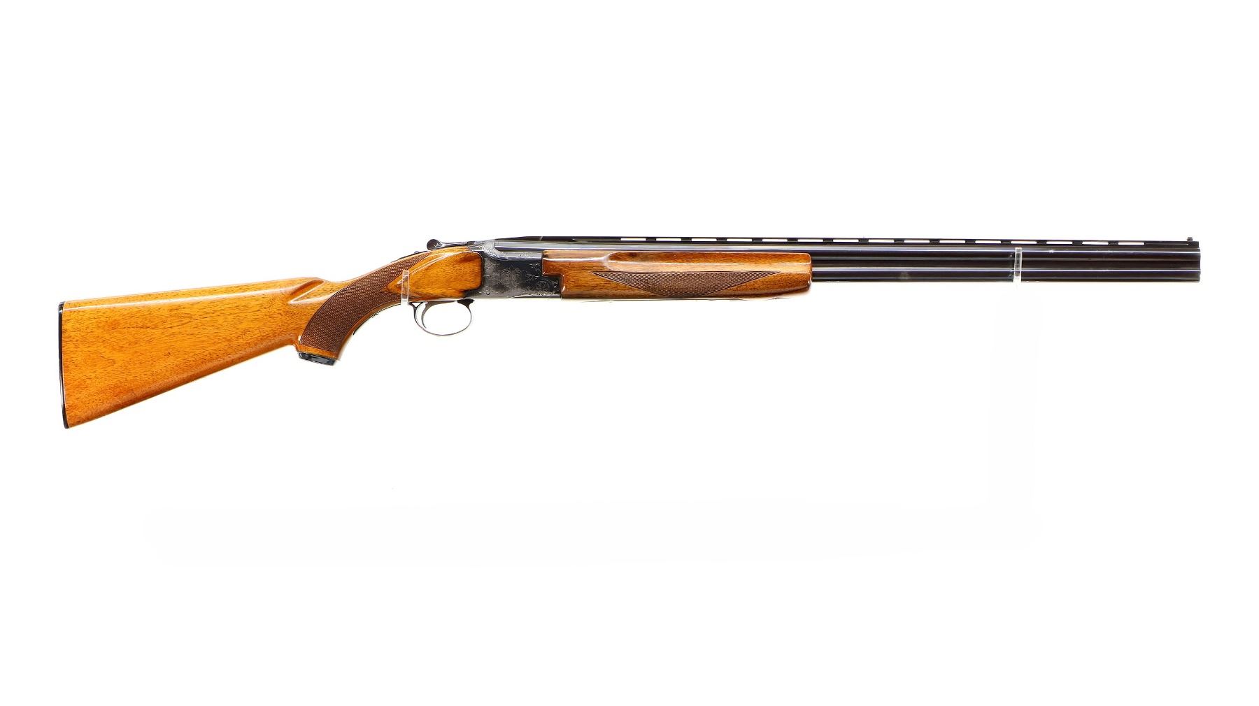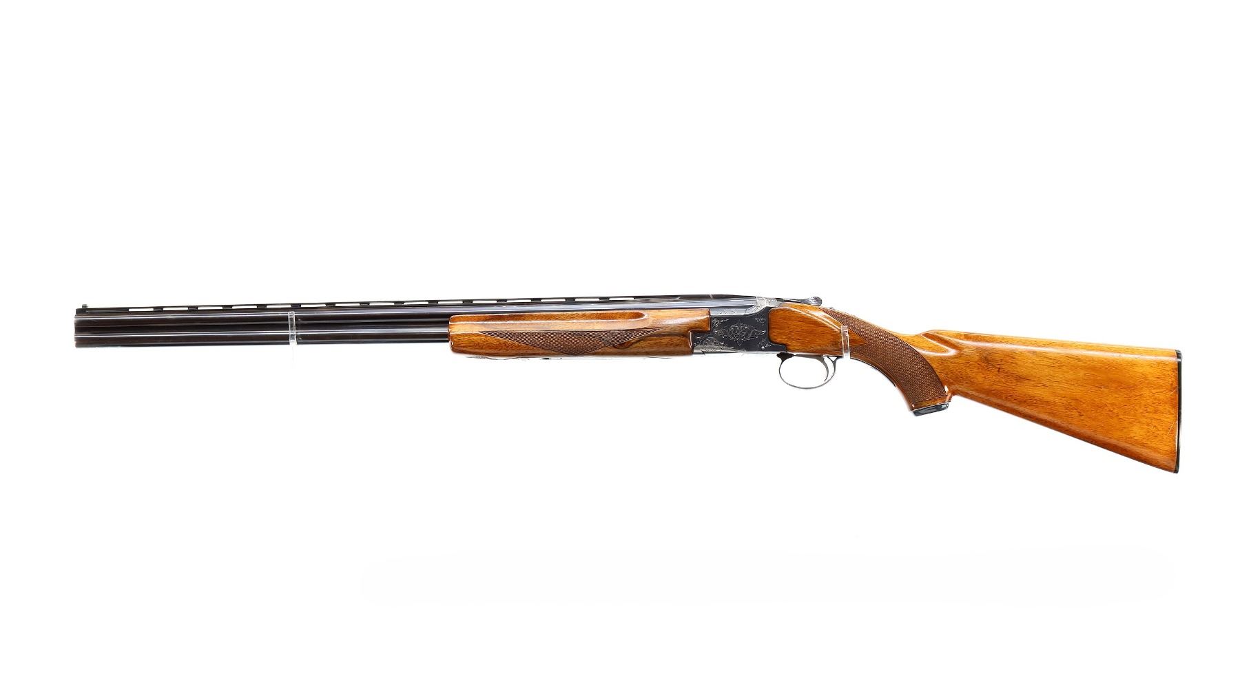 Main Description: White front and silver mid rib beads, blued finish, vent rib, engraved receiver, manual selective safety, ejectors, single silver mechanical trigger. Two piece wood stocks, finger grooved checkered forearm, checkered pistol grip and black polymer butt plate, stock cracked behind upper tang, steel grip cap.