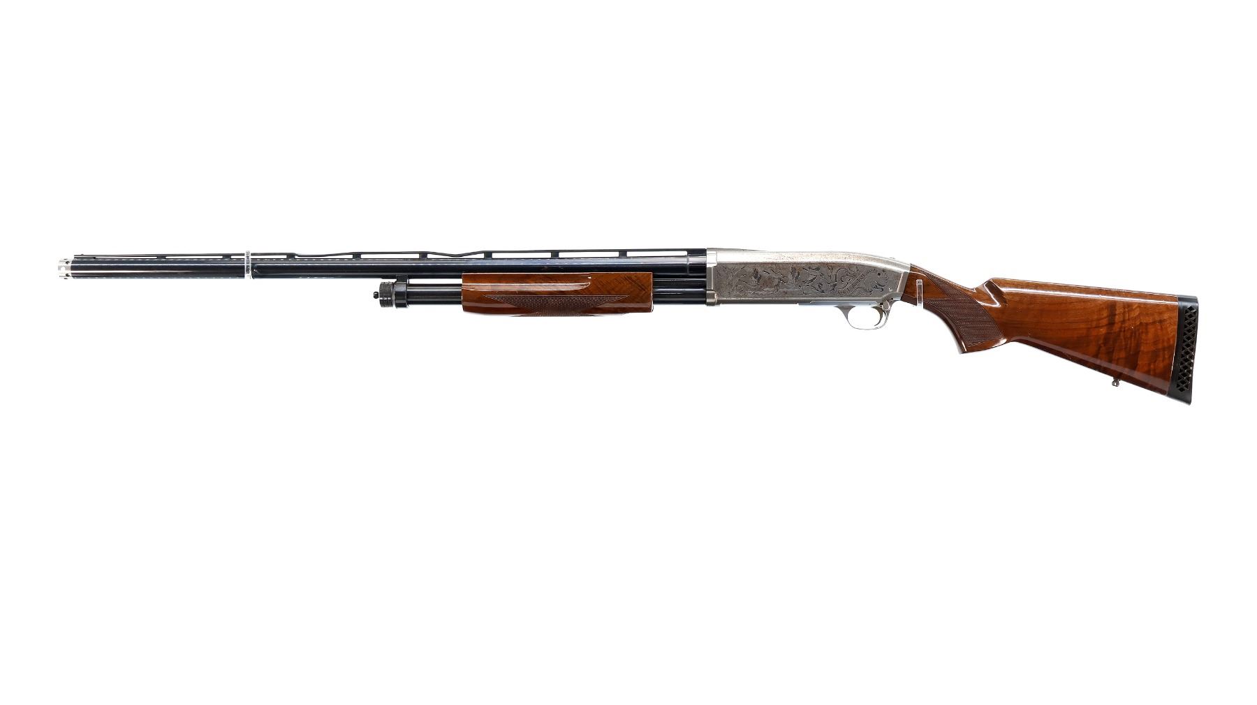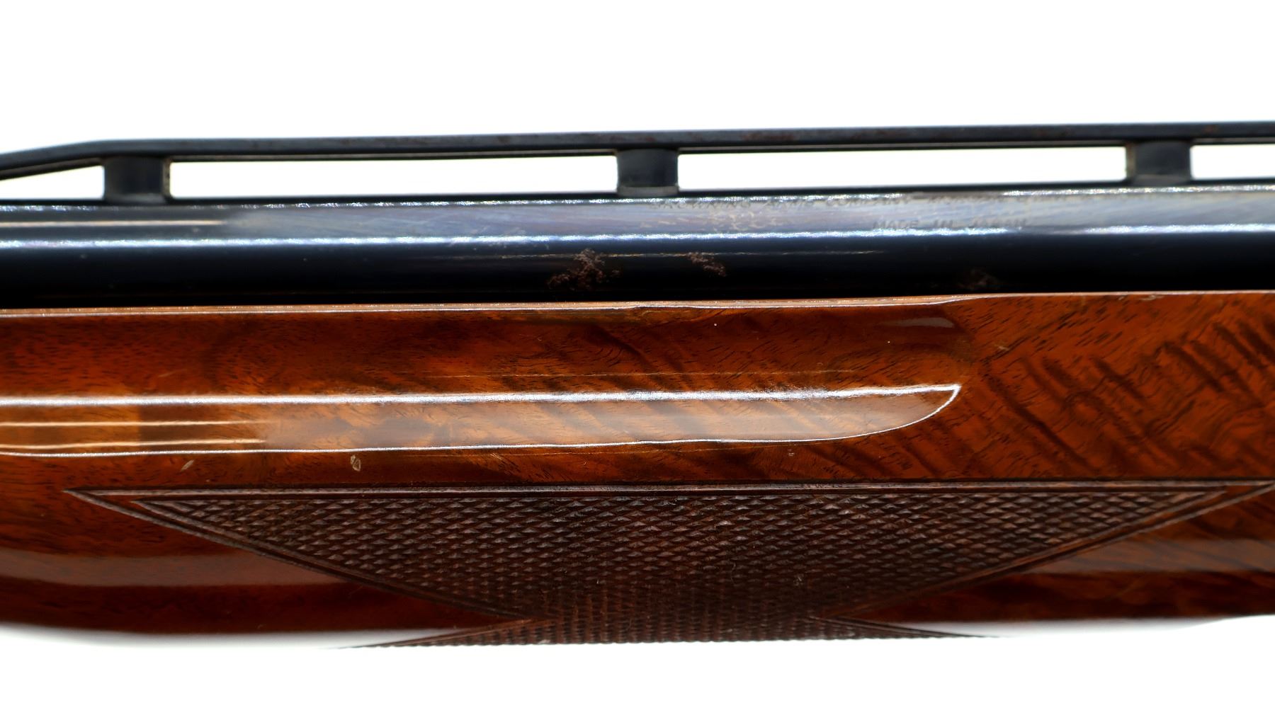 Main Description: Silver bead, Polish blued vent rib barrel with two large dents, silver engraved receiver with light rust spots, tang safety. Two piece gloss finish wood stocks, finger grooved checkered forearm and pistol grip, black vented rubber recoil pad, swivel studs.