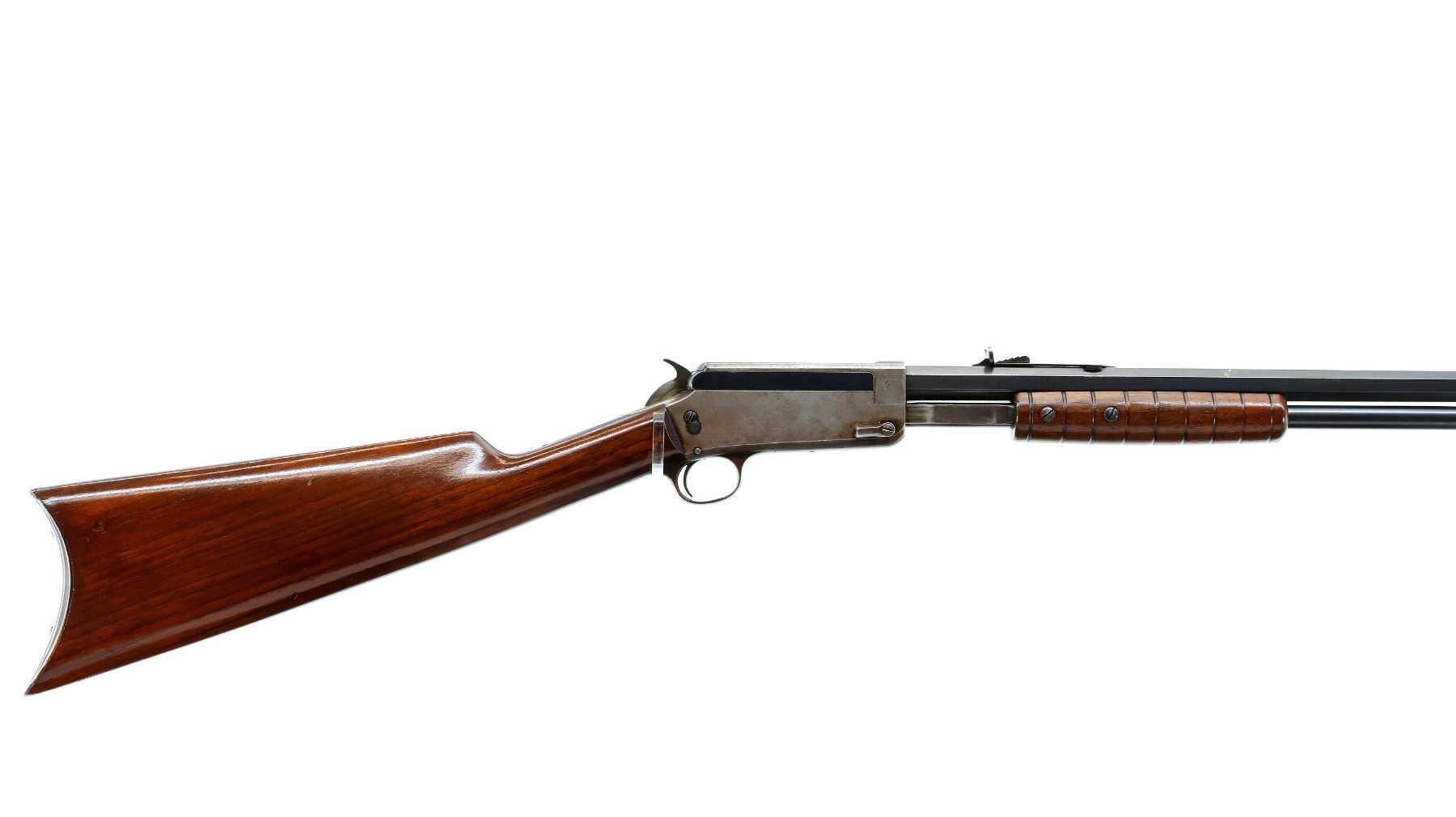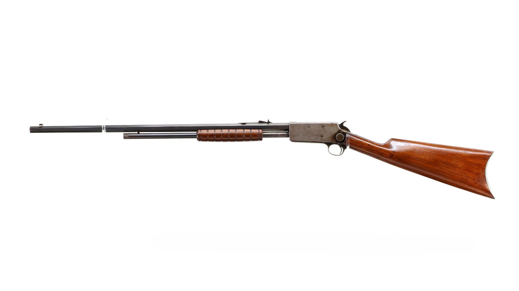 Main Description: Blade front sight, adjustable u notched rear sight, blued finish, octagon barrel, checkered spur hammer. Two piece wood stocks, grooved forearm, straight grip, smooth curved steel butt plate, 2/3rd length magtube.