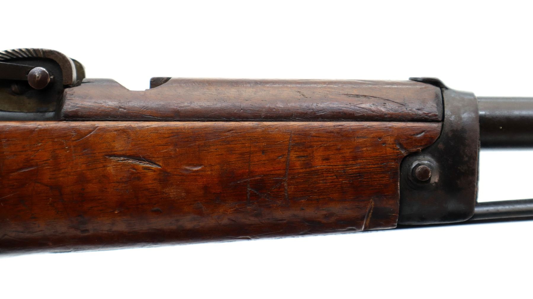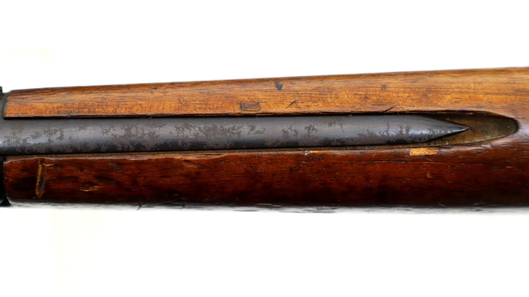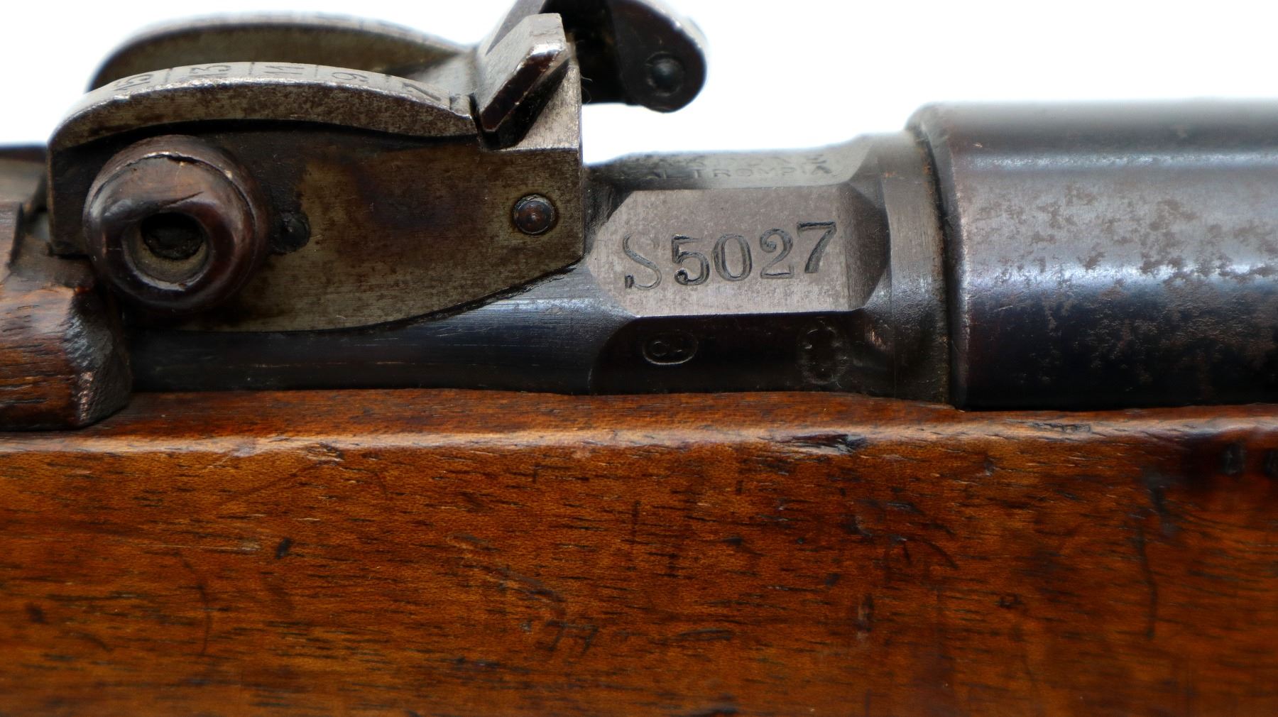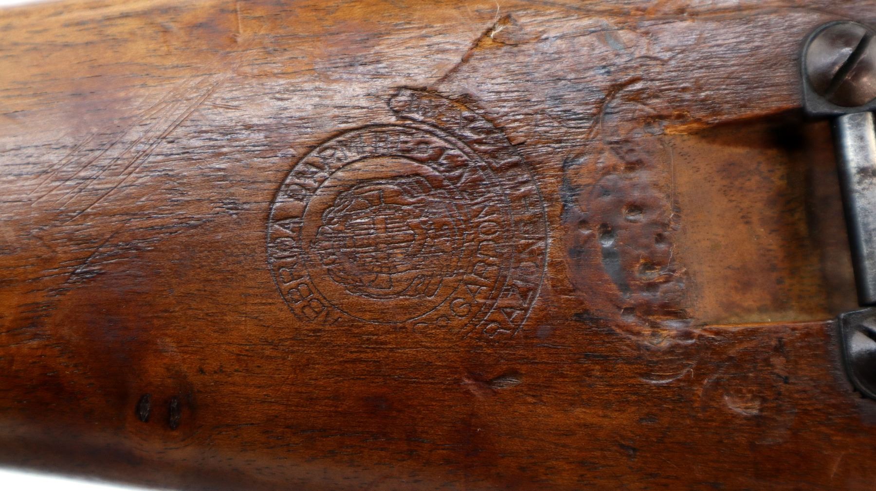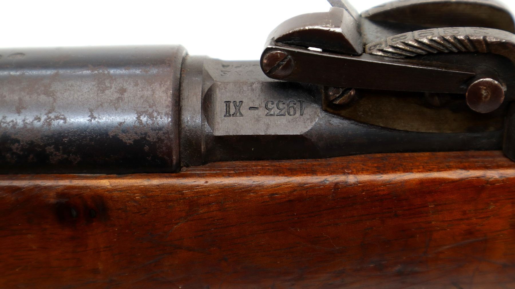 Main Description: Manufactured by Val Trompia 1933, stock matches. Blade front sight with ramp, adjustable u notched rear sight, blued finish, turned down bolt handle. Two piece full military wood stocks, straight grip, smooth steel butt plate with trap, left side of stock has large cartouche dated 1934, sling swivels, attached folding triangular bayonet.