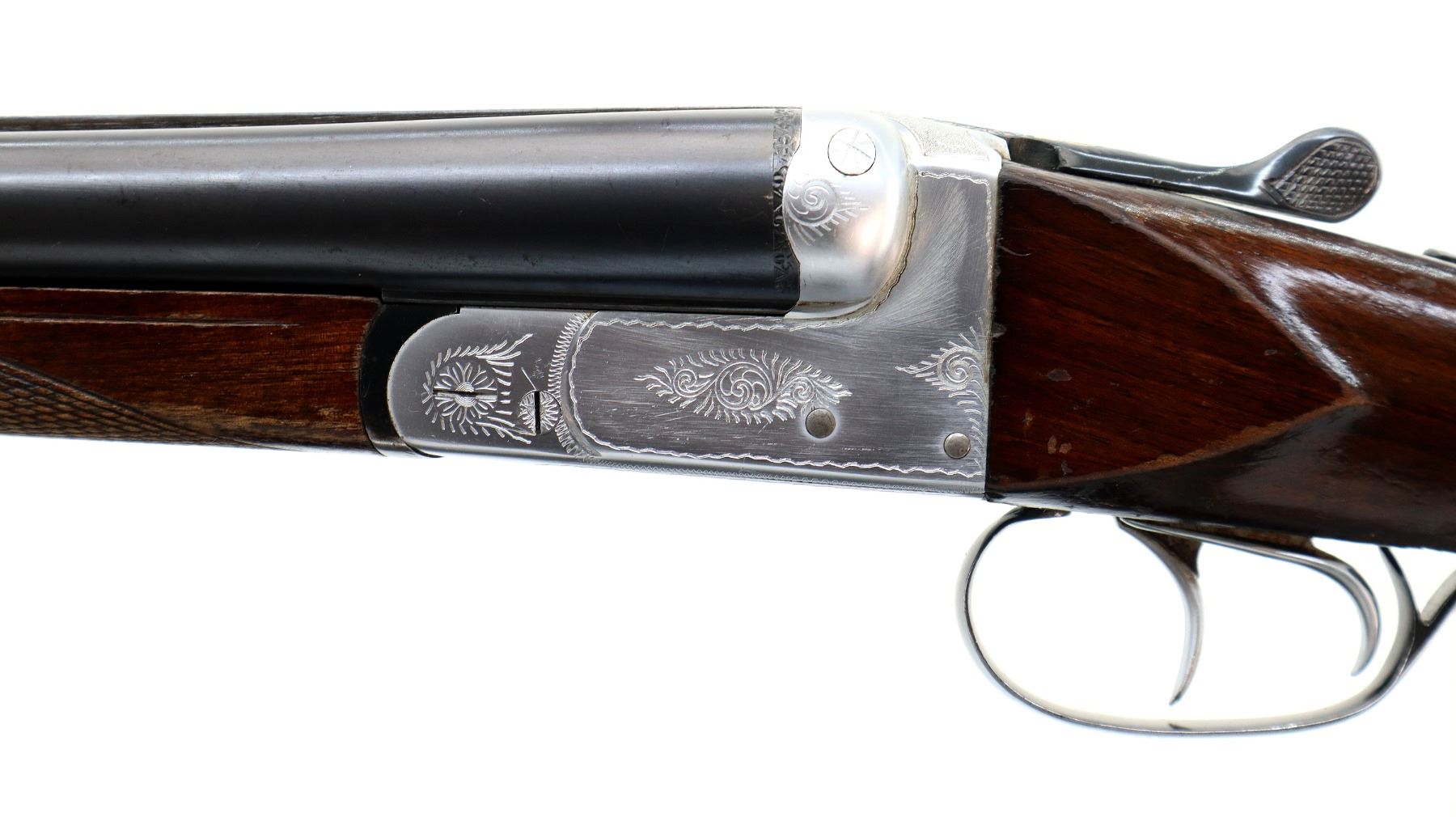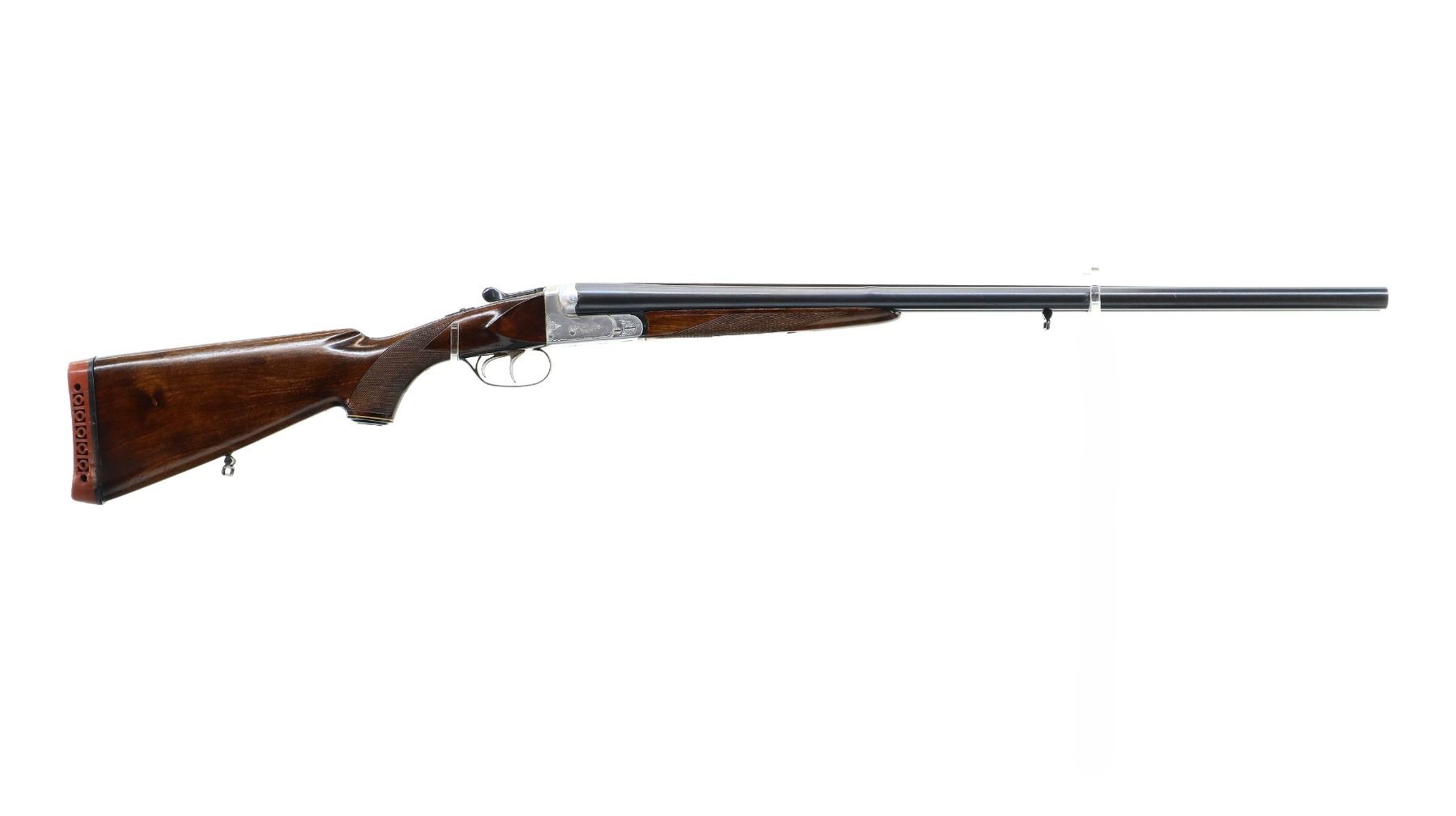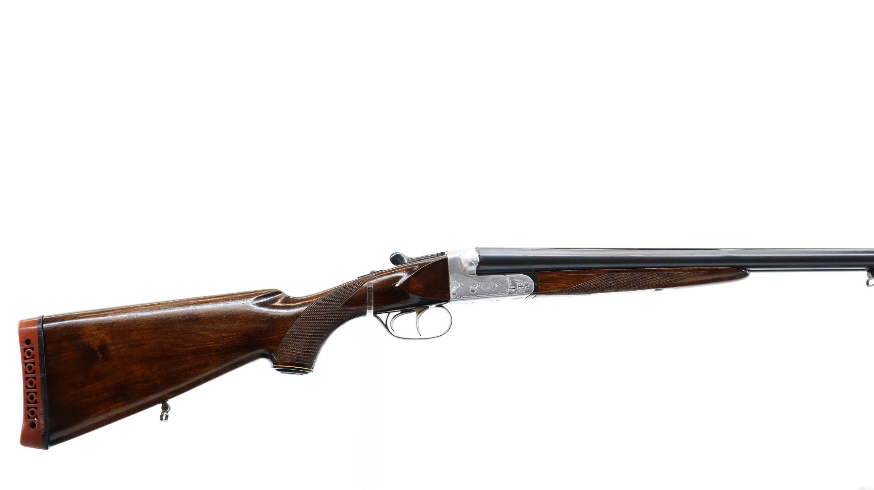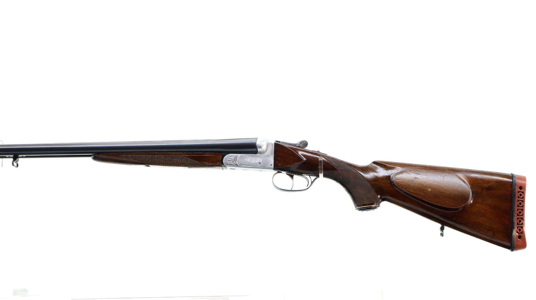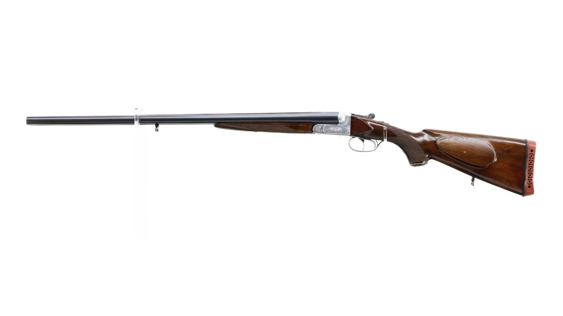 Main Description: Missing front bead hole is present, blued barrels with raised rib, automatic safety, extractor, double triggers. Silver engraved receiver. Two piece wood stocks, checkered forearm and pistol grip, European cheek rest, red vented rubber recoil pad which requires fitting, grip cap, sling swivels.