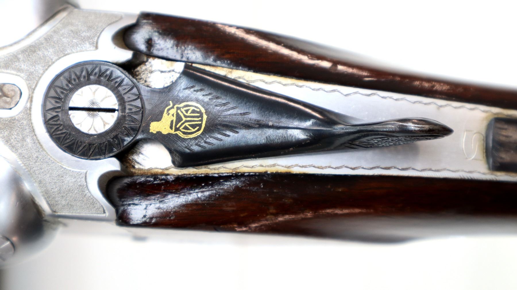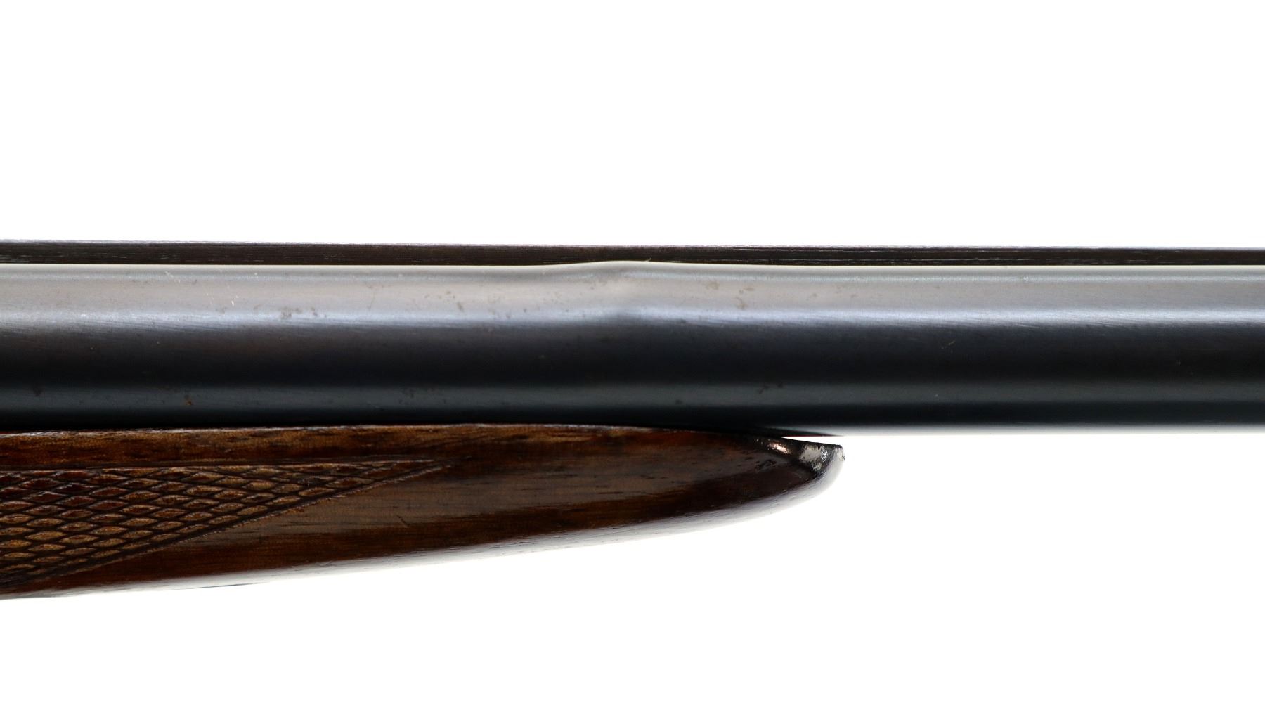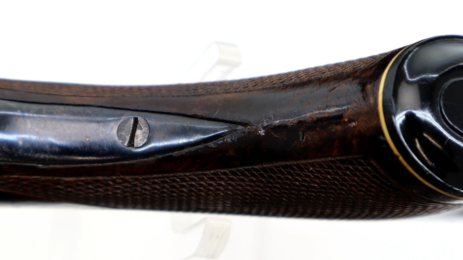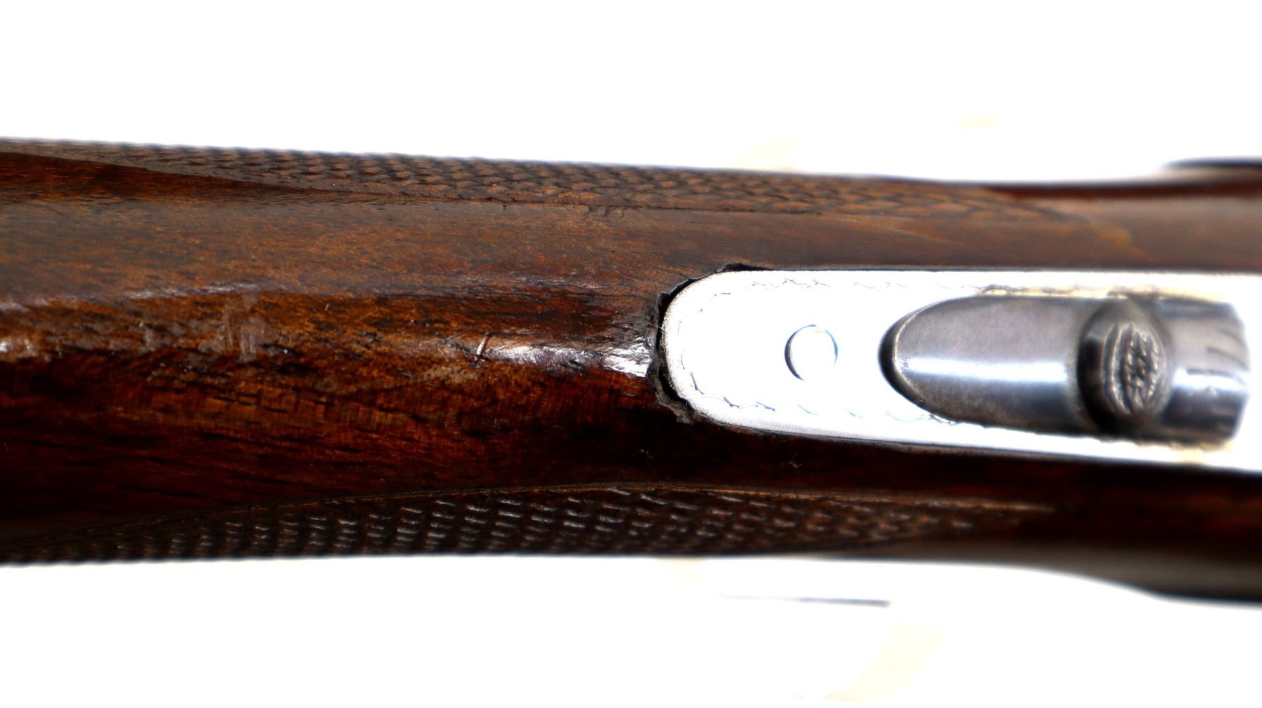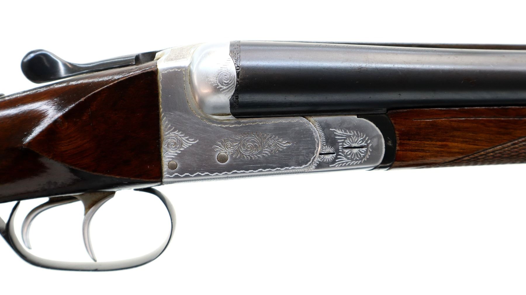 Main Description: Missing front bead hole is present, blued barrels with raised rib, automatic safety, extractor, double triggers. Silver engraved receiver. Two piece wood stocks, checkered forearm and pistol grip, European cheek rest, red vented rubber recoil pad which requires fitting, grip cap, sling swivels.