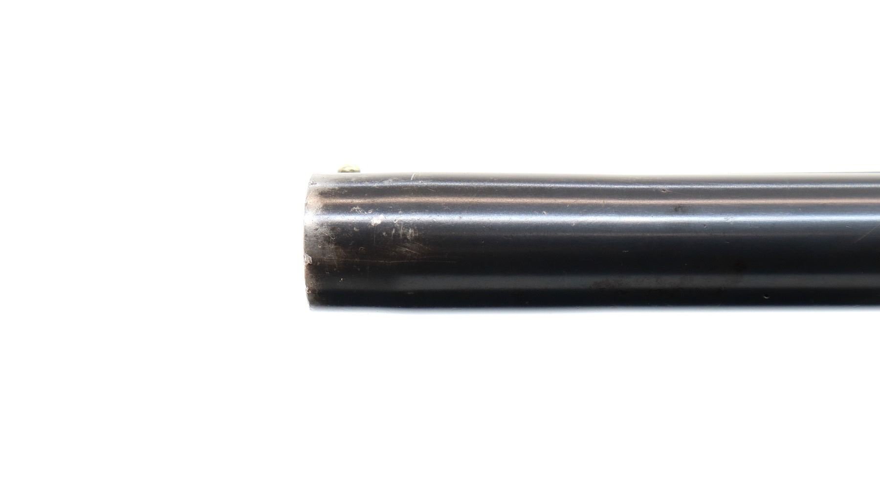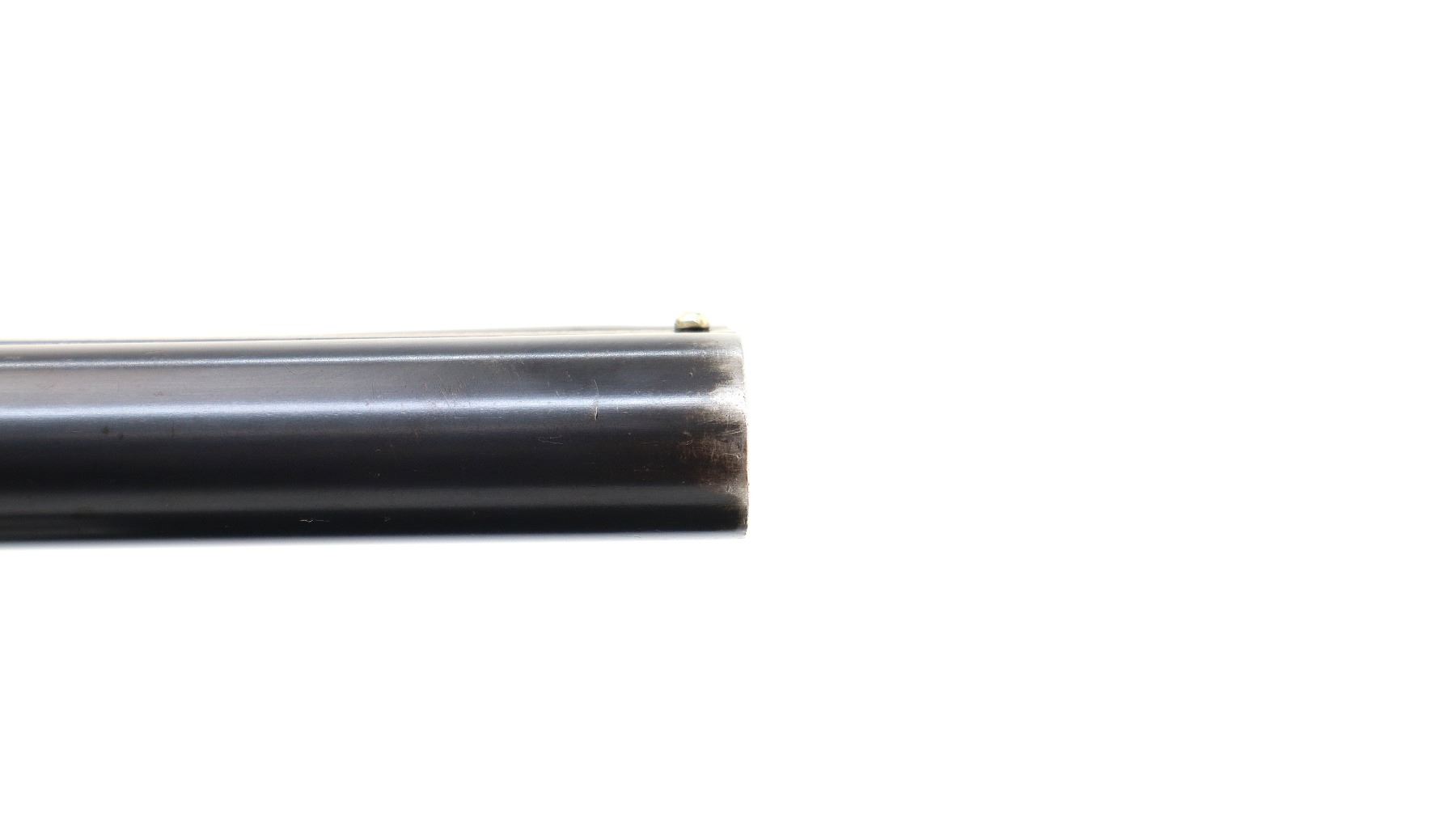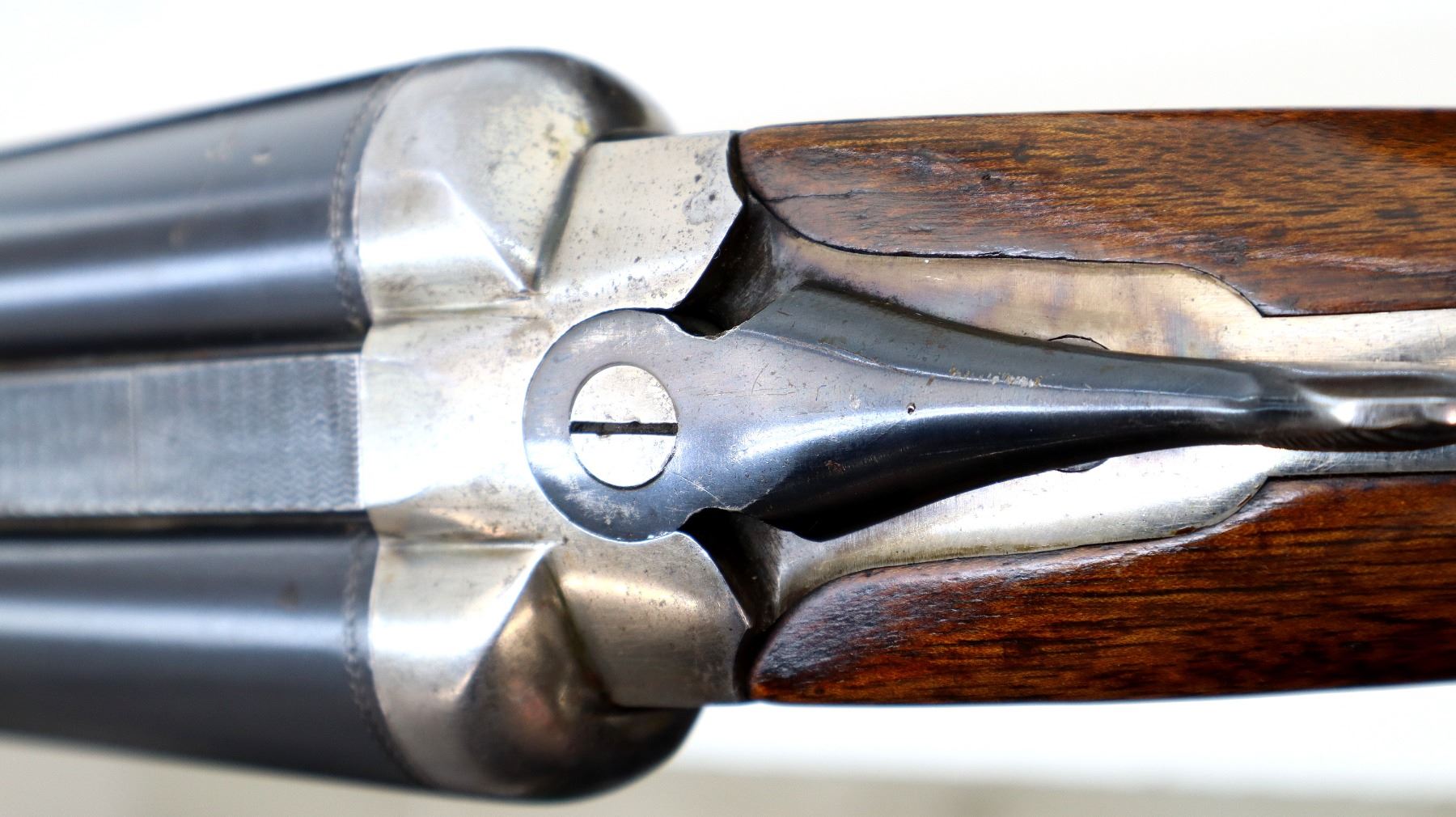 Main Description: Silver bead, blued barrels with raised rib, silver receiver, automatic safety, extractor, double triggers, front trigger is short. Two piece wood stocks, checkered forearm and straight grip cracked and repaired behind receiver, grooved black polymer butt plate, sling swivels.