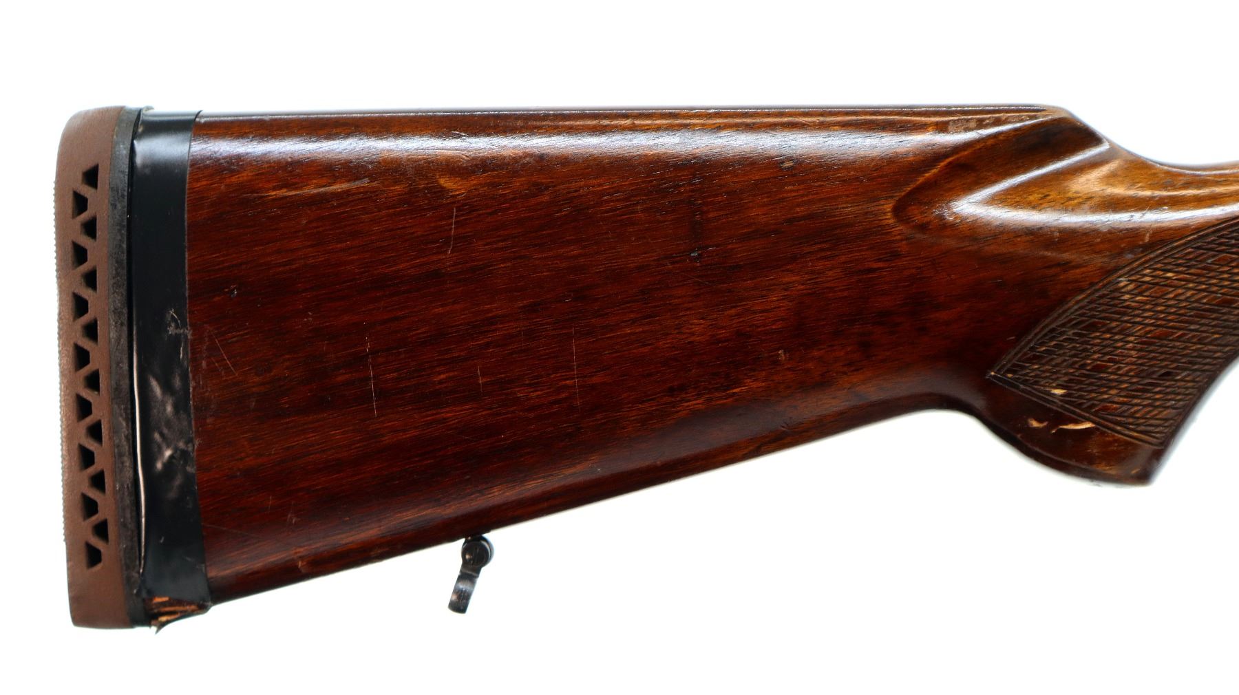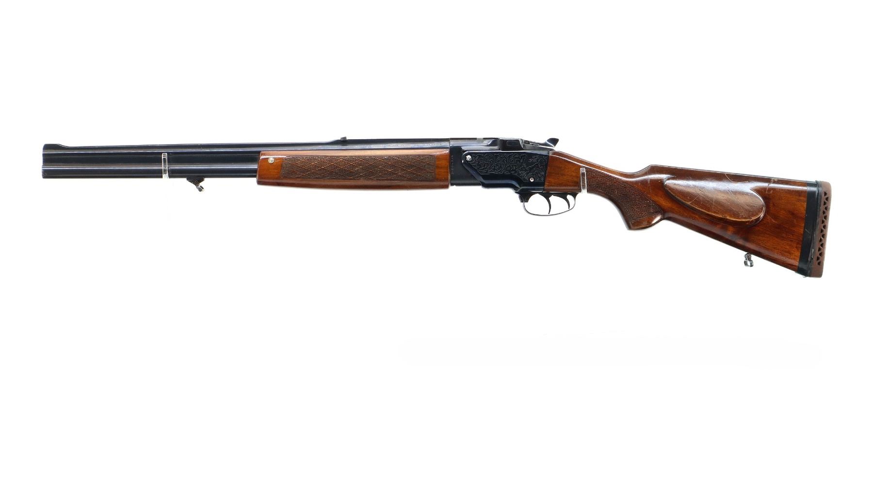 Main Description: Missing front sight, ramp present, adjustable u notched rear sight, blued finish, barrel has solid rib with integral scope base at rear, engraved receiver, automatic safety, extractor, double triggers. Two piece wood stocks, checkered forearm and pistol grip, stock is slightly loose, European cheek rest, brown vented rubber recoil pad wrapped with tape requires fitting. Sling swivels.