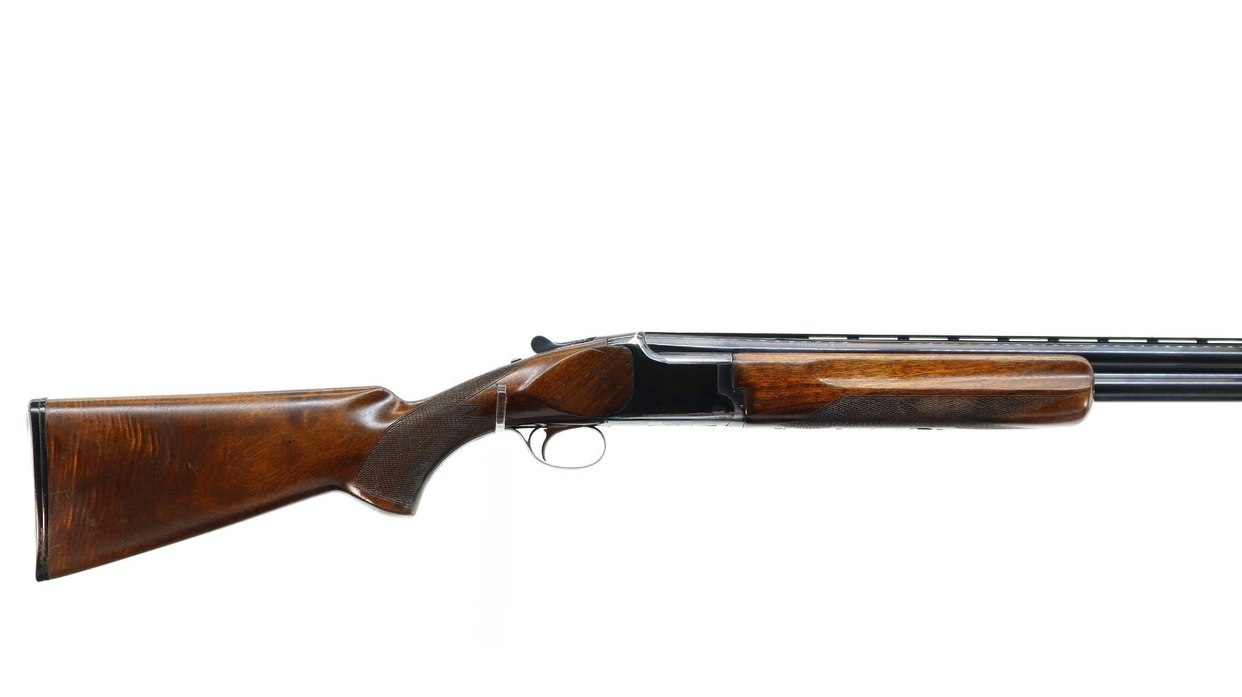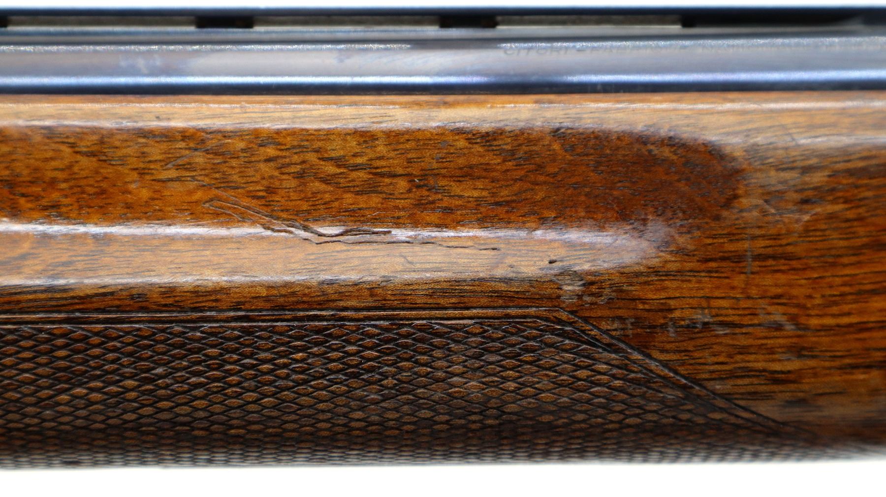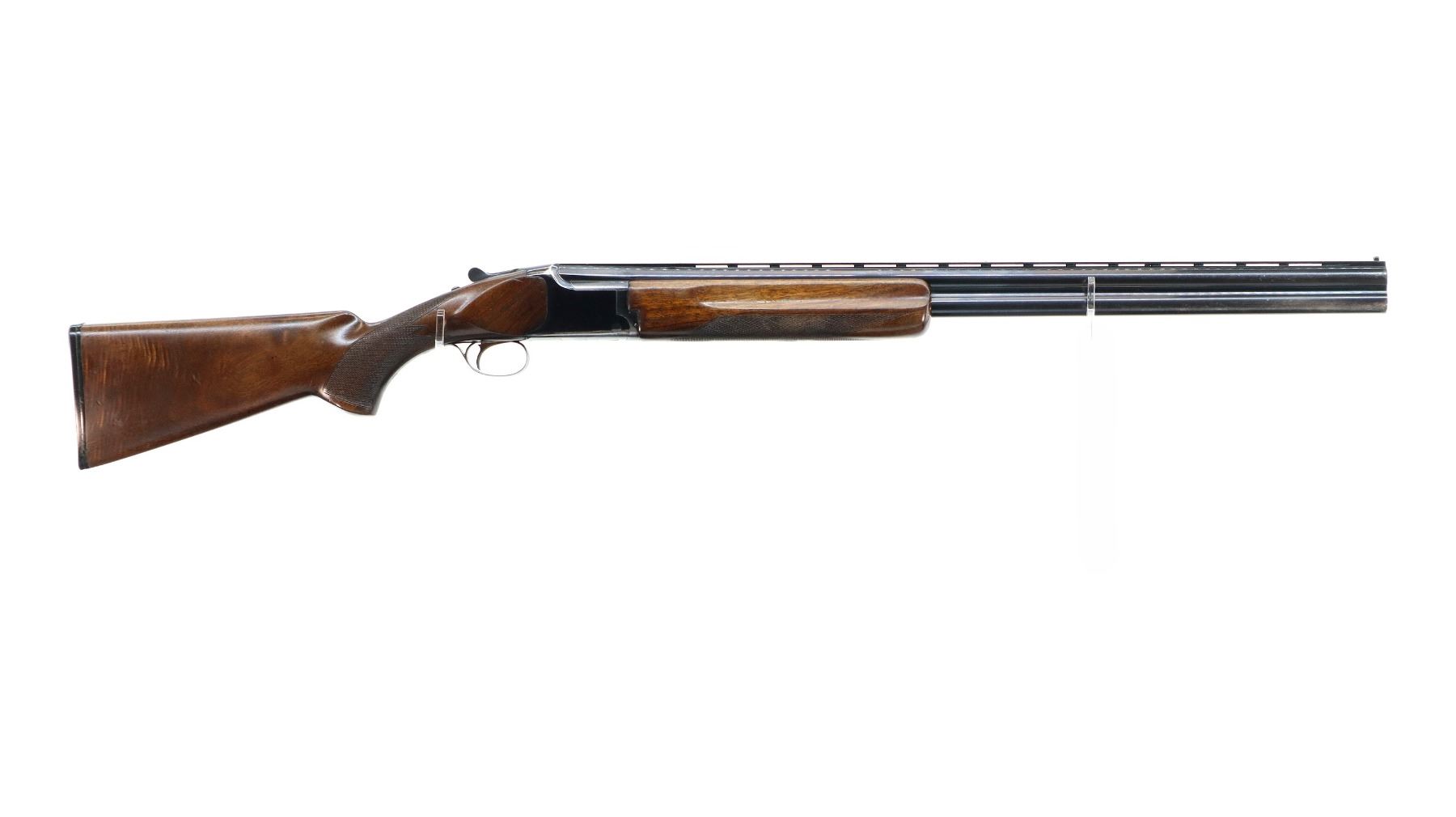 Main Description: Broken front bead, white mid rib bead, blued finish, vent rib, manual selective safety, ejectors, single gold inertia trigger. Two piece wood stocks, finger grooved checkered forearm cracked on right side, checkered pistol grip, Browning logo black polymer butt plate