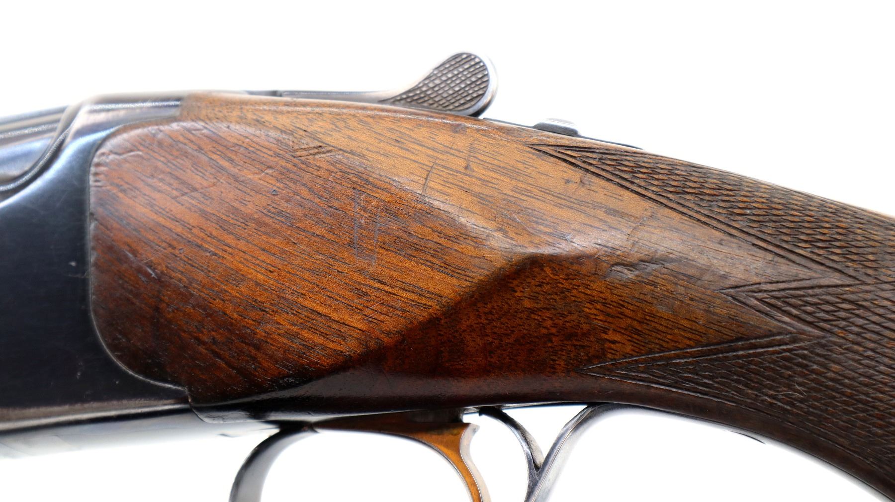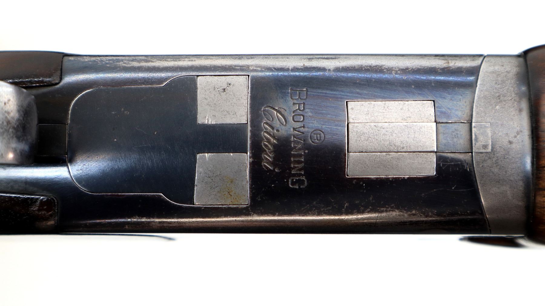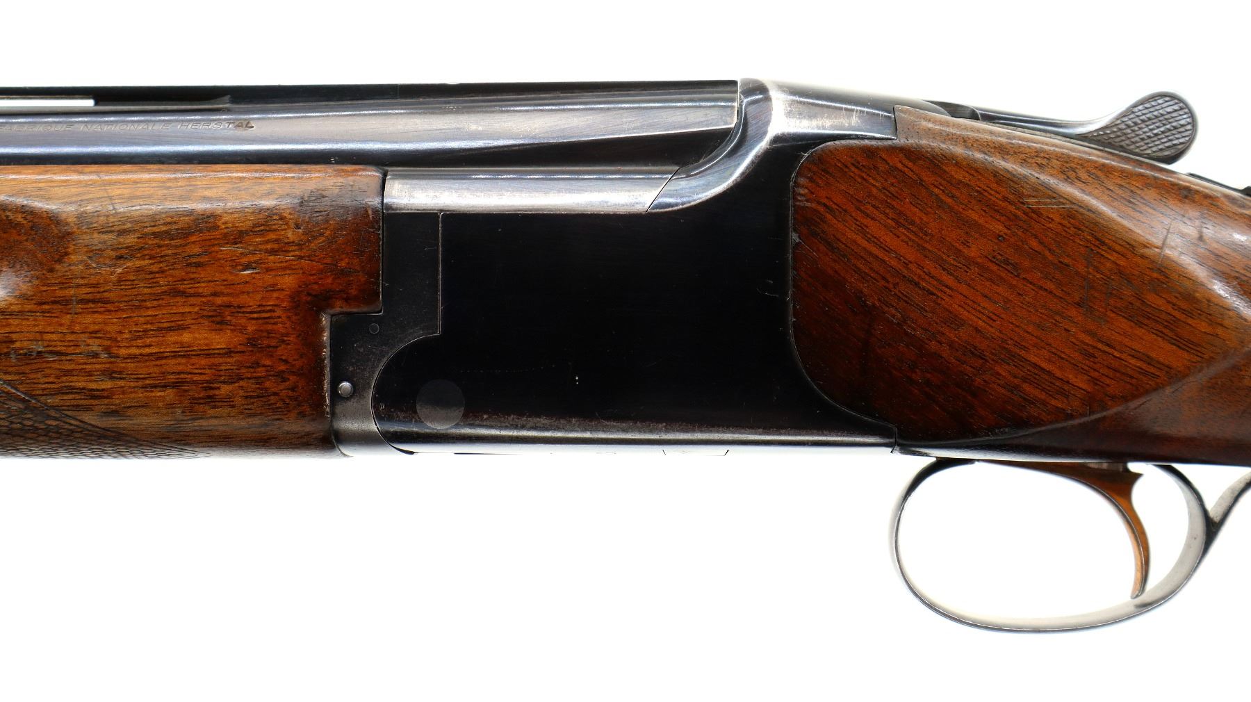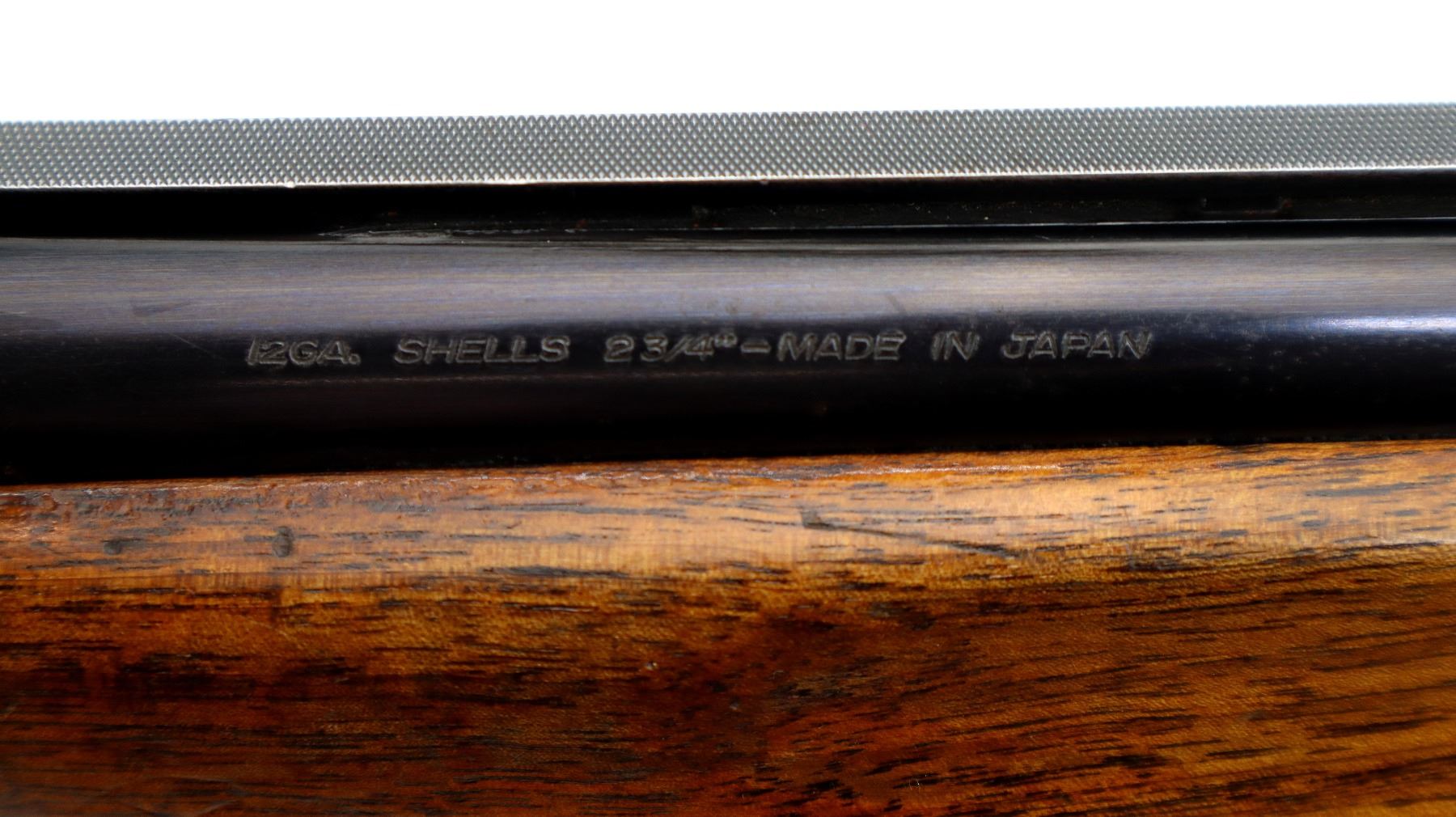 Main Description: Broken front bead, white mid rib bead, blued finish, vent rib, manual selective safety, ejectors, single gold inertia trigger. Two piece wood stocks, finger grooved checkered forearm cracked on right side, checkered pistol grip, Browning logo black polymer butt plate