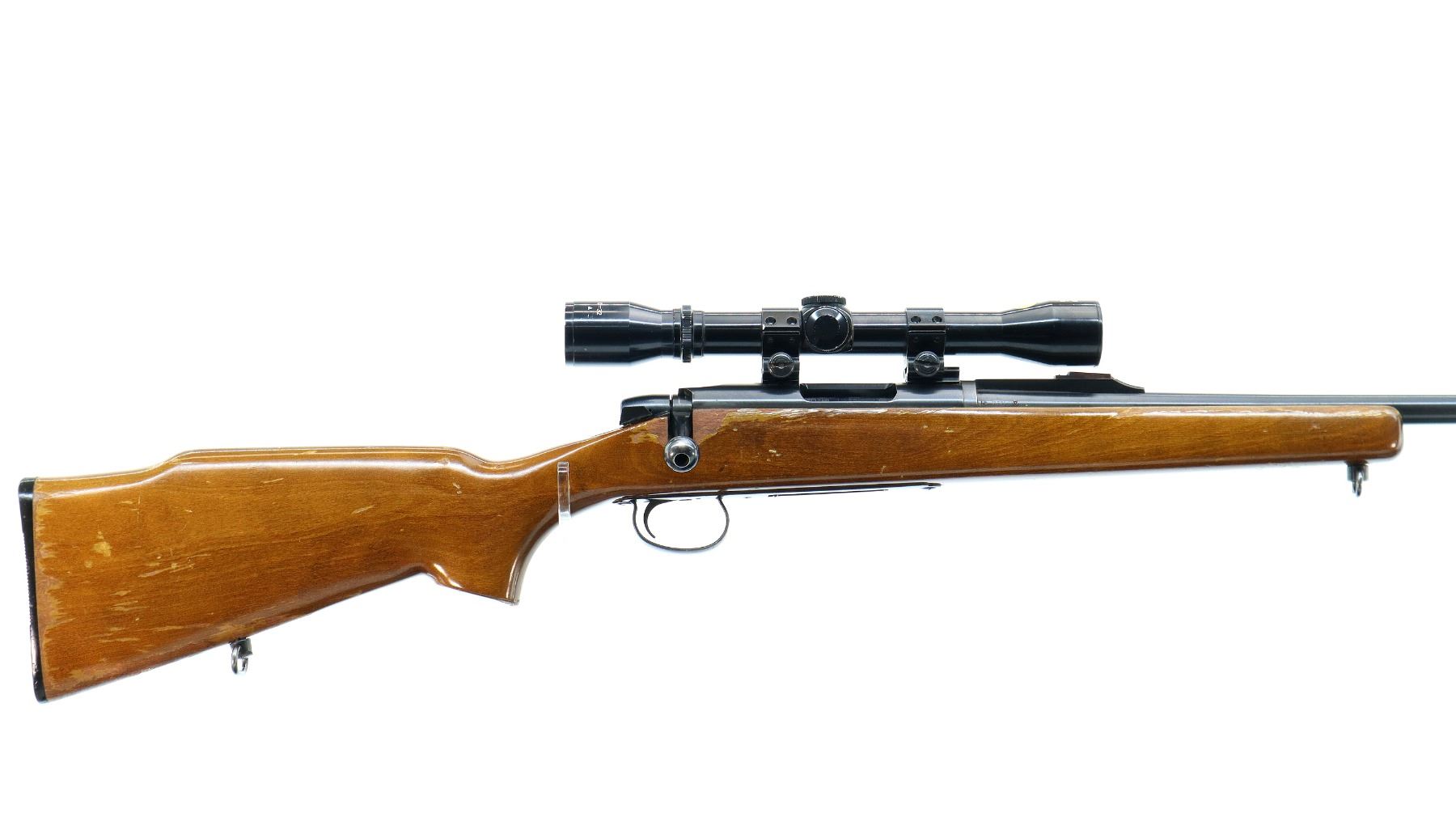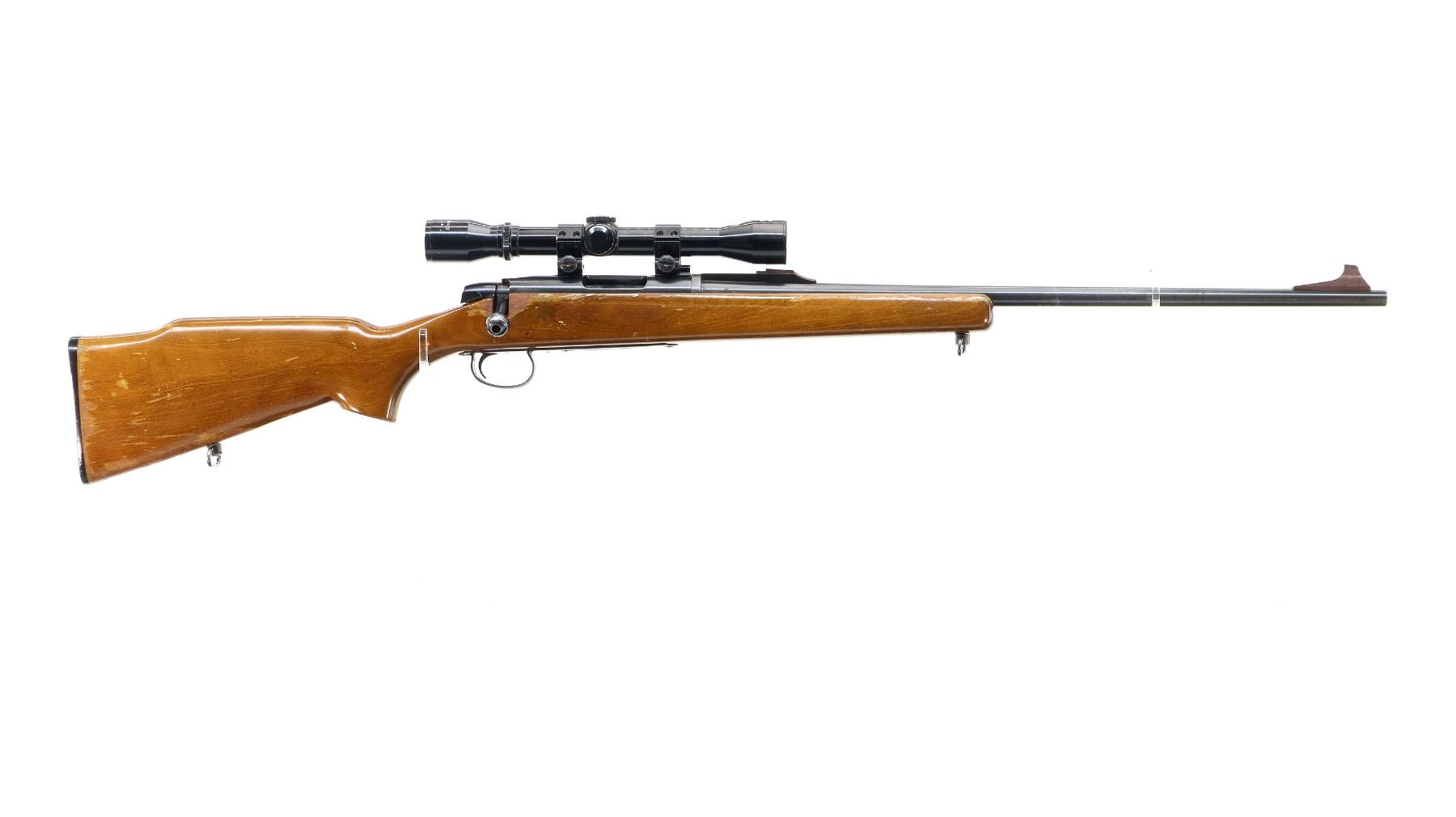 Main Description: Blade front sight with ramp, includes rear sight base missing top portion, blued finish, receiver drilled and tapped with Calic Hunter 4 Power scope installed, clear optics with three post reticle. One piece wood stock, pistol grip, raised comb, grooved black polymer butt plate, sling swivels.