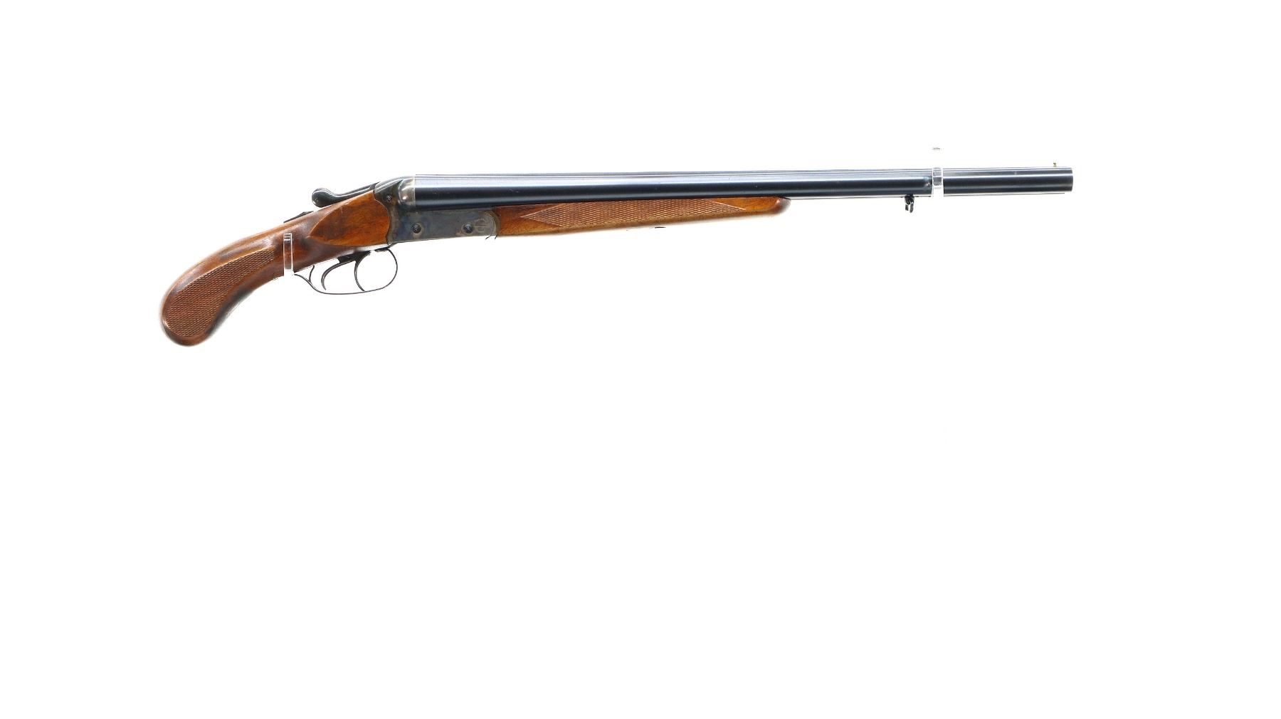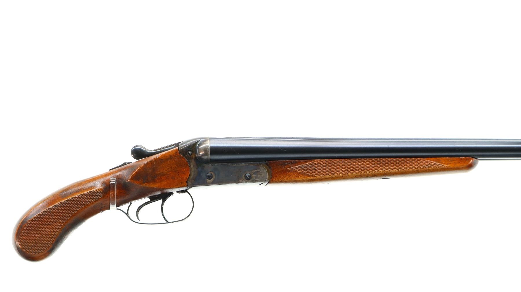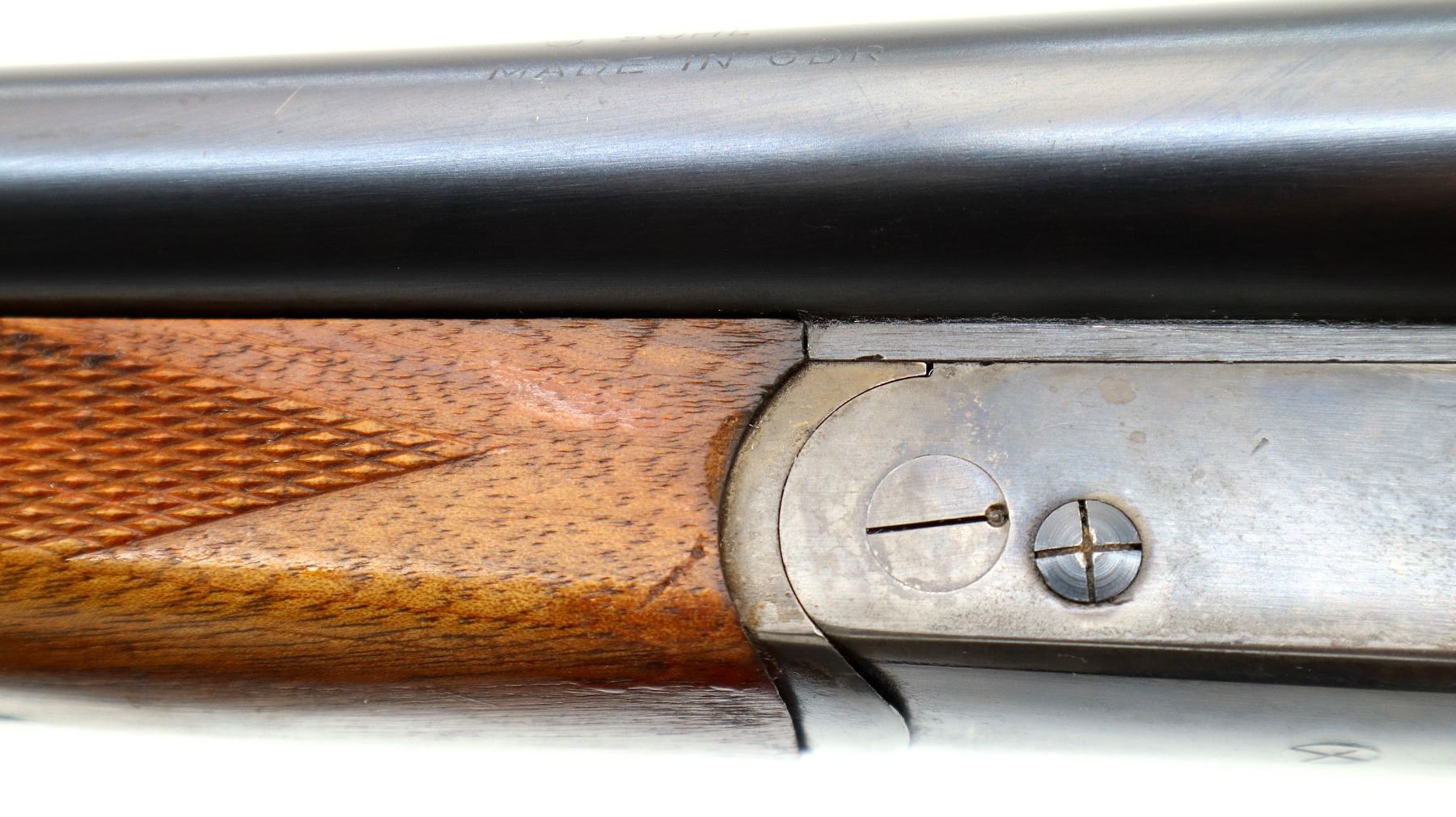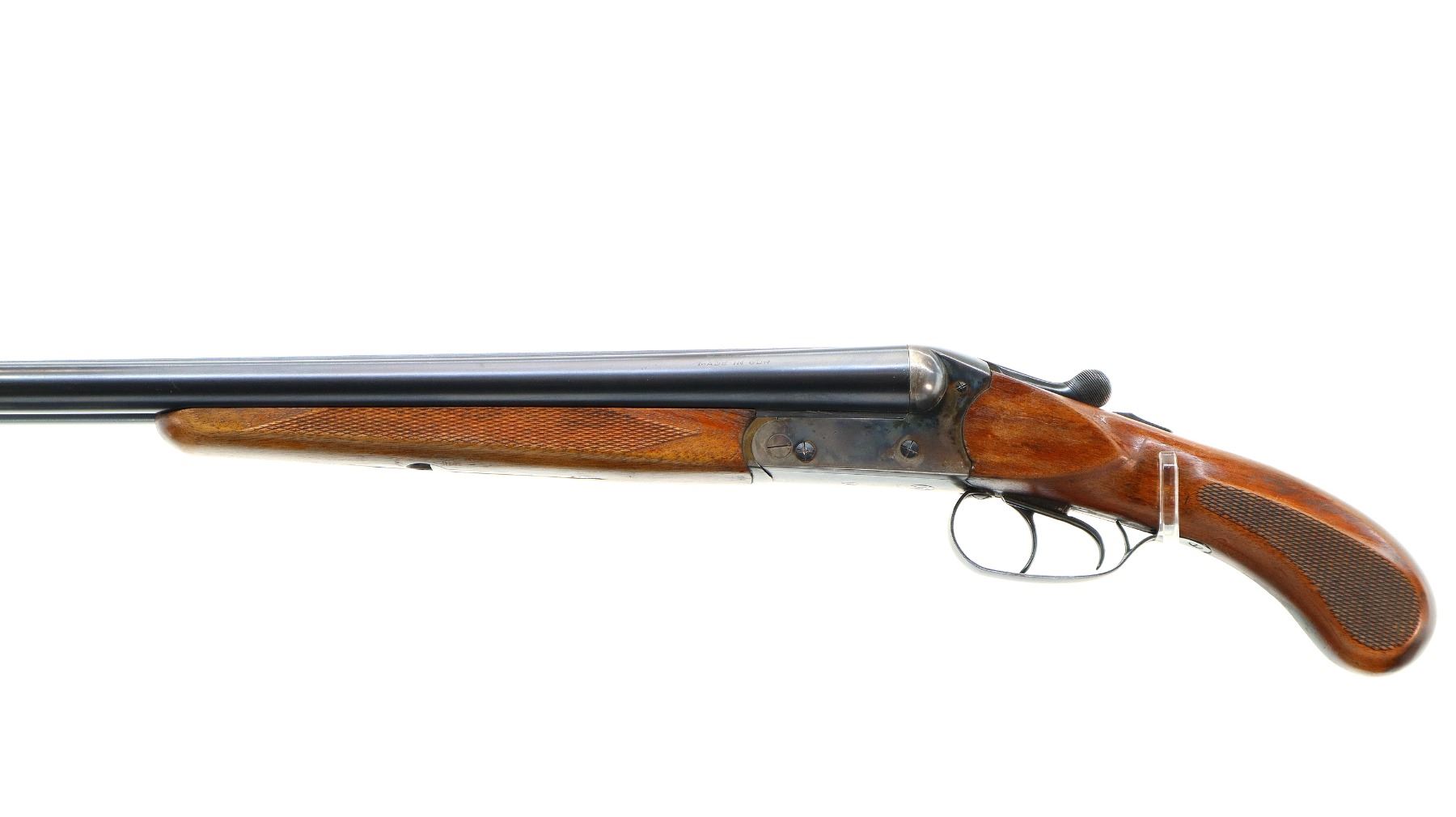 Main Description: Brass bead, blued barrels with raised rib, colour case hardened receiver, automatic safety, double triggers. Two piece wood stocks, checkered forearm and pistol grip cracked and repaired beside trigger guard, front sling swivel only.