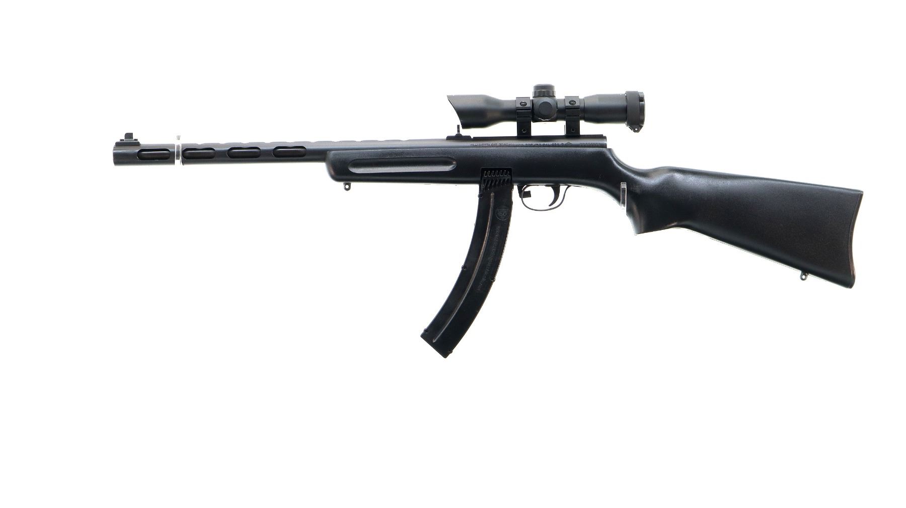 Main Description: Blade front sight with ramp, adjustable u notched rear sight, Satin blued metal finish. One piece receiver and ventilated barrel shroud with 4x32 scope installed, clear optics with range finding reticle, illuminated red and green which functions. One piece black synthetic stock, finger grooved forearm, pistol grip, smooth black polymer butt plate, grip cap, swivel studs.