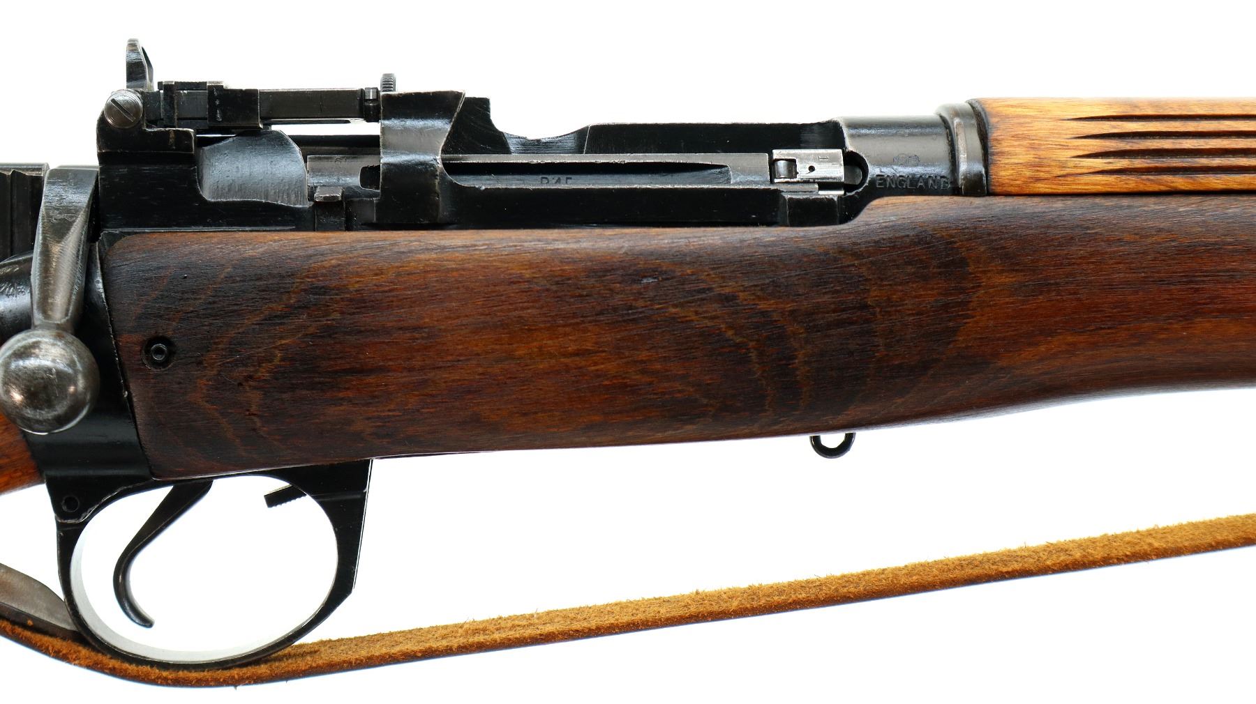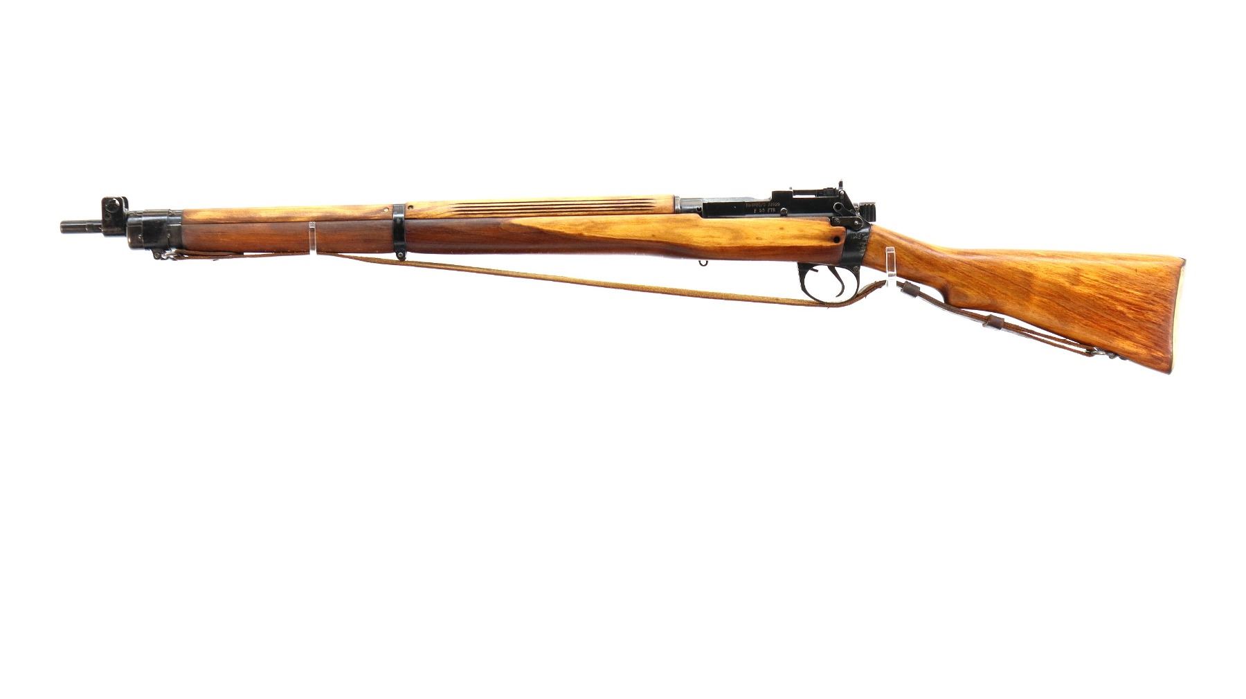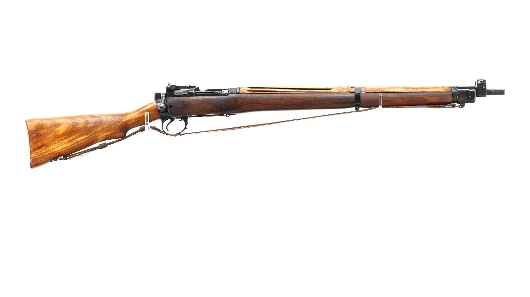 Main Description: Manufactured by M47 BSA 1943, visible numbers match. Blade front sight with hood and ramp, adjustable milled rear peep sight, black painted metal finish. Four piece full military wood stocks, grooved rear handguard, pistol grip, smooth brass butt plate with trap, sling swivels with brown leather sling, bayonet lugs.