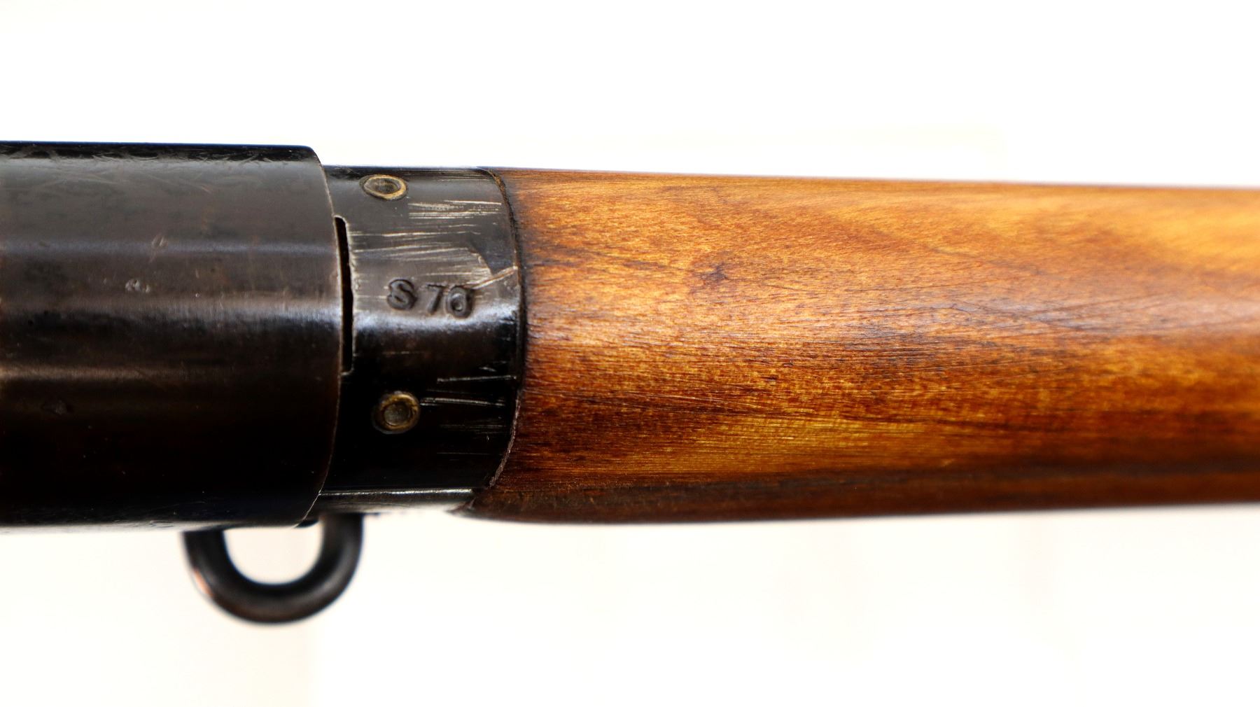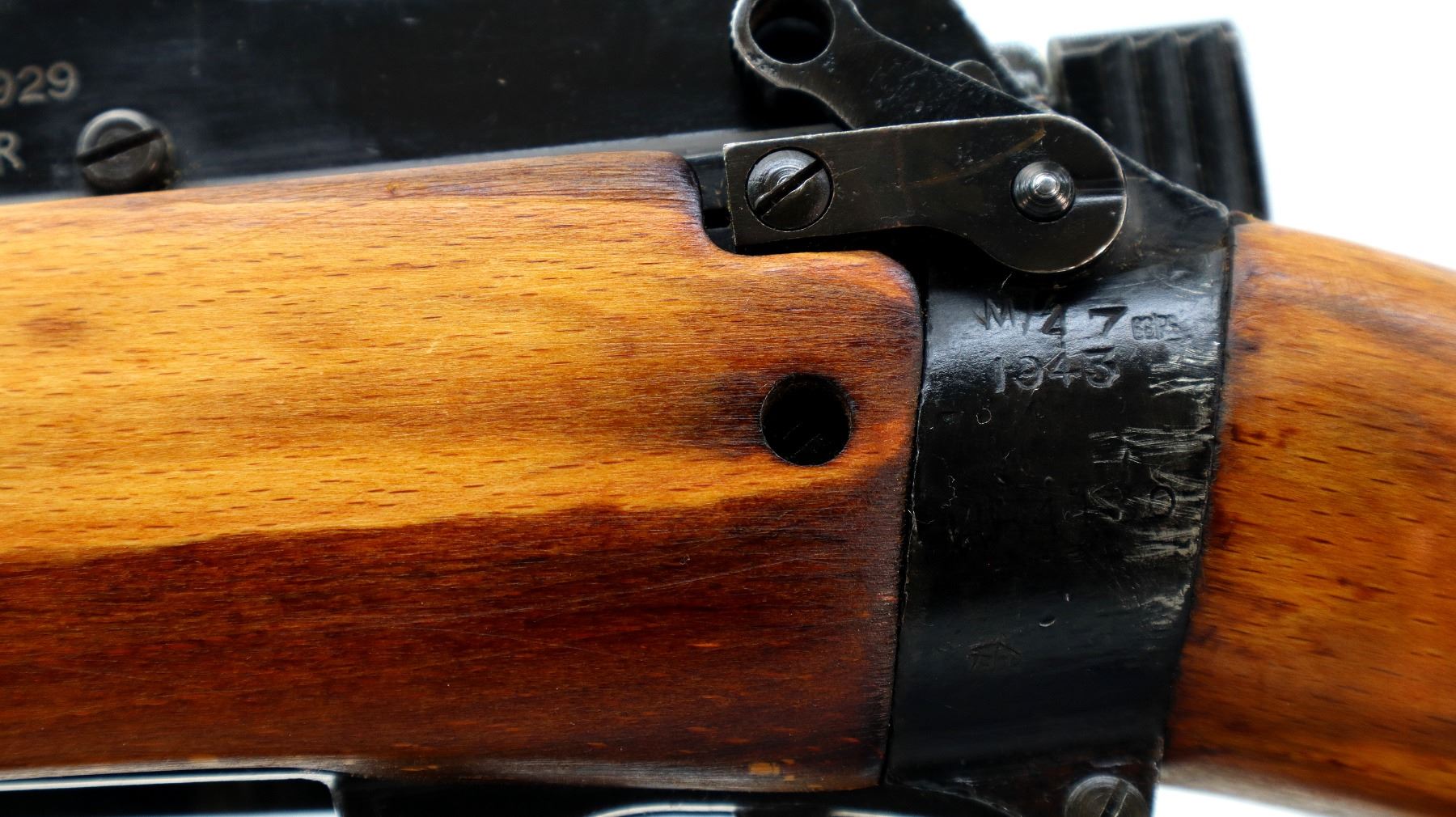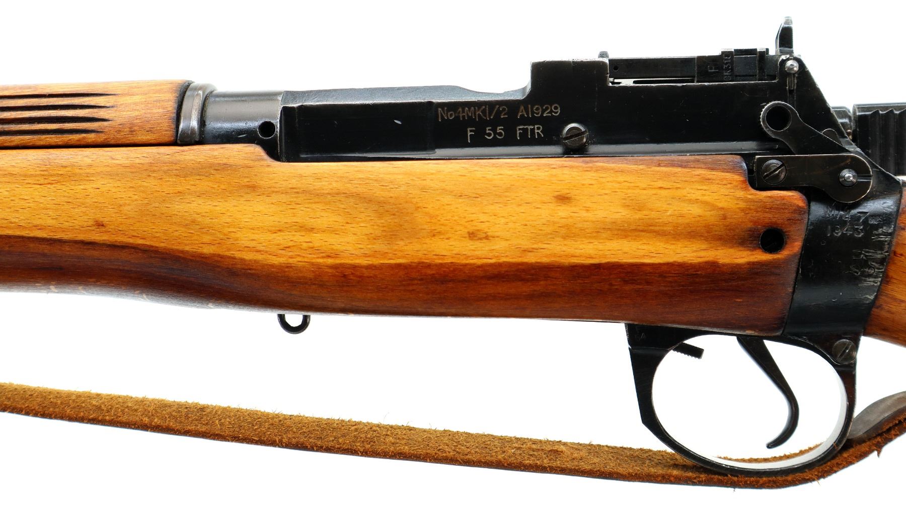 Main Description: Manufactured by M47 BSA 1943, visible numbers match. Blade front sight with hood and ramp, adjustable milled rear peep sight, black painted metal finish. Four piece full military wood stocks, grooved rear handguard, pistol grip, smooth brass butt plate with trap, sling swivels with brown leather sling, bayonet lugs.