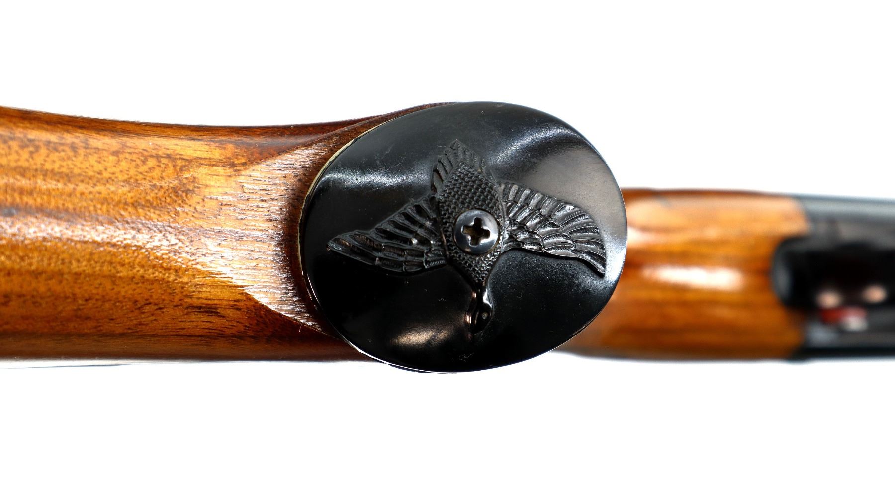 Main Description: White front and silver mid rib beads, blued finish, vent rib. Two piece wood stocks, finger grooved checkered forearm and pistol grip, red vented rubber recoil pad, 14.25" LOP, grip cap, trigger has a removable shoe installed.