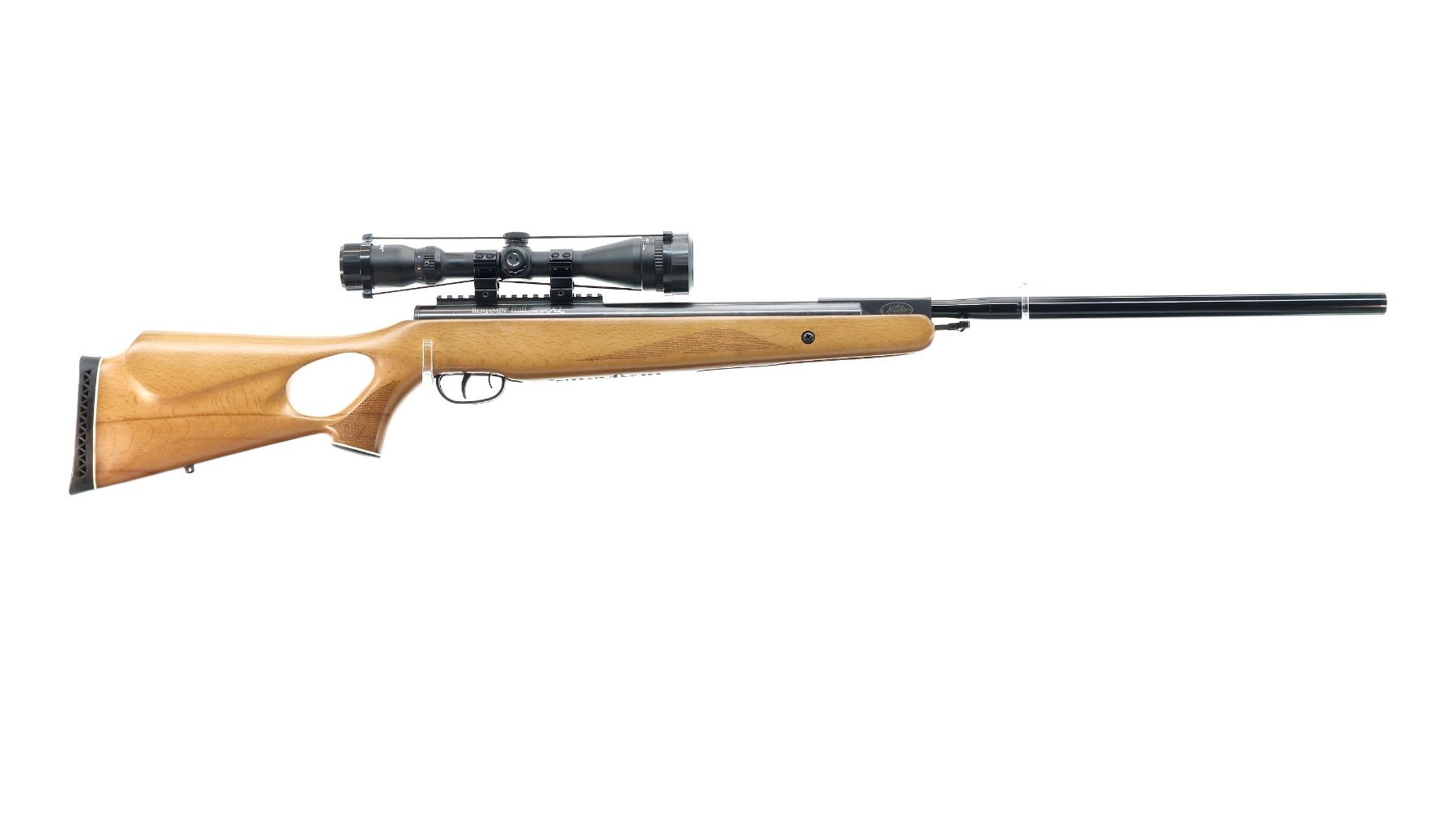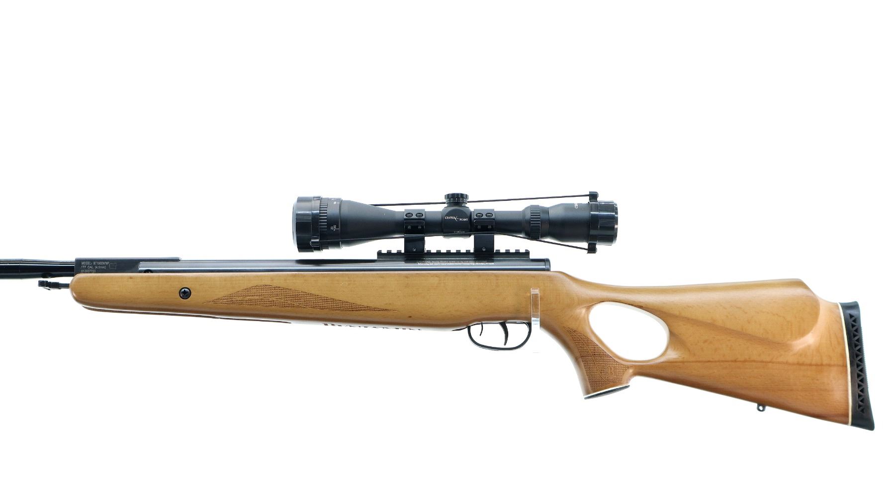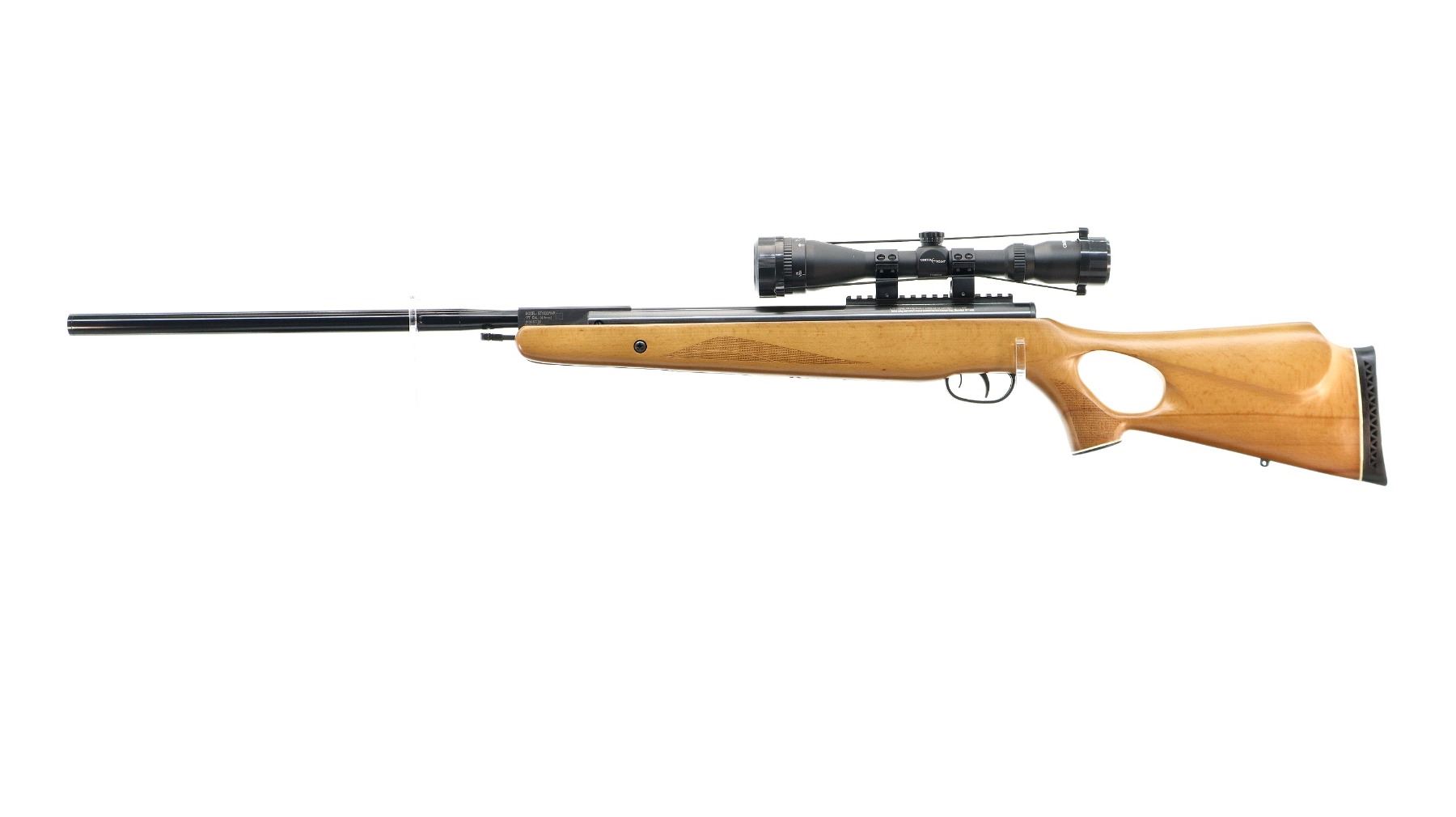 Main Description: No sights, blued finish, black alloy barrel shroud, receiver has integral scope rail with Center Point 3-9x40 AO scope installed, clear optics with duplex reticle with dots. One piece wood stock, checkered forearm and ambi thumb hole pistol grip and cheek rest, black vented rubber recoil pad, grip cap, rear swivel stud front swivel.
