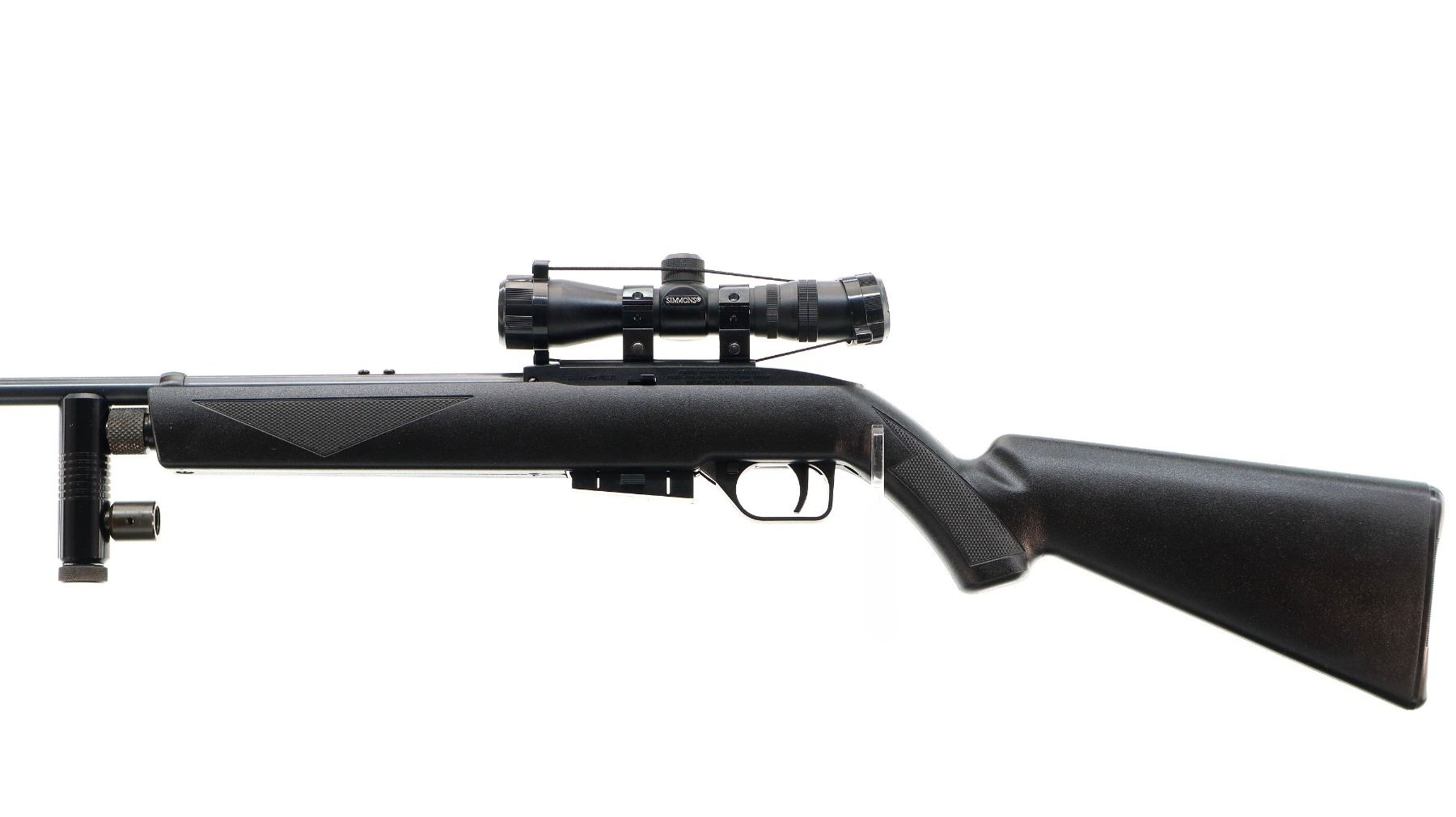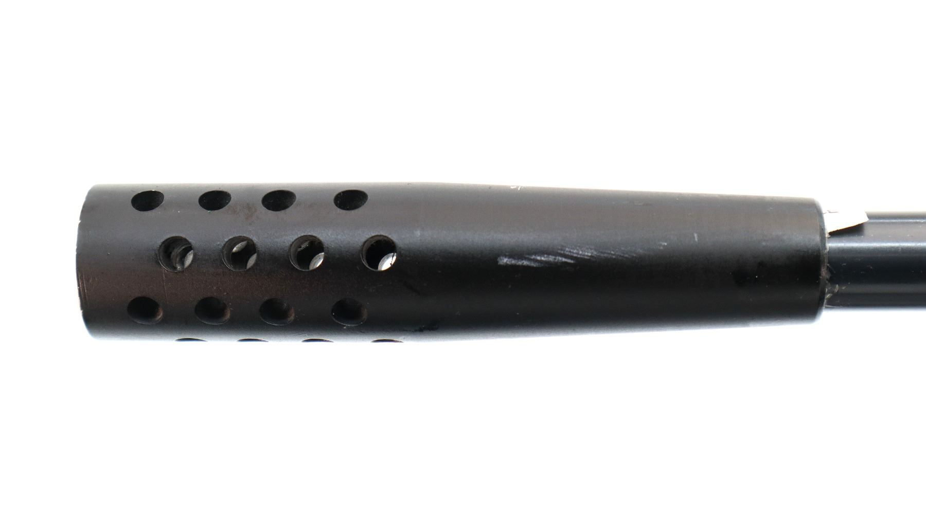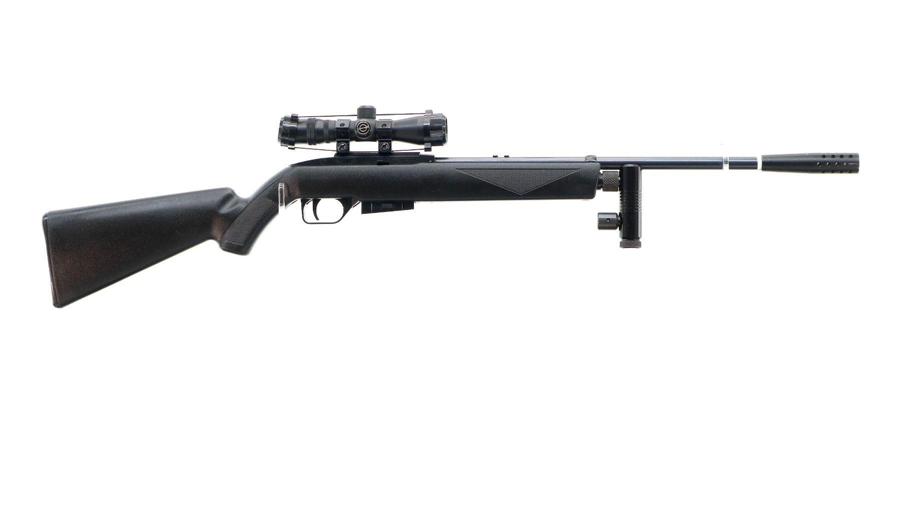 Main Description: No sights, blued barrel with ported alloy shroud, grooved receiver with Simmons Mini 4x28 scope installed, clear optics with duplex crosshair. Has been modified to external Air cylinder. One piece black synthetic stock, checkered forearm and pistol grip, grooved black polymer butt plate