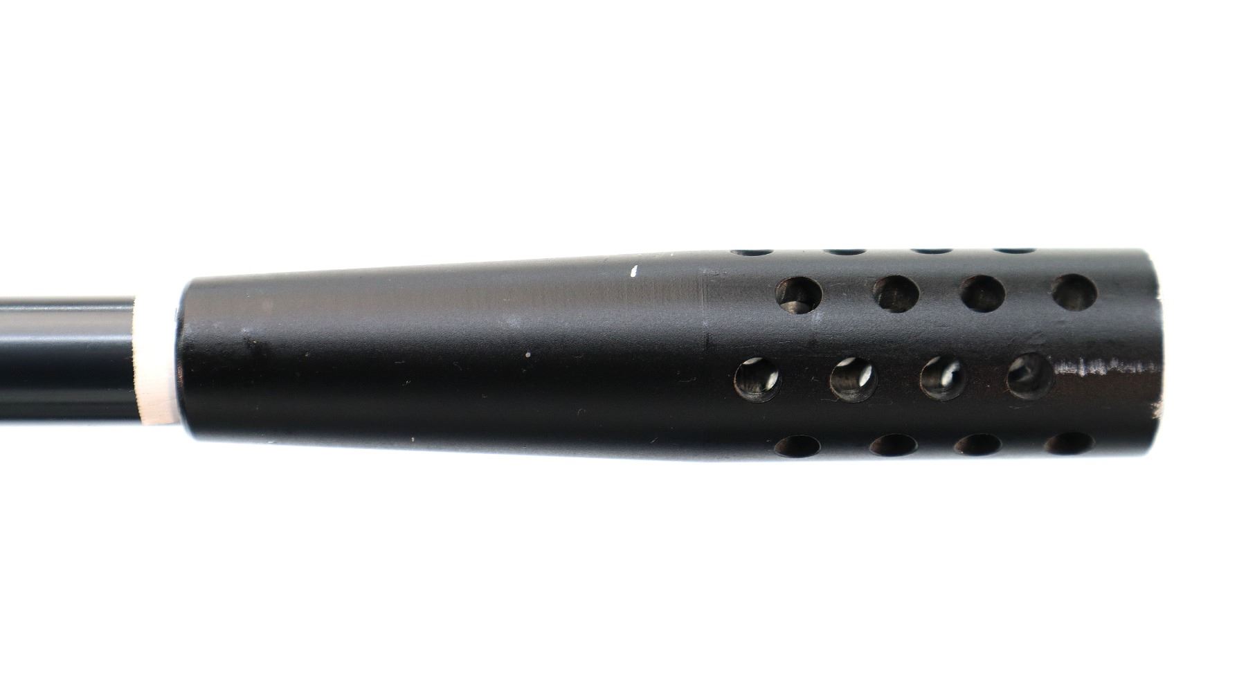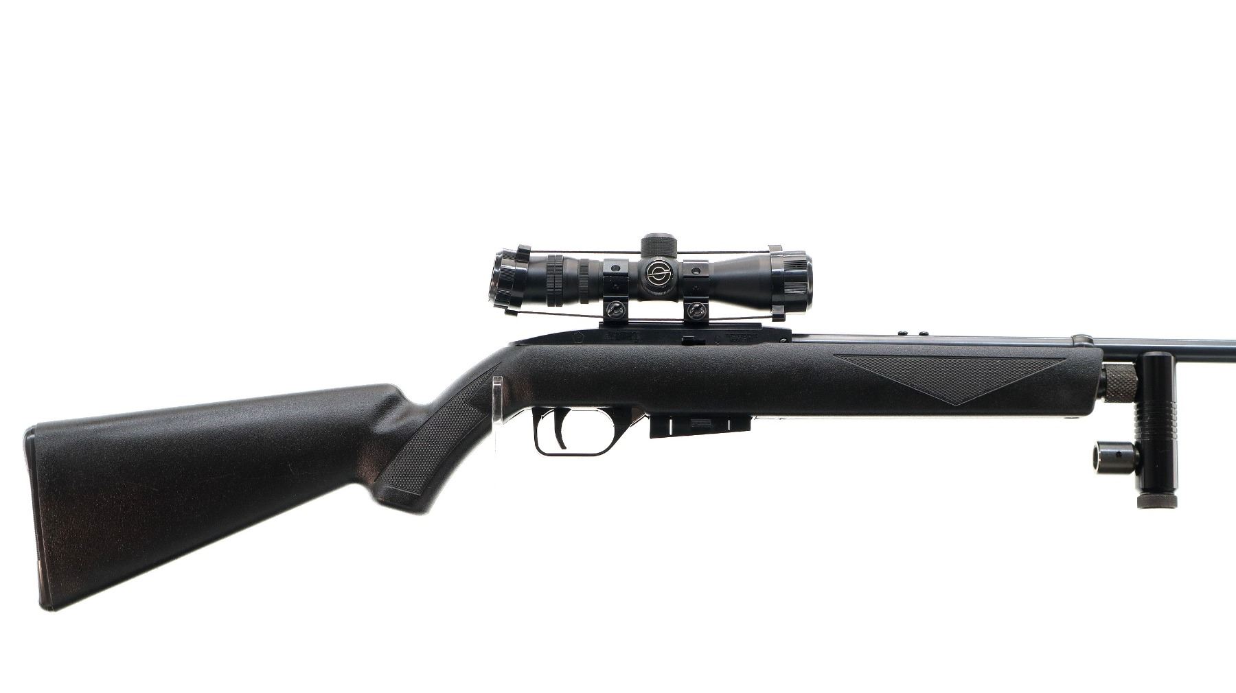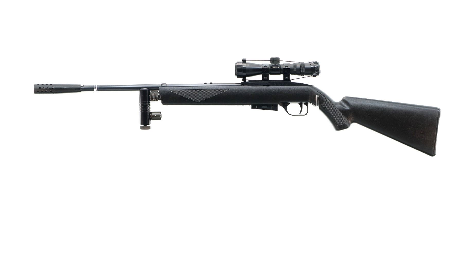 Main Description: No sights, blued barrel with ported alloy shroud, grooved receiver with Simmons Mini 4x28 scope installed, clear optics with duplex crosshair. Has been modified to external Air cylinder. One piece black synthetic stock, checkered forearm and pistol grip, grooved black polymer butt plate