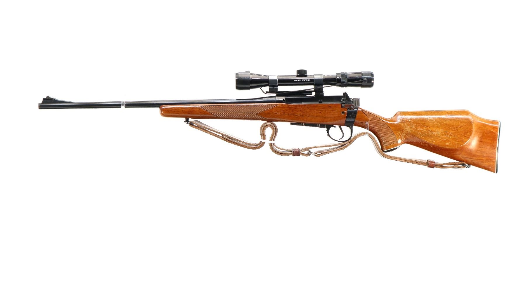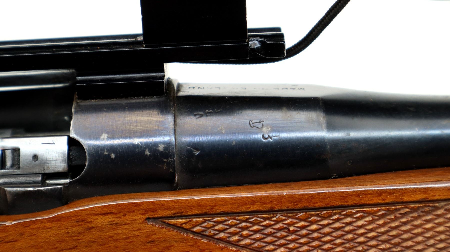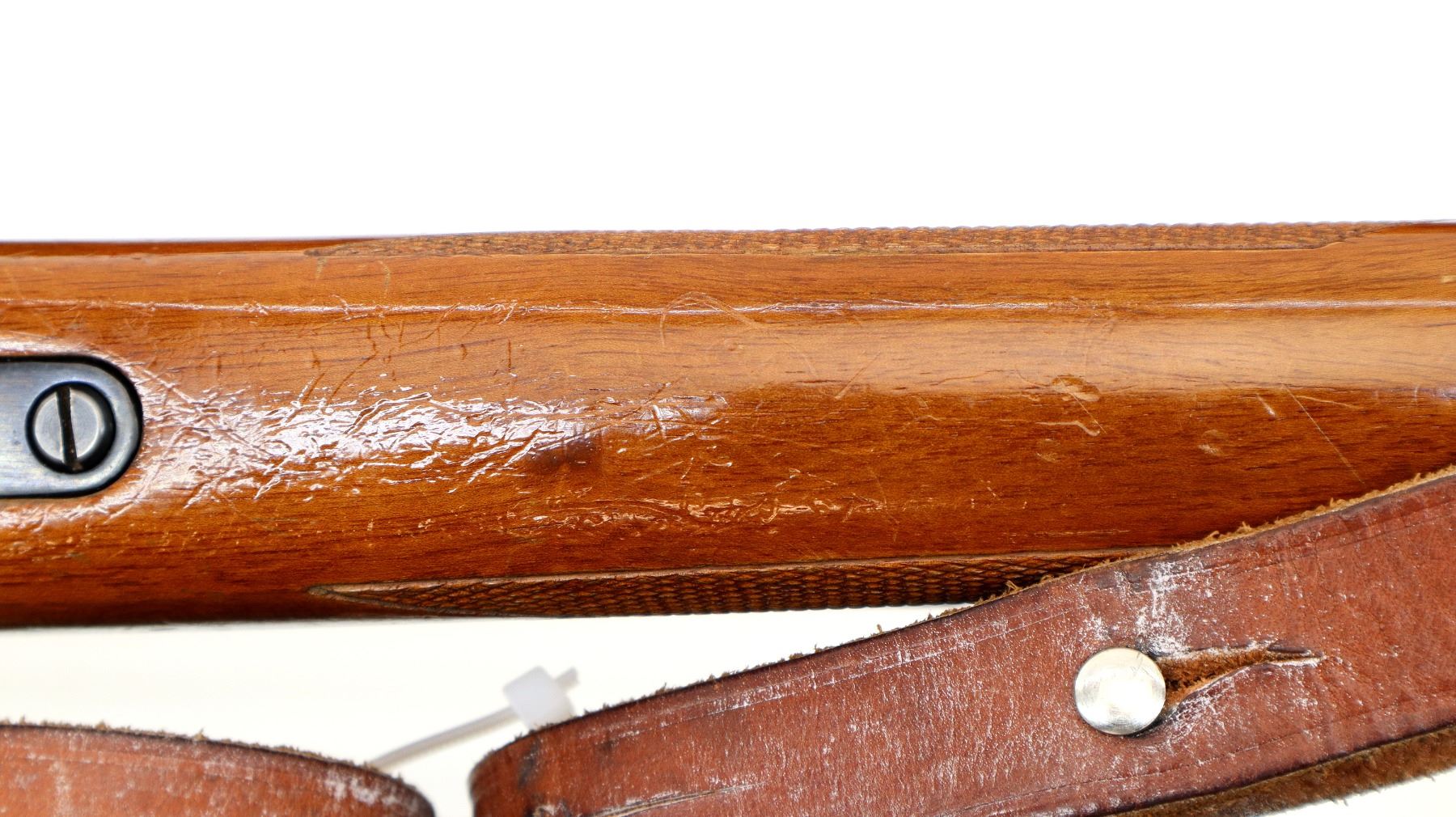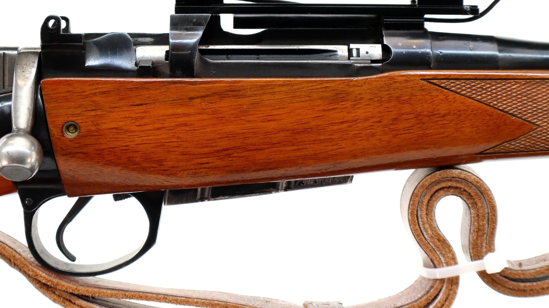 Main Description: Manufactured by Maltby 1944, bolt matches. Blade front sight with ramp, missing rear sight, blued finish, receiver drilled and tapped with Bushnell Sportview 3-9x32 scope installed, clear optics with duplex crosshair. Bolt polished silver. Two piece Monte Carlo wood stocks, checkered forearm, pistol grip and black polymer butt plate, cheek rest, grip cap, sling swivels with brown leather sling. Note: spare bag is rusty.
