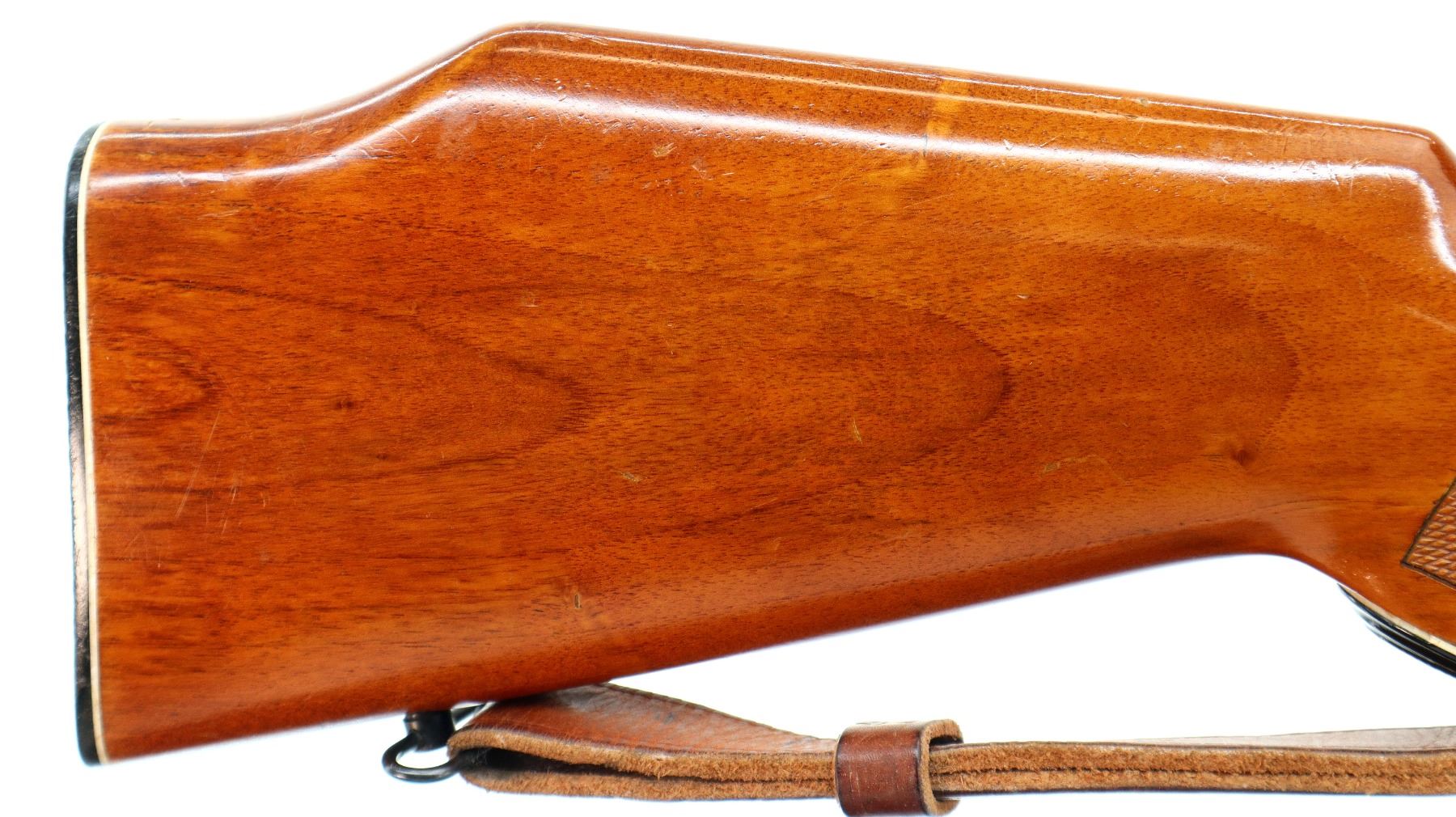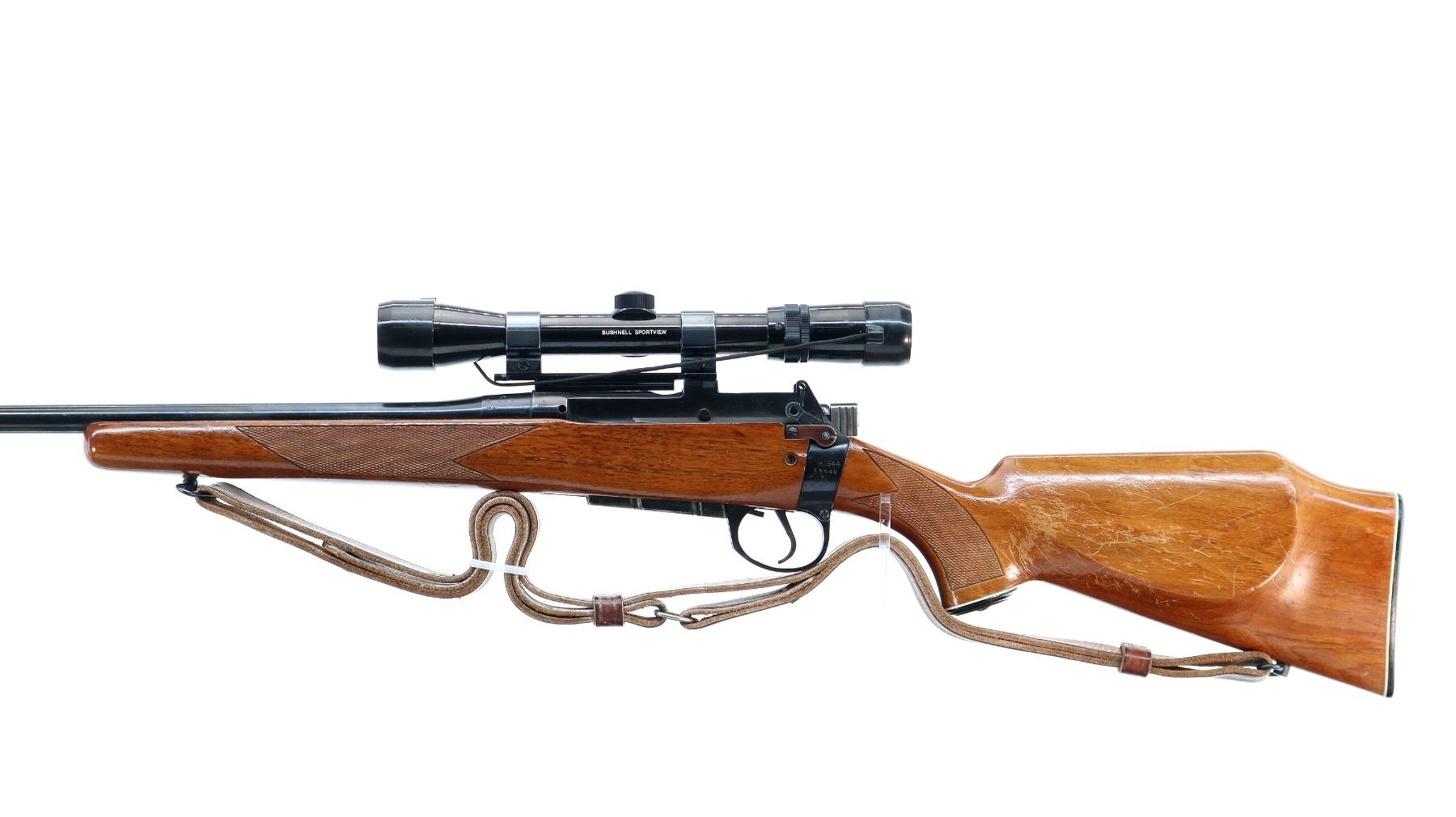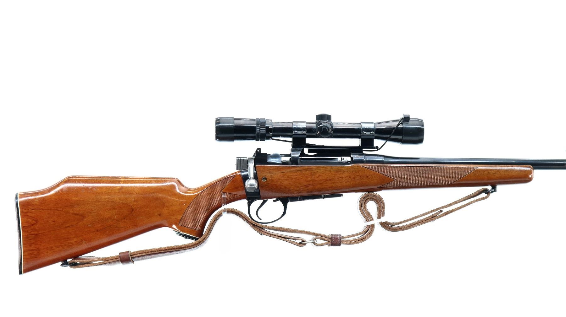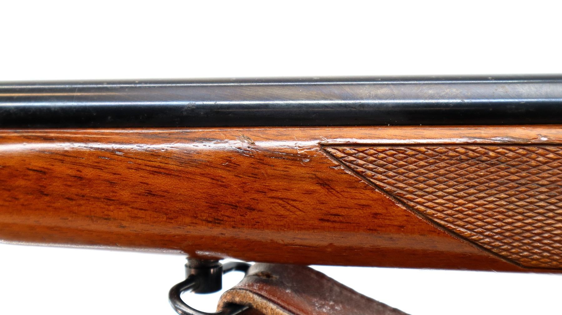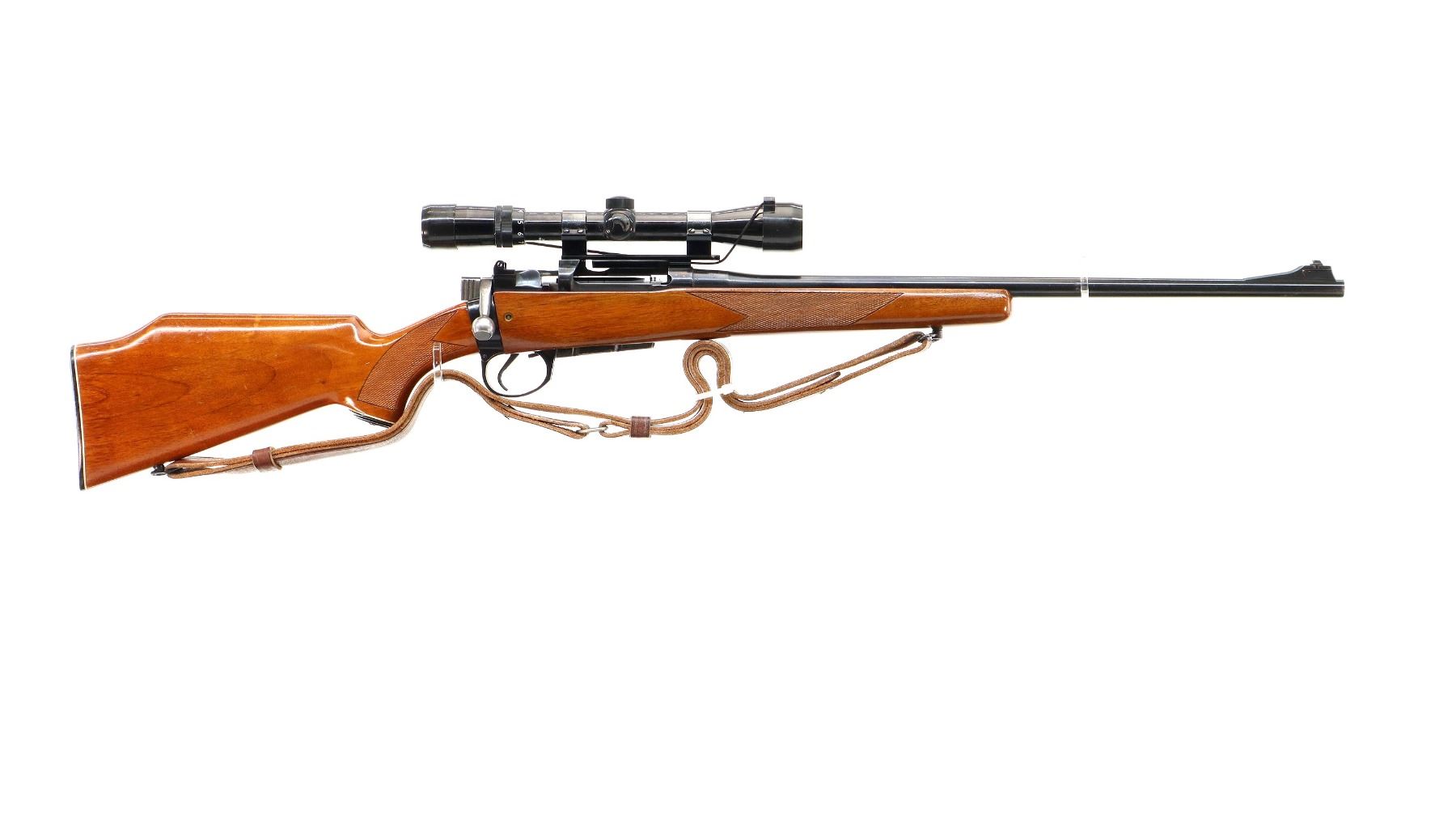 Main Description: Manufactured by Maltby 1944, bolt matches. Blade front sight with ramp, missing rear sight, blued finish, receiver drilled and tapped with Bushnell Sportview 3-9x32 scope installed, clear optics with duplex crosshair. Bolt polished silver. Two piece Monte Carlo wood stocks, checkered forearm, pistol grip and black polymer butt plate, cheek rest, grip cap, sling swivels with brown leather sling. Note: spare bag is rusty.