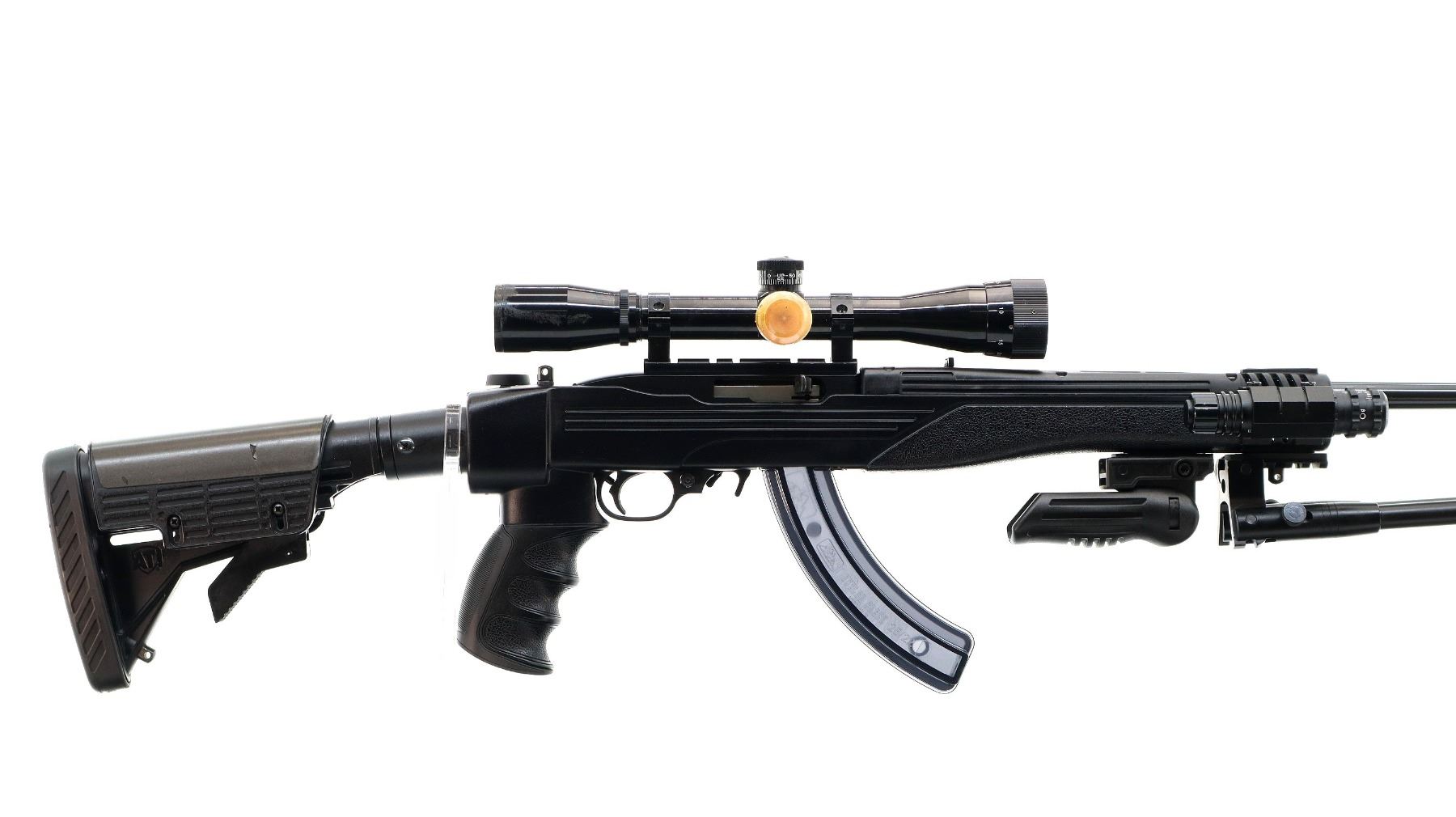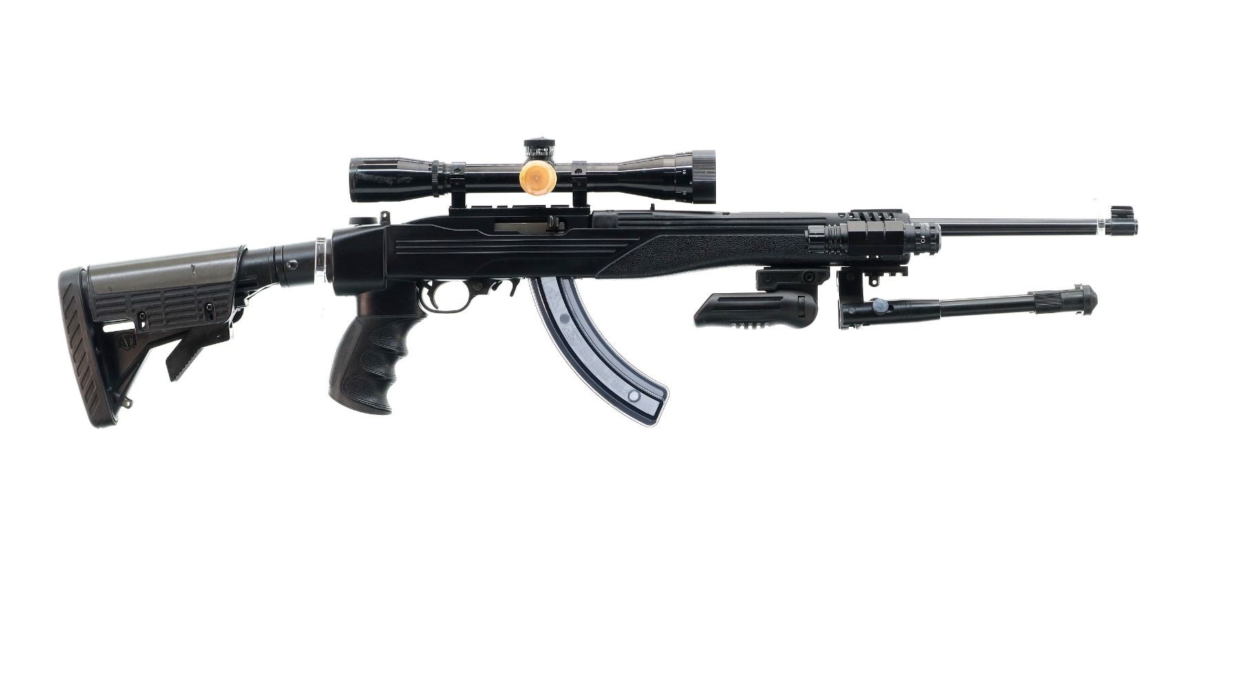 Main Description: Blade front sight with ramp, adjustable folding u notched rear sight, blued barrel, black alloy receiver drilled and tapped with One piece rail and Bushnell Sportview 4x32 AO scope installed, clear optics with duplex crosshair, windage knob has been replaced. Four piece ATI black synthetic stocks, ventilated handguard, textured forearm, finger grooved pistol grip, collapsible and folding butt stock with adjustable cheek rest, black rubber recoil pad, extended mag release, folding front grip and attached bipod, three short rails on forend, right side has a laser installed (not tested), swivel studs.
