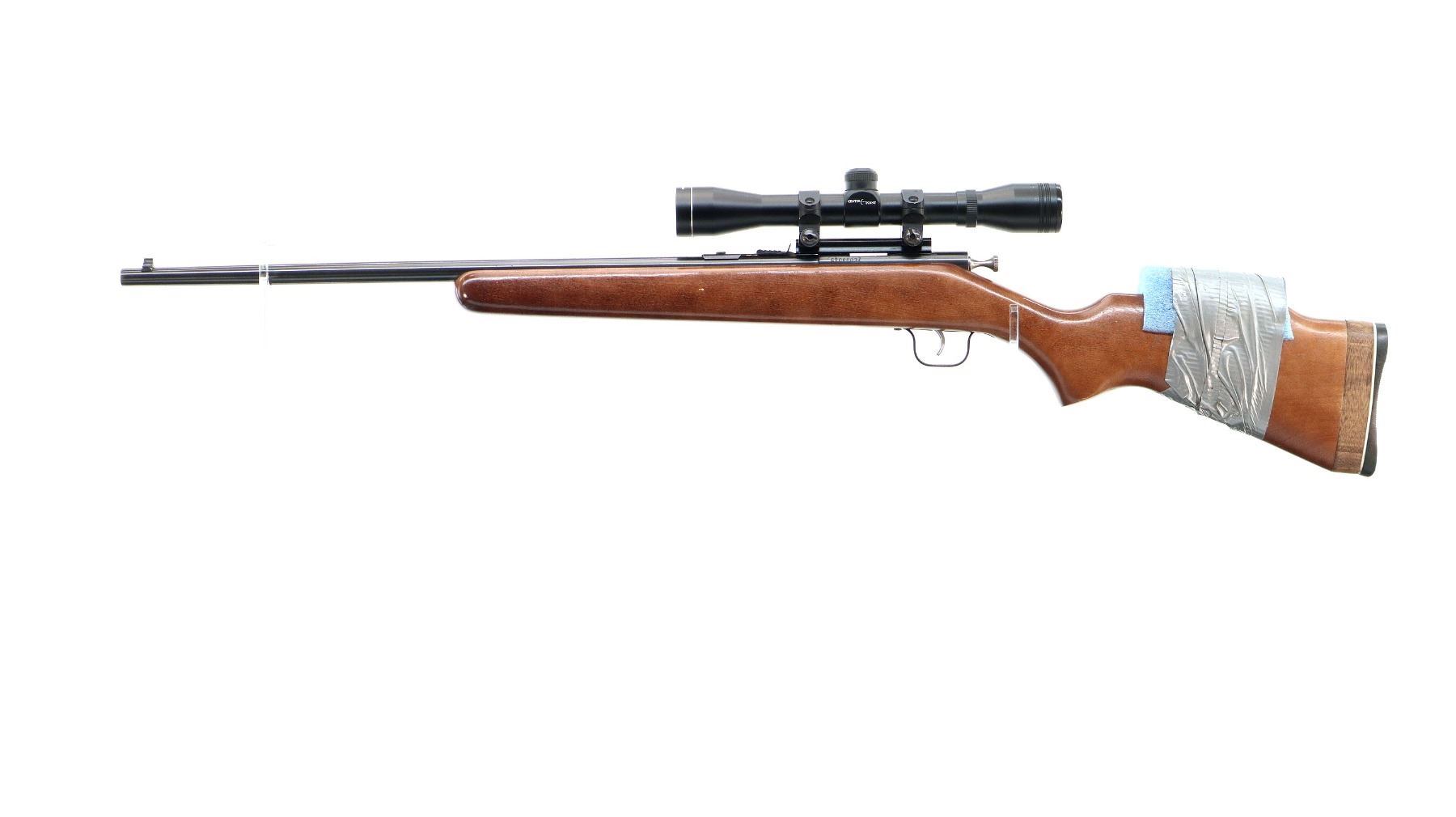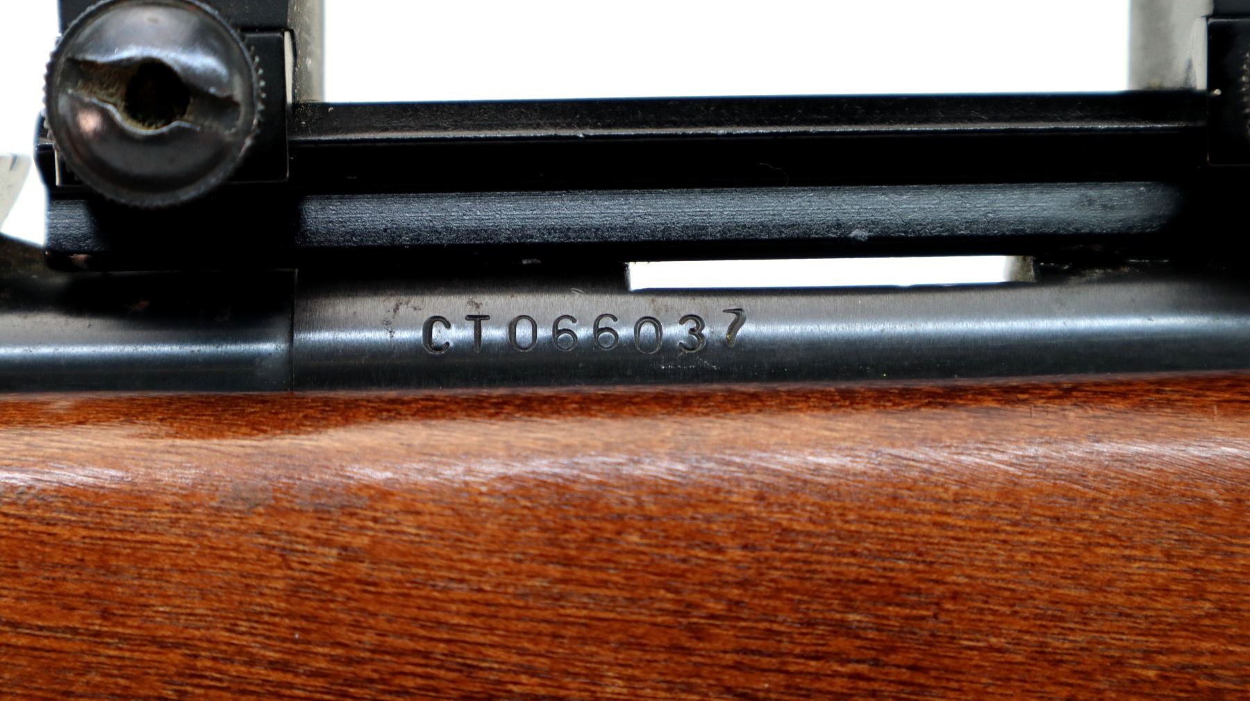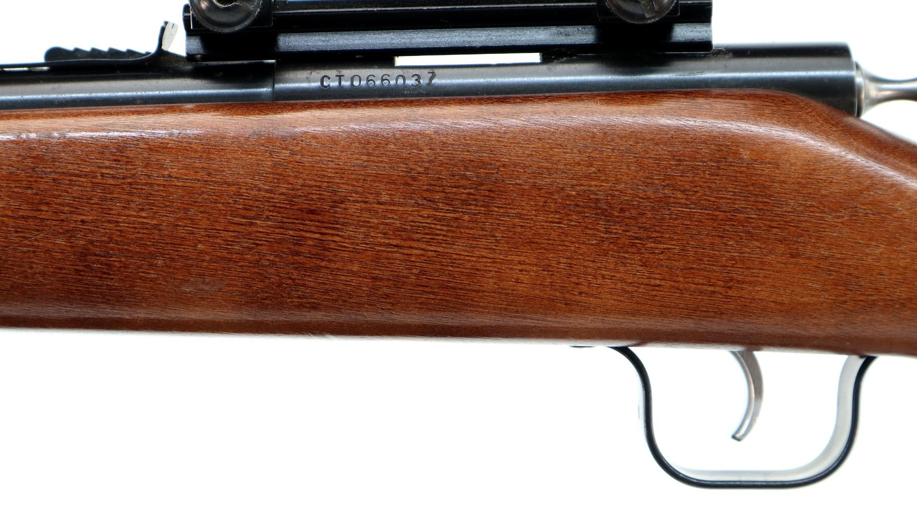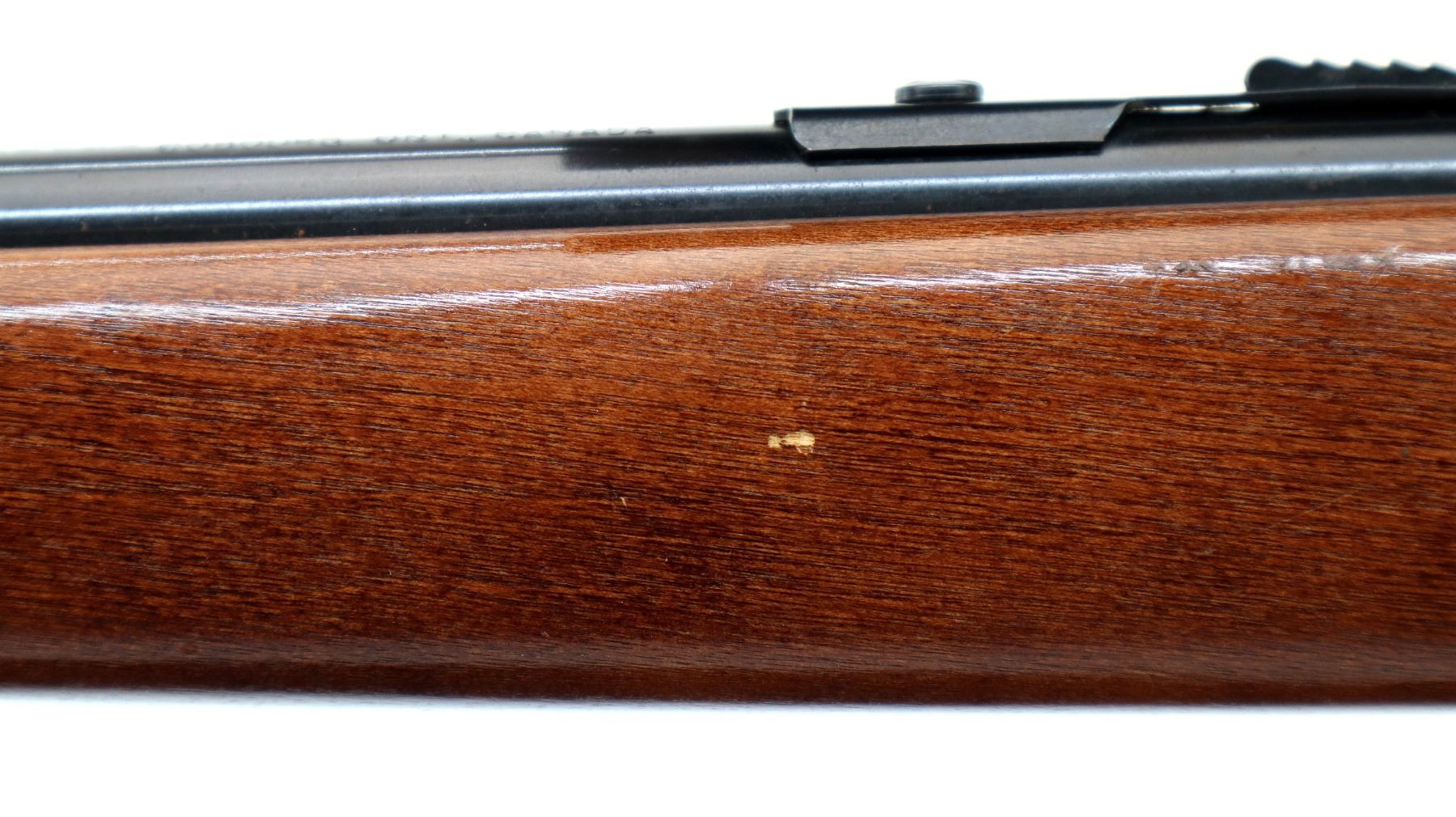 Main Description: Blade front sight, adjustable u notched rear sight, blued finish, receiver drilled and tapped with Center Point 4x32 scope installed, clear optics with duplex crosshair. Grooved bolt knob, extractor is present. One piece wood stock, pistol grip, grooved black polymer butt plate with wood spacer, 13" LOP, custom foam cheek rest.