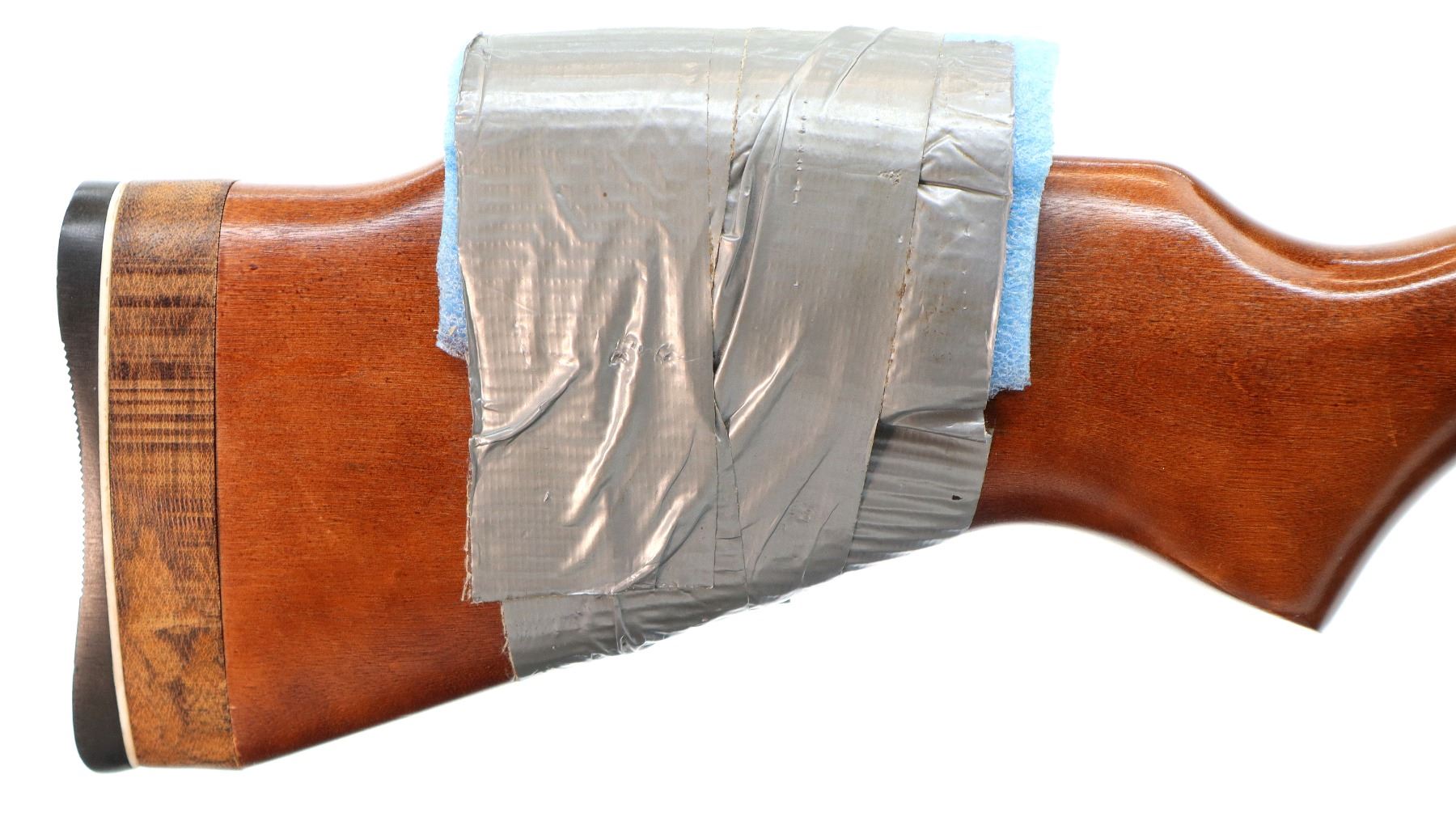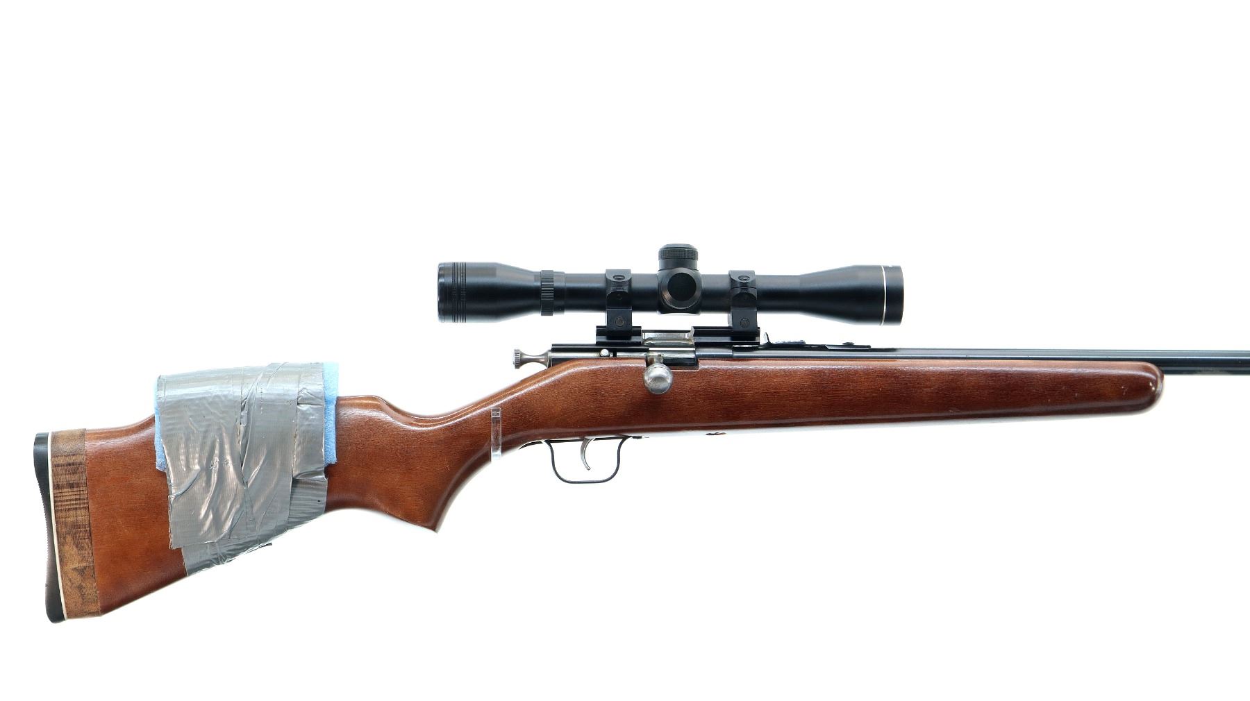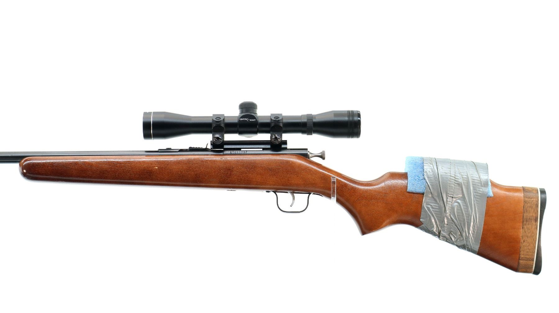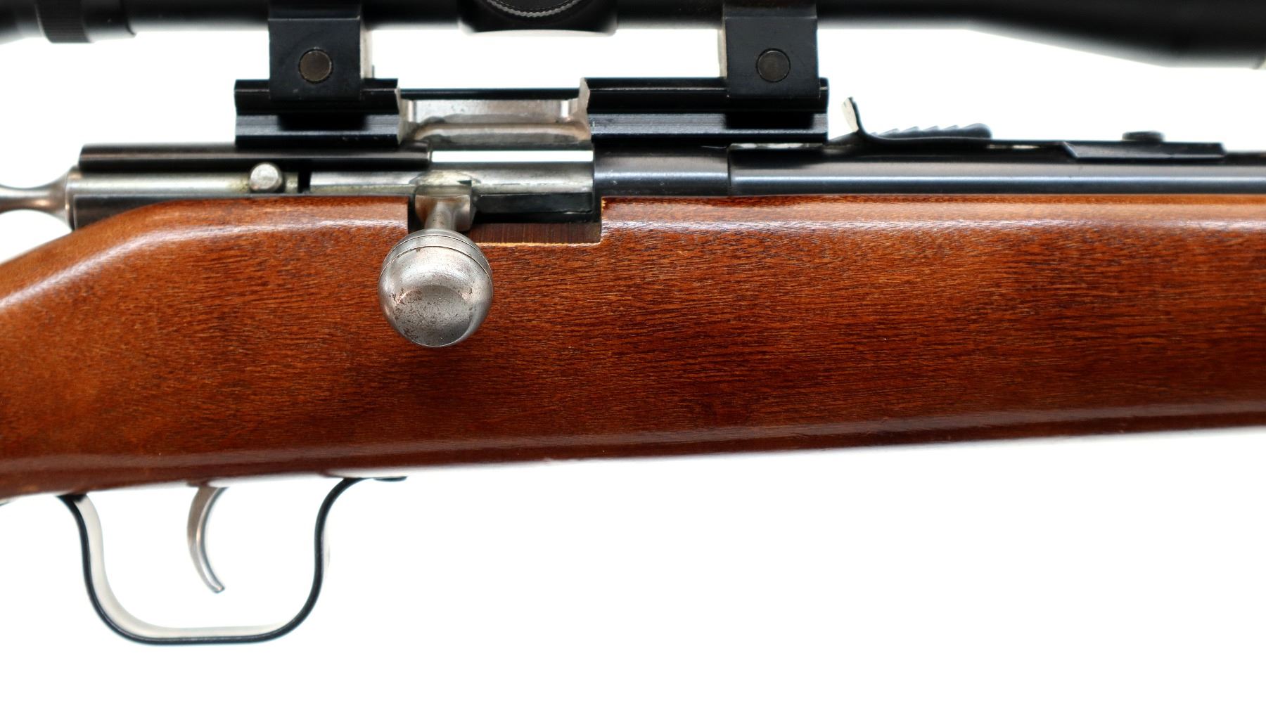 Main Description: Blade front sight, adjustable u notched rear sight, blued finish, receiver drilled and tapped with Center Point 4x32 scope installed, clear optics with duplex crosshair. Grooved bolt knob, extractor is present. One piece wood stock, pistol grip, grooved black polymer butt plate with wood spacer, 13" LOP, custom foam cheek rest.