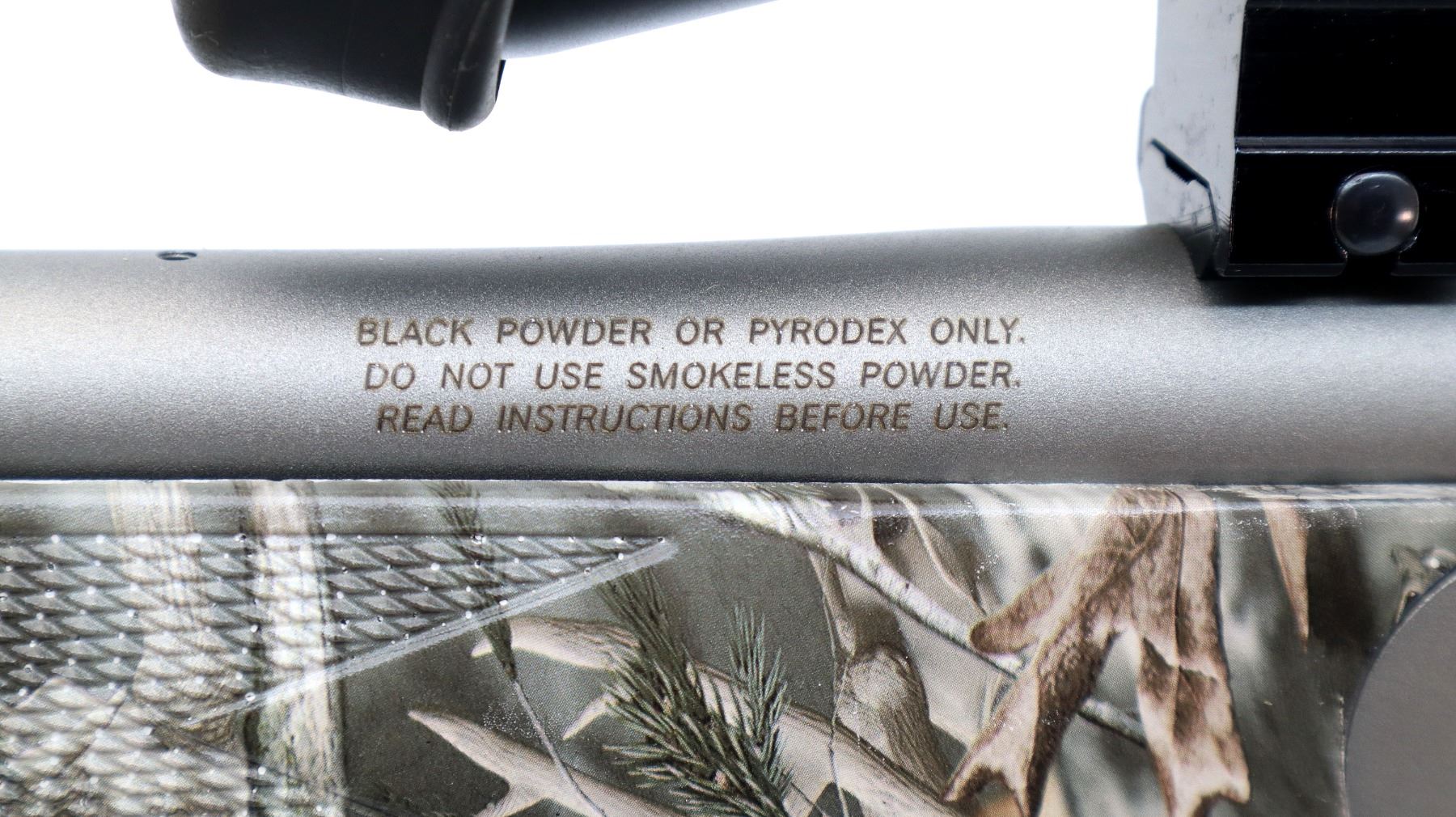 Main Description: No sights, threaded holes present, stainless fluted barrel drilled and tapped with Cabela's XT 1.5-5x32 scope installed, clear optics with duplex crosshair. Grooved spur hammer and extension, uses 209 primers. Two piece Reaper Camo synthetic stocks, checkered forearm and pistol grip, raised comb, black rubber recoil pad, grip cap, swivel studs, black alloy ramrod.