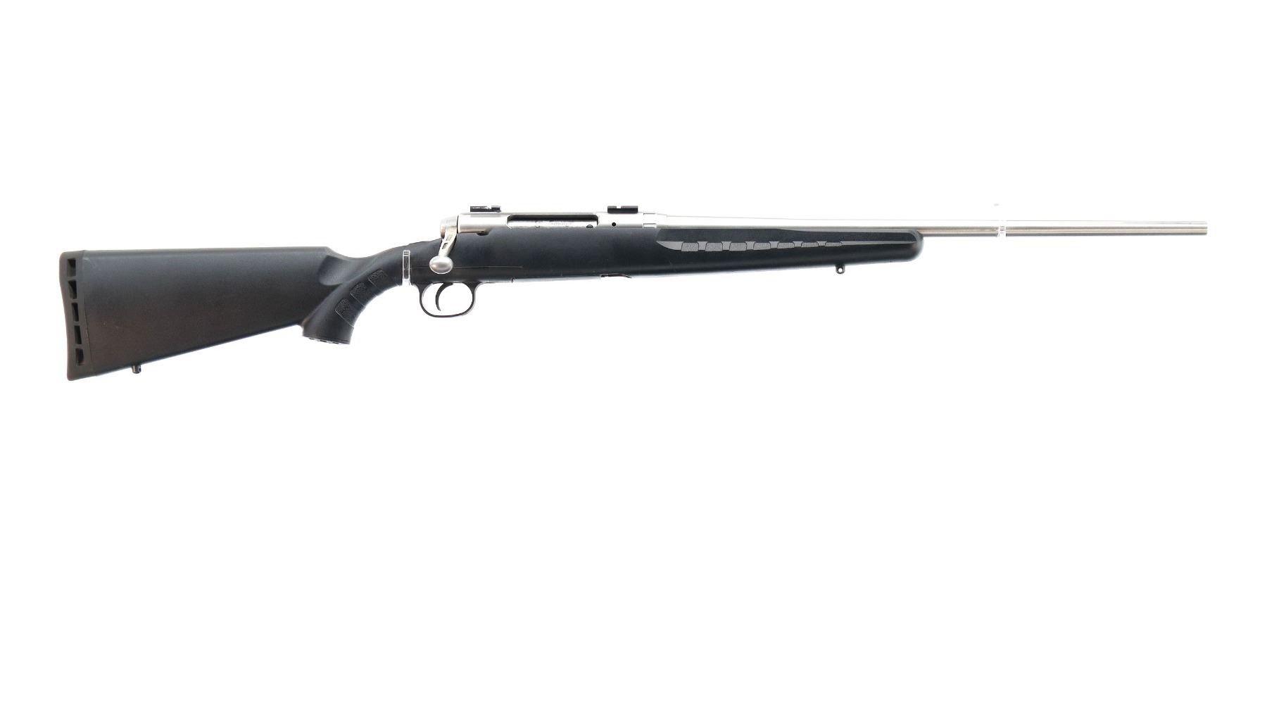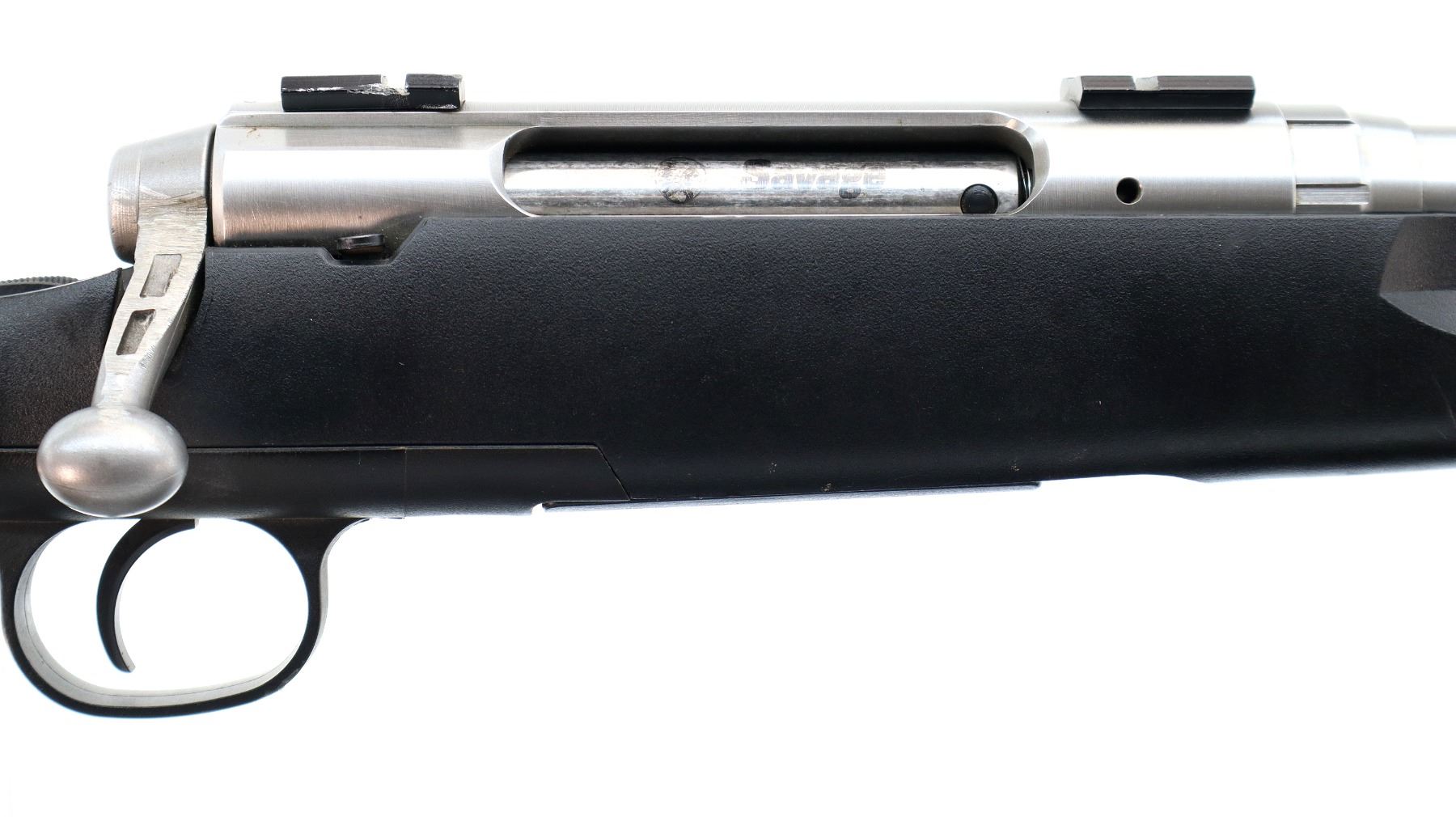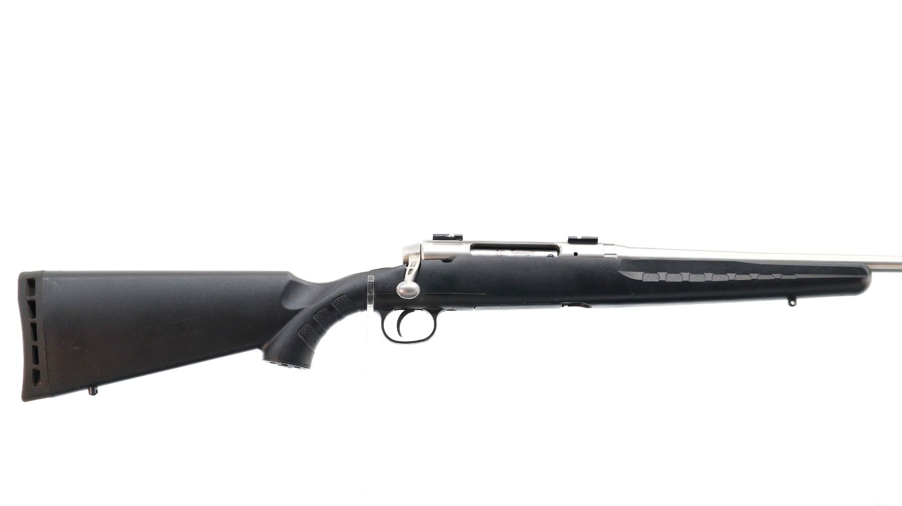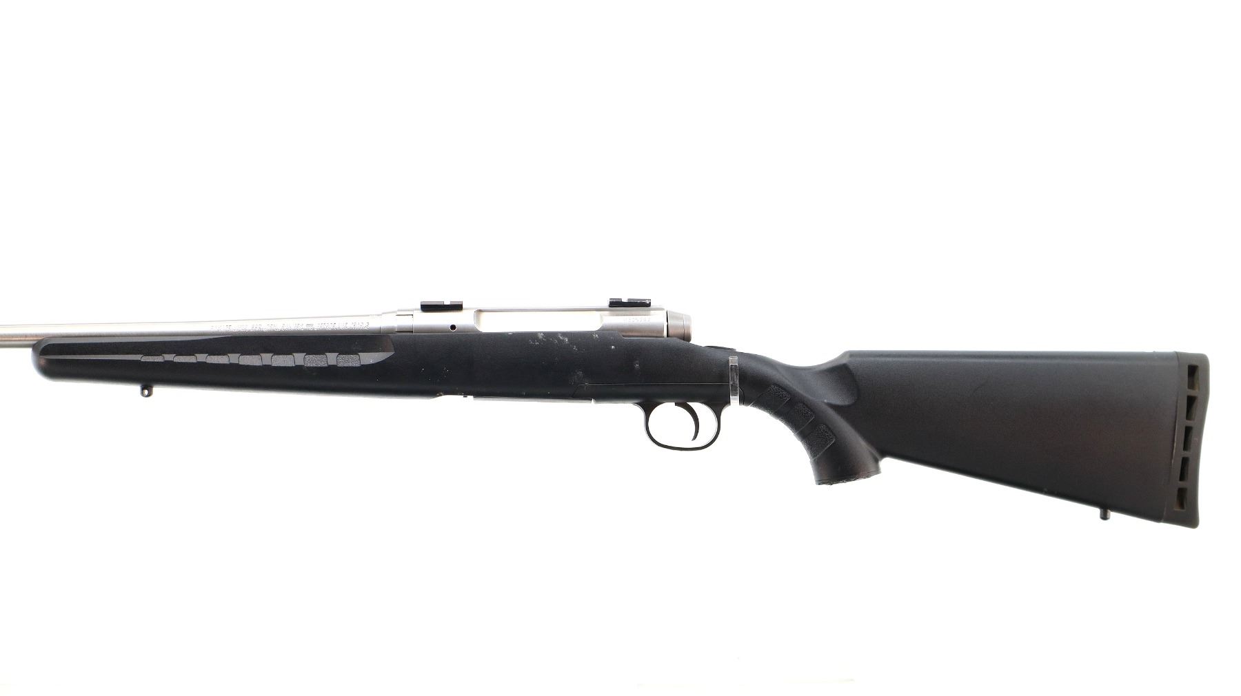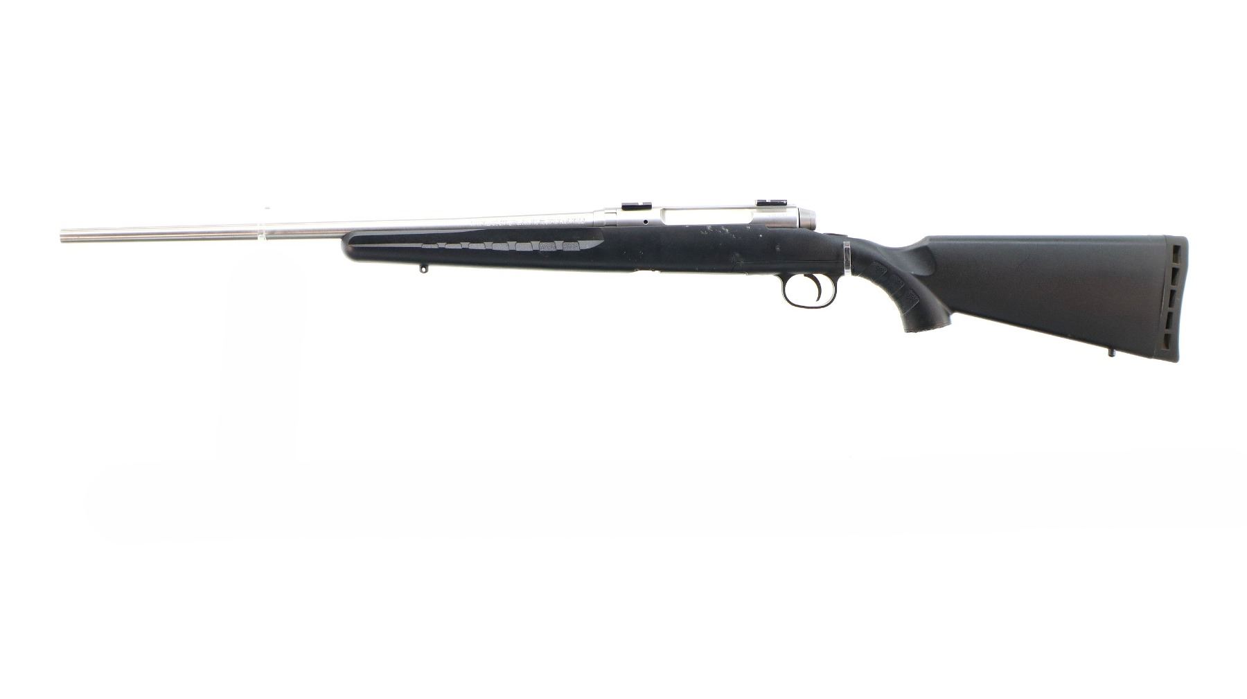 Main Description: No sights, stainless finish, receiver drilled and tapped with two piece scope bases installed, bolt handle has been modified trigger mech/firing pin may require adjustment, parts or repair (light strike), tang safety. One piece black synthetic stock, textured forearm and pistol grip panels, black vented rubber recoil pad, grip cap, non accu trigger, swivel studs.