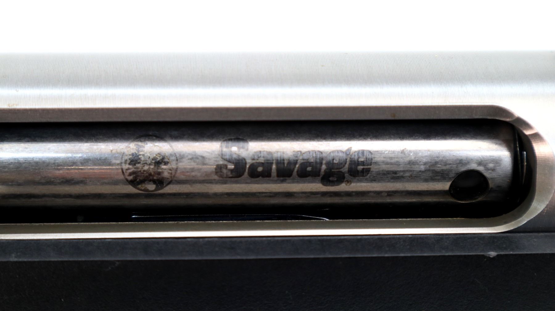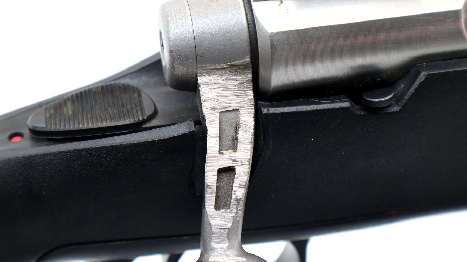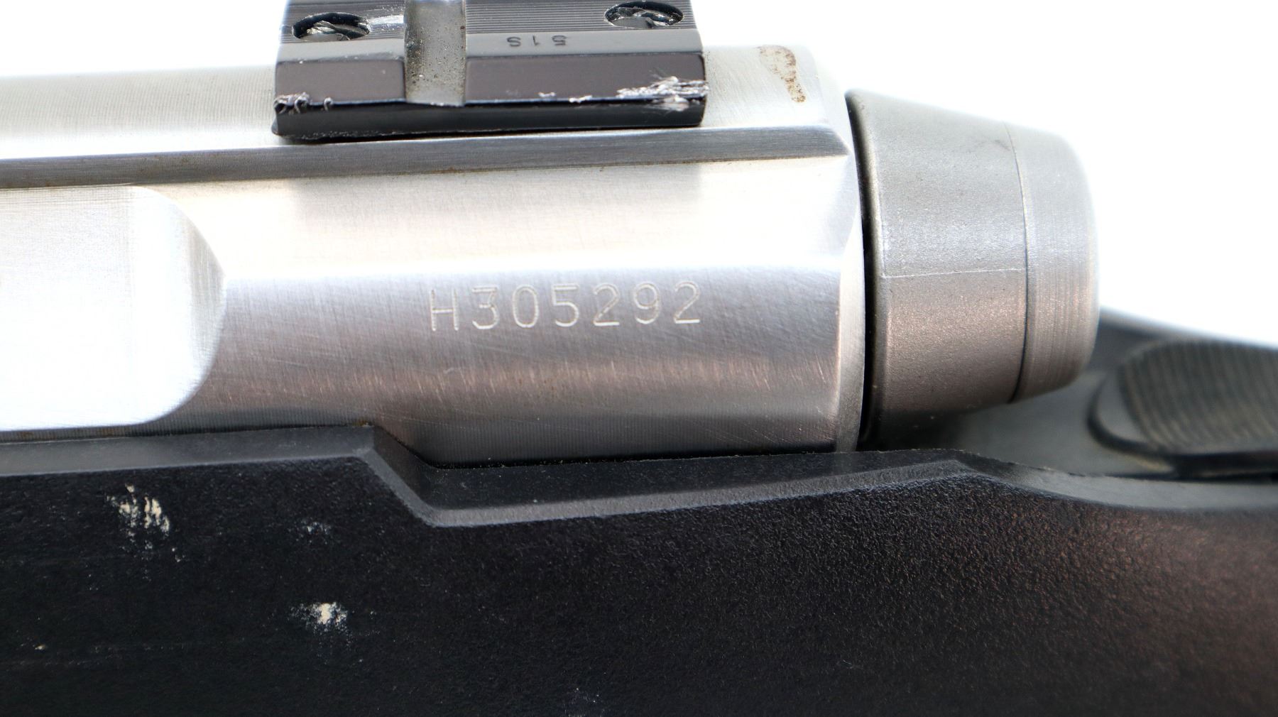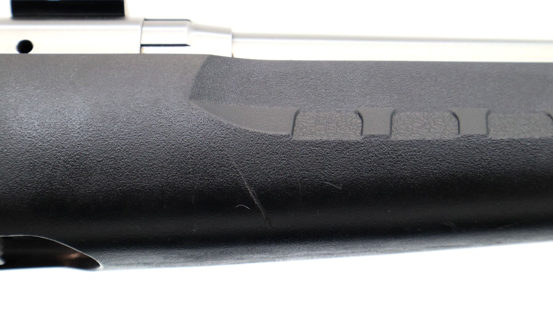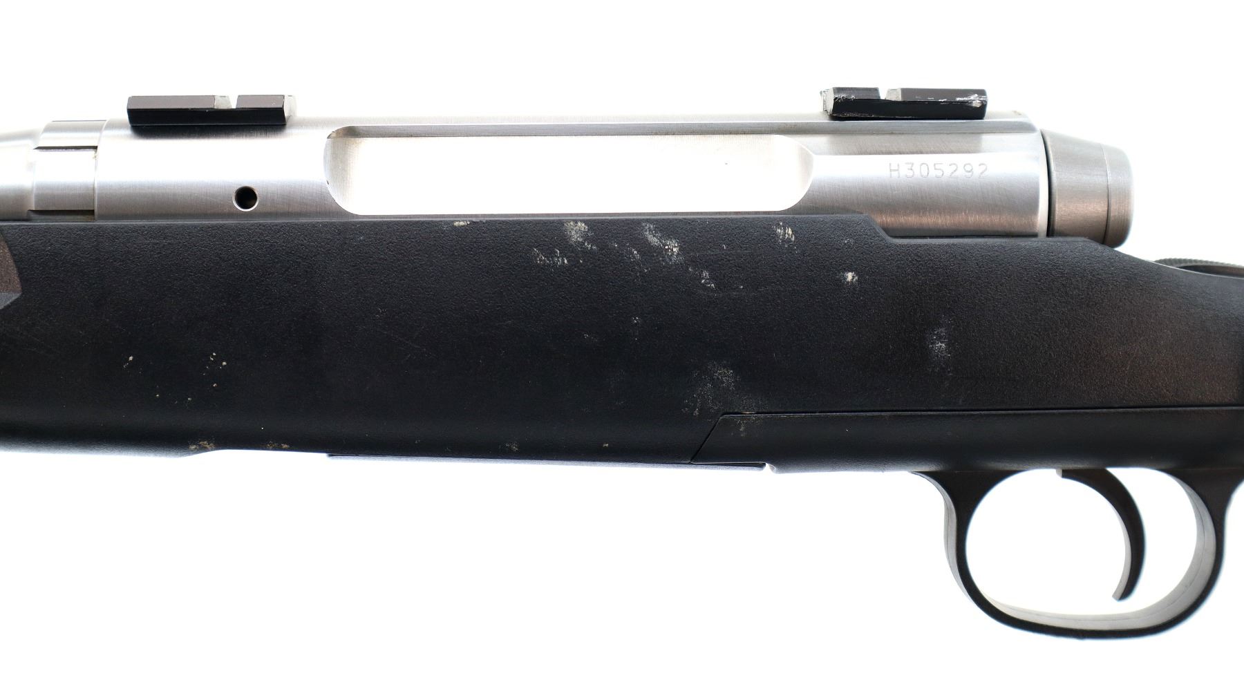 Main Description: No sights, stainless finish, receiver drilled and tapped with two piece scope bases installed, bolt handle has been modified trigger mech/firing pin may require adjustment, parts or repair (light strike), tang safety. One piece black synthetic stock, textured forearm and pistol grip panels, black vented rubber recoil pad, grip cap, non accu trigger, swivel studs.