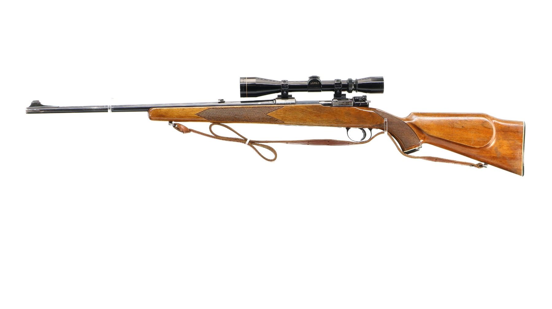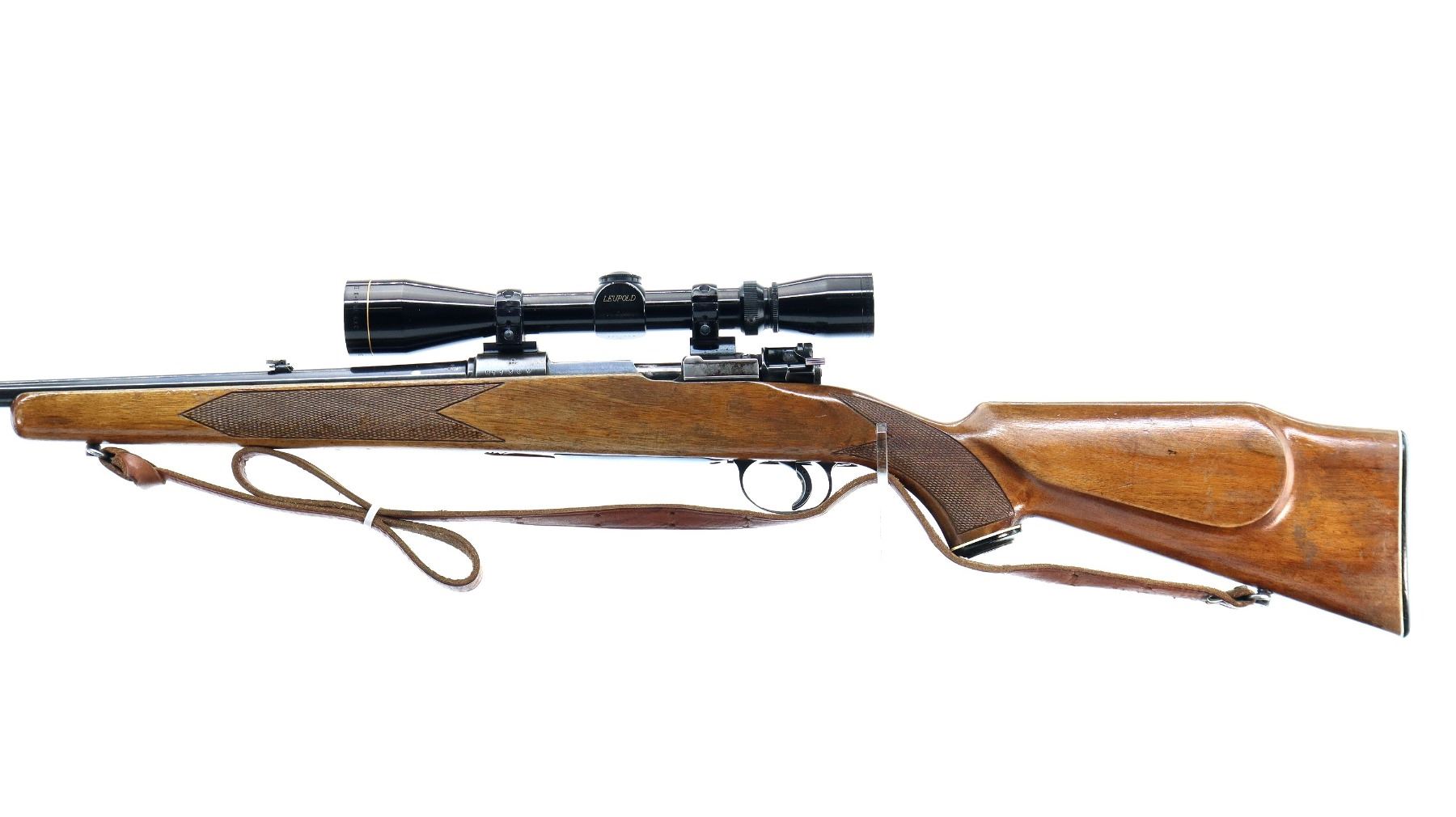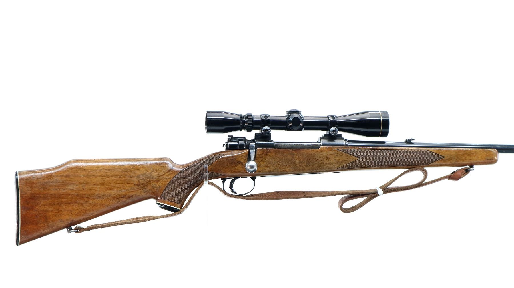 Main Description: Blade front sight with ramp, adjustable folding u notched rear sight, blued finish, receiver drilled and tapped with Leupold Vari X II 3-9x40 scope installed, clear optics with duplex crosshair. One piece wood stock, checkered forearm, pistol grip and black polymer butt plate, cheek rest, grip cap, sling swivels with brown leather sling