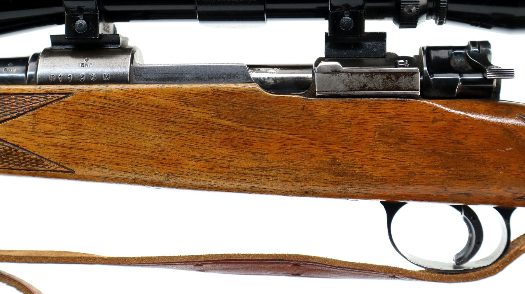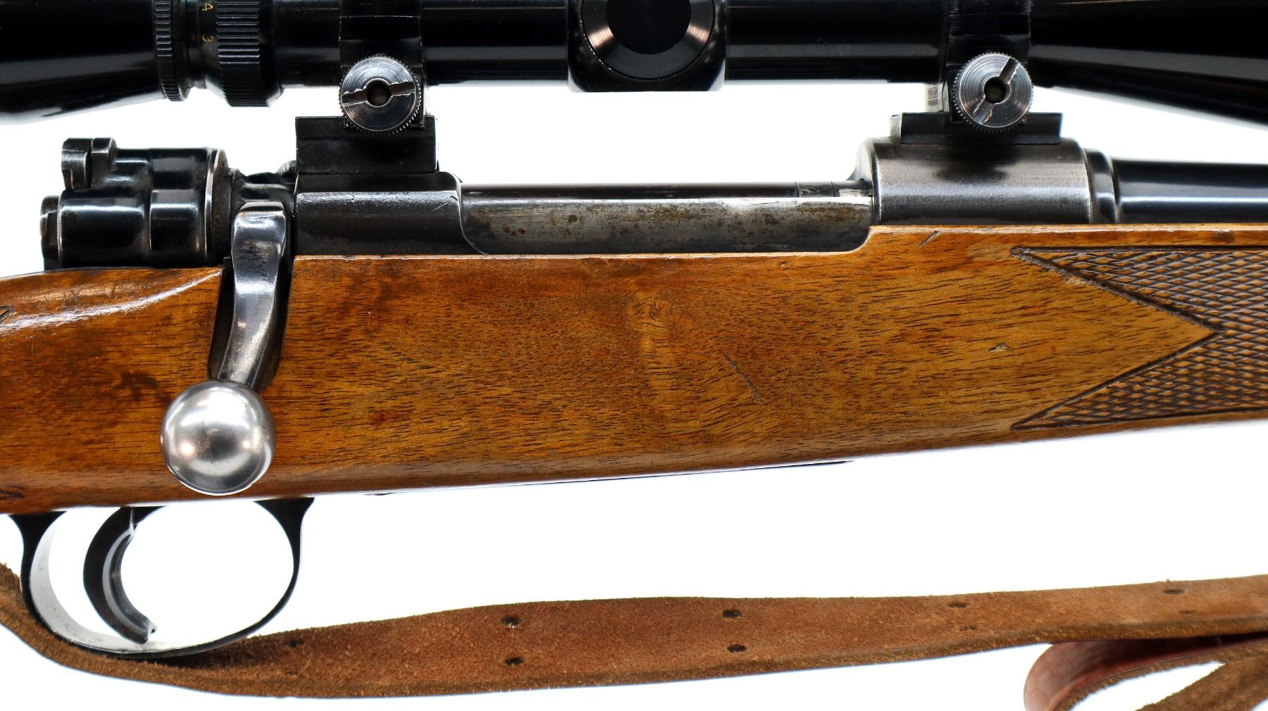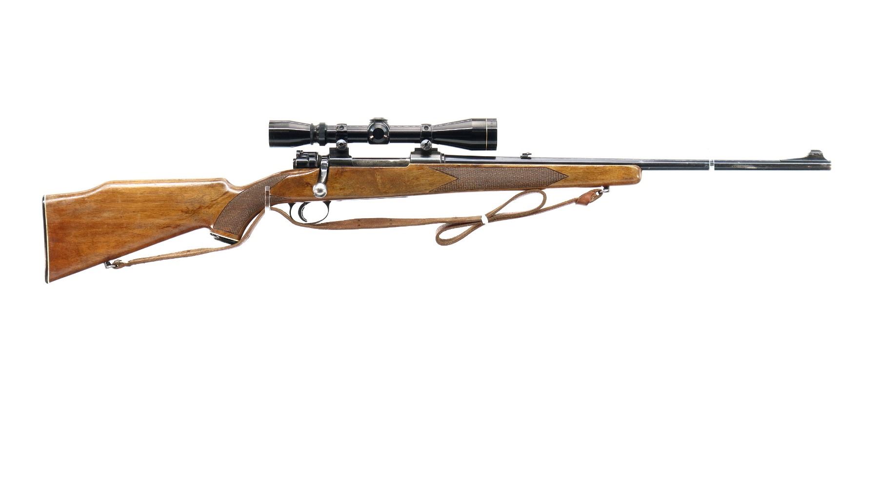 Main Description: Blade front sight with ramp, adjustable folding u notched rear sight, blued finish, receiver drilled and tapped with Leupold Vari X II 3-9x40 scope installed, clear optics with duplex crosshair. One piece wood stock, checkered forearm, pistol grip and black polymer butt plate, cheek rest, grip cap, sling swivels with brown leather sling