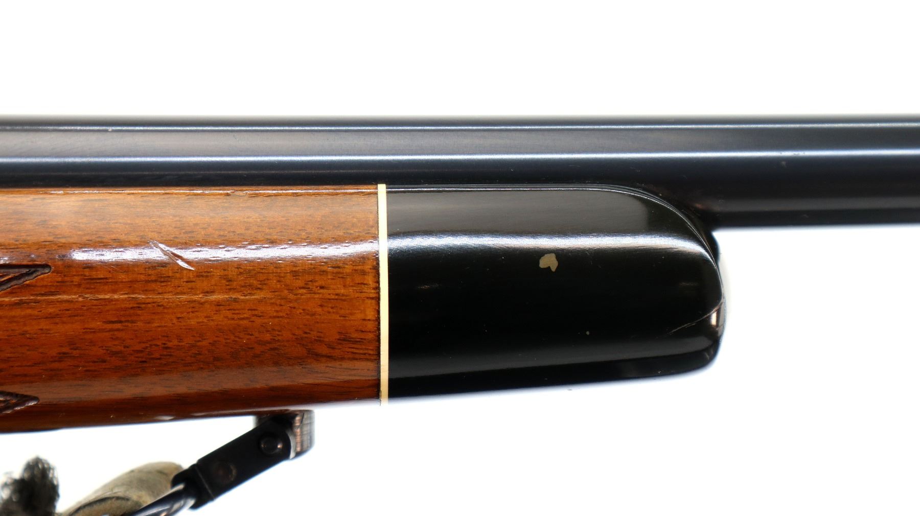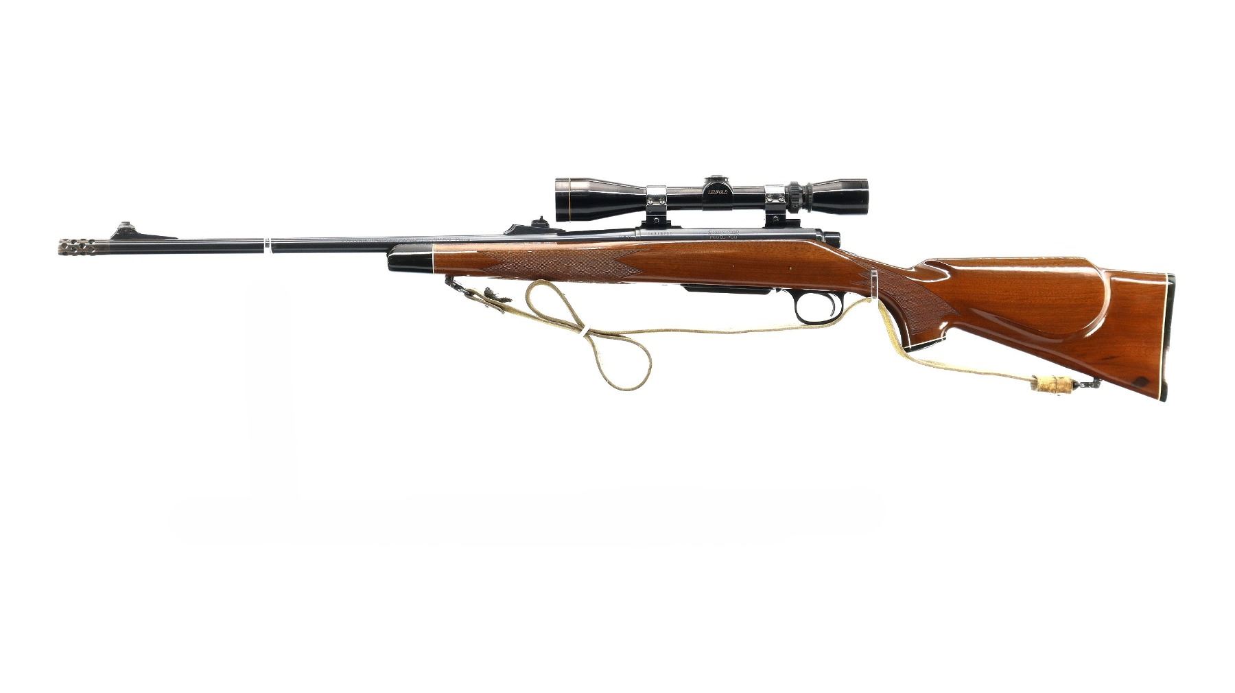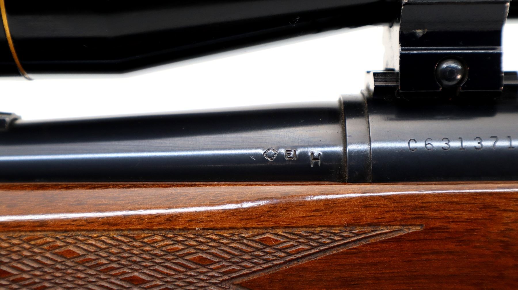 Main Description: Blade front sight with ramp, adjustable u notched rear sight, blued finish, threaded muzzle with ported brake installed, receiver drilled and tapped with Leupold Vari X II 3-9x40 scope installed, clear optics with duplex crosshair. Jeweled bolt with checkered knob. One piece wood stock, black polymer forend and pistol grip caps, checkered forearm, pistol grip and black polymer butt plate. Cheek rest, grip cap, sling swivels with tan leather sling.